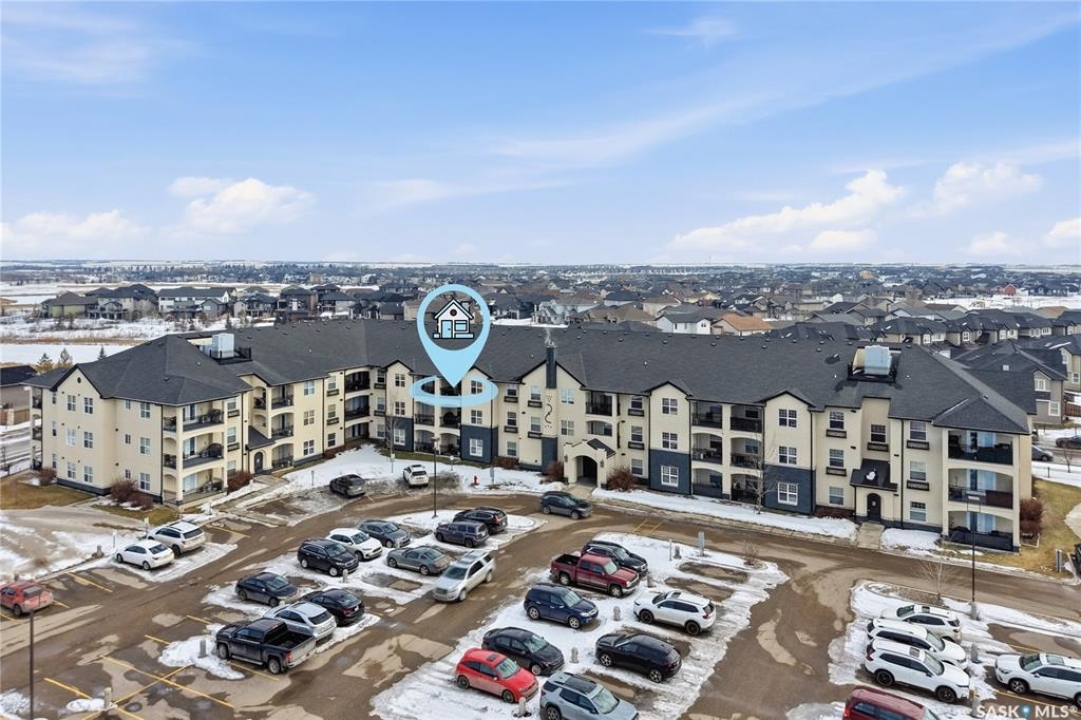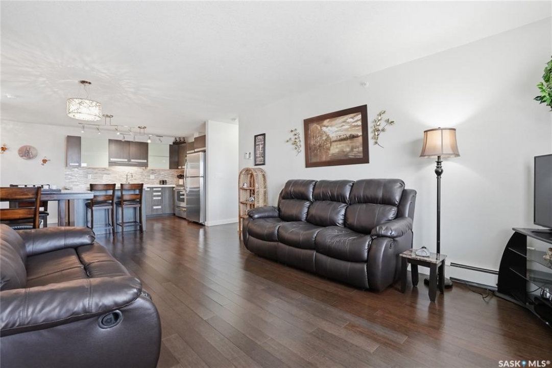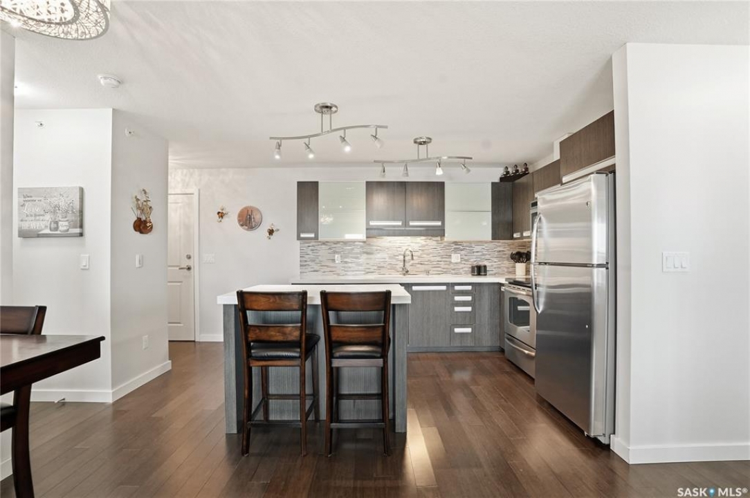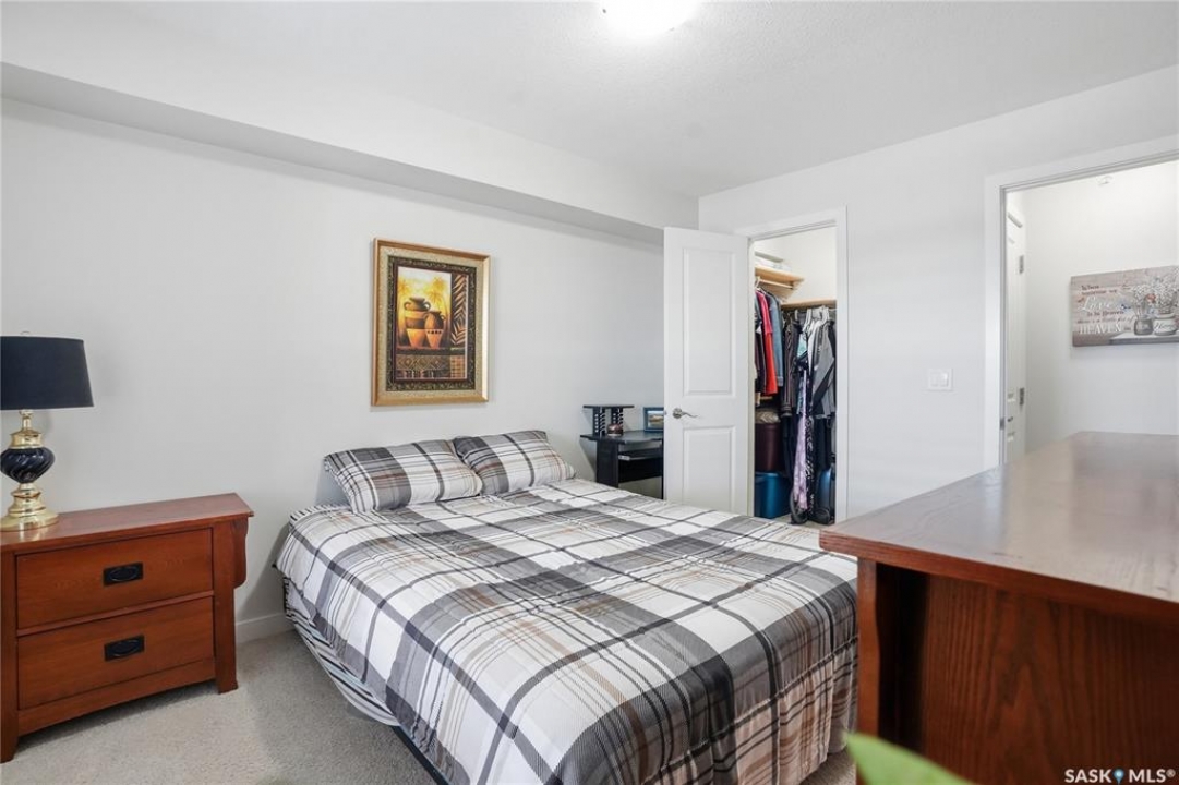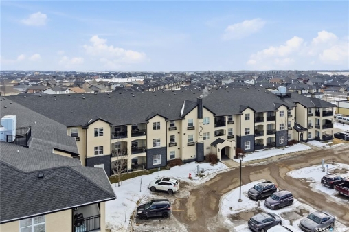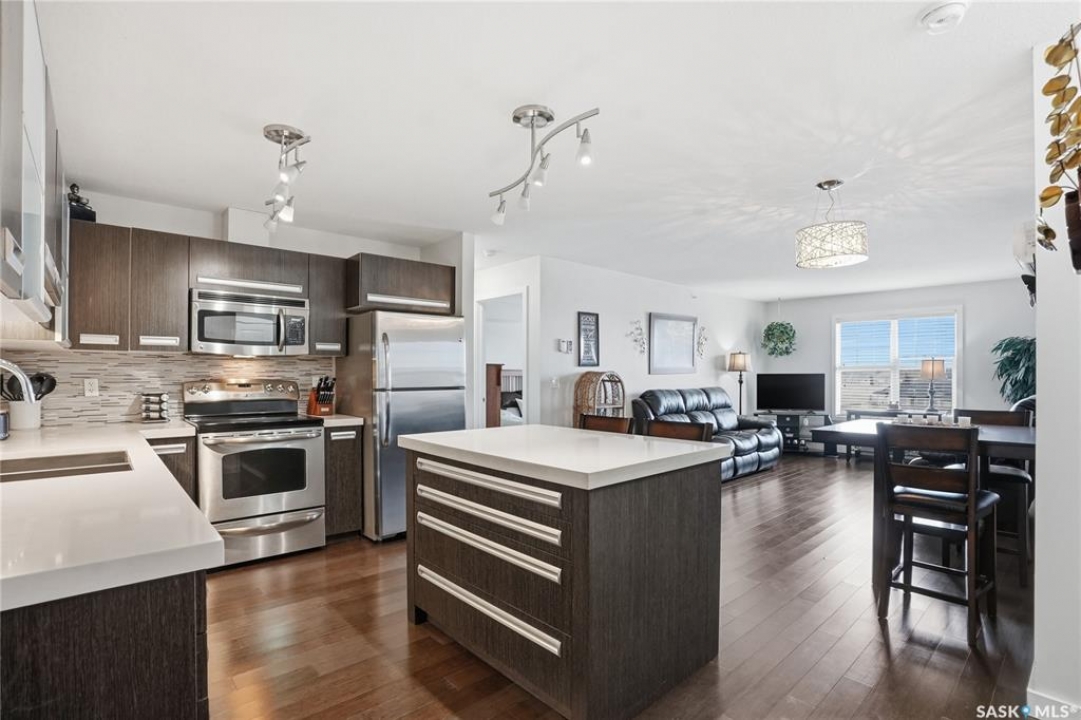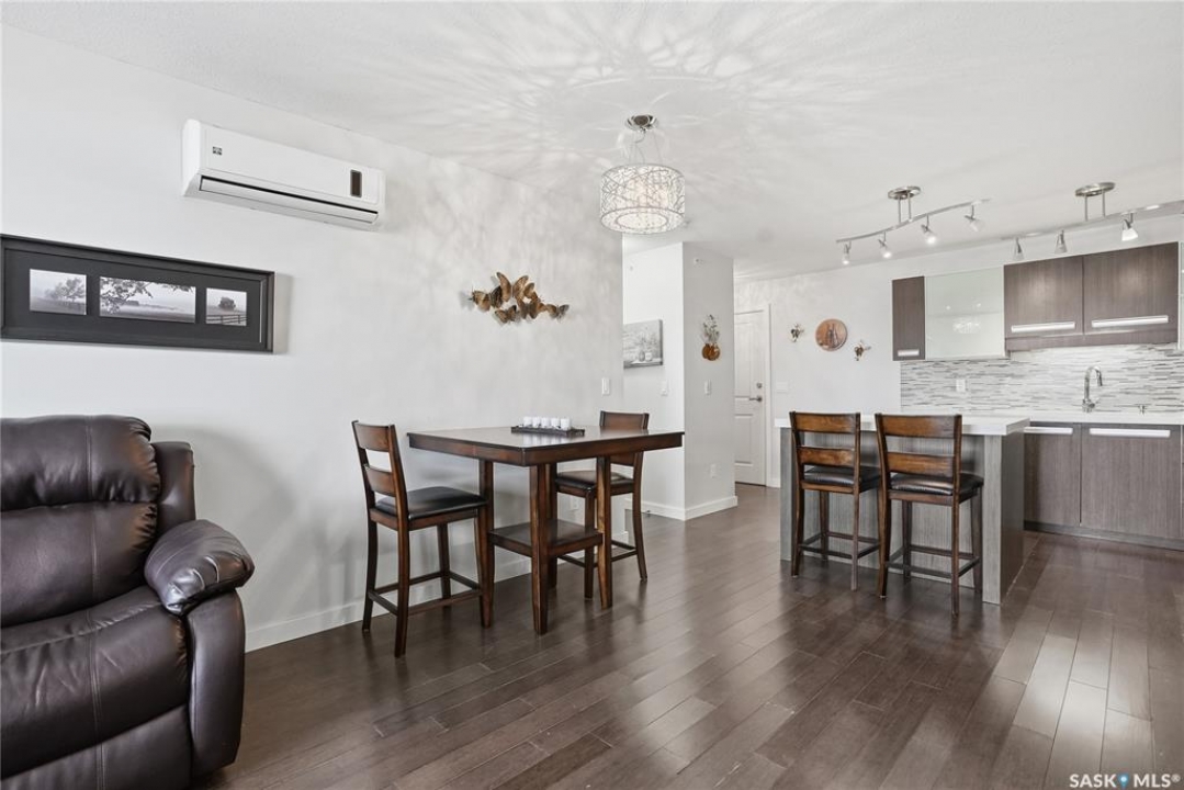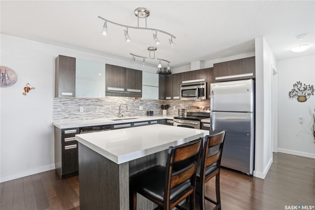Top-floor, modern 2-bedroom condo at Rosewood Pointe with 2 electrified parking stalls! Trendy split-bedroom layout with open concept living/dining/kitchen areas finished with bamboo flooring. Modern kitchen cabinetry with quartz countertops, stainless steel appliances & island eating bar. Both bedrooms offer generously-sized walk-in closets & ample space. In-suite amenities include wall-mount air conditioning, in-unit laundry with storage space, full 4-piece bathroom both with tile flooring. Large balcony with wonderful sunset views & plenty of space for a BBQ. 2 surface parking stalls included. Building amenities include elevator, intercom access, visitor parking. Condo fees include heat, water, sewer & garbage. Excellent Rosewood location with easy access to Circle Drive & close proximity to Hyde Park, restaurants, shopping & many more amenities. Come see it for yourself!