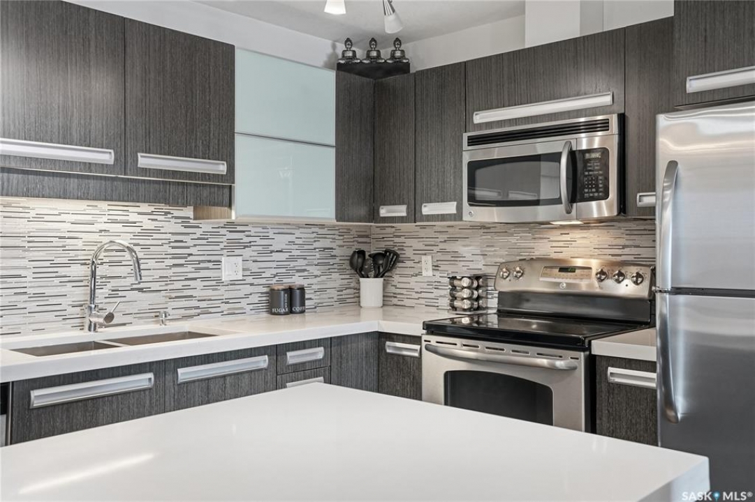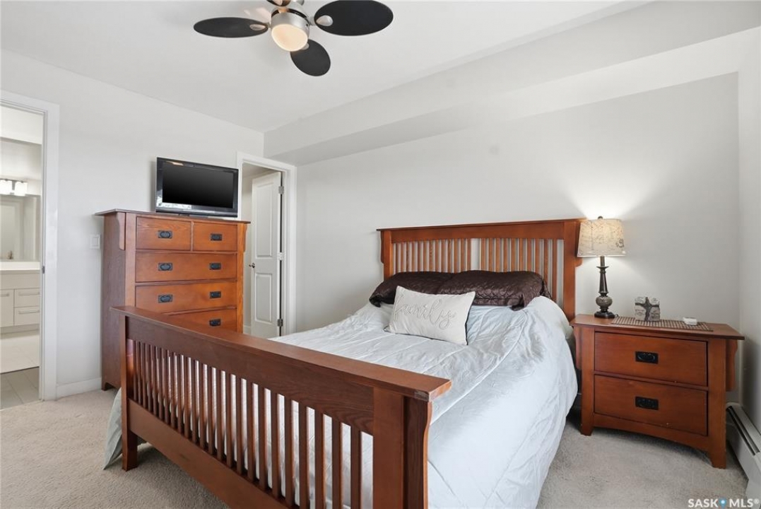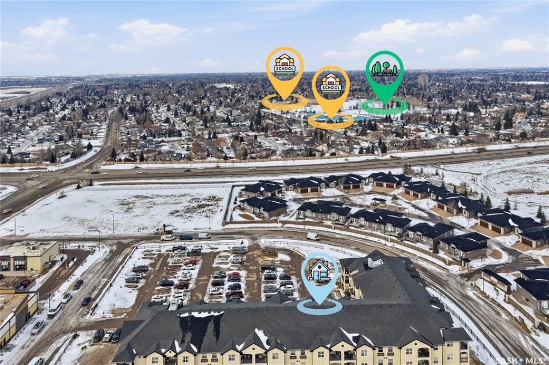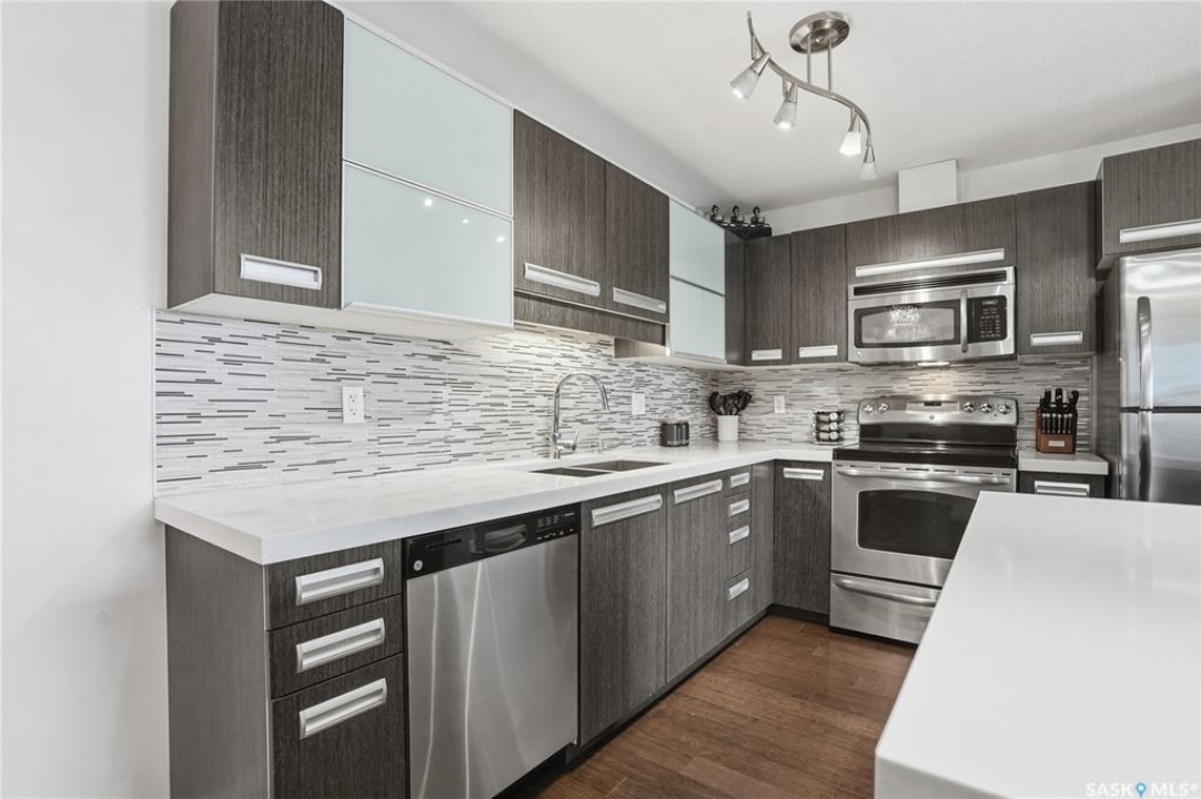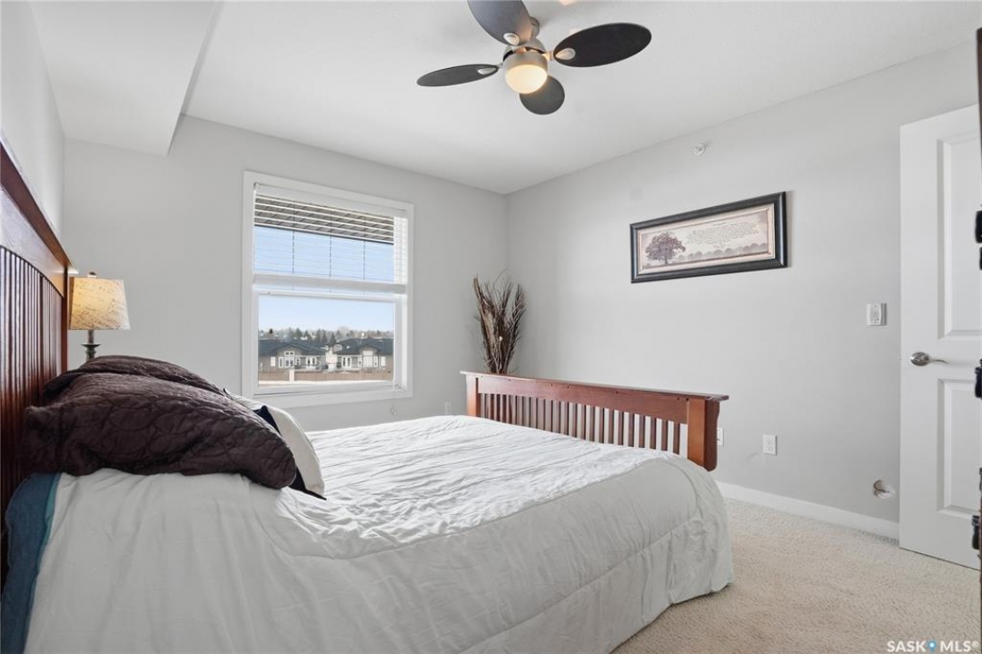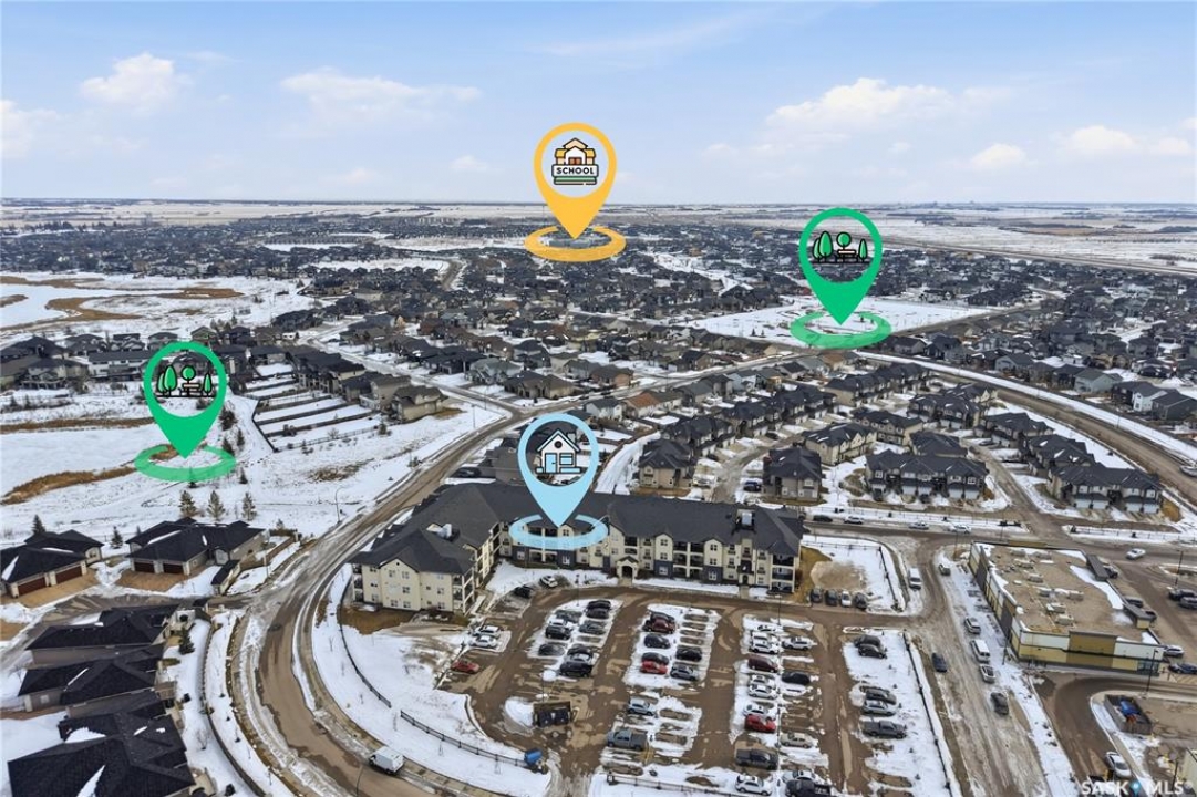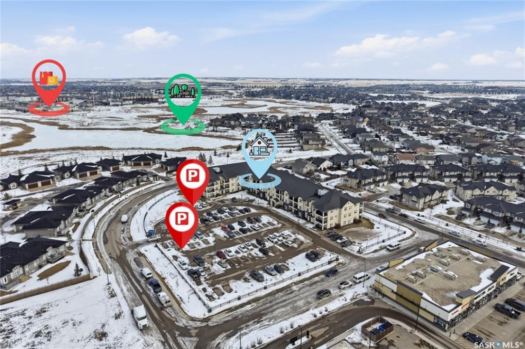Top-floor, modern 2-bedroom condo at Rosewood Pointe with 2 electrified parking stalls! Trendy split-bedroom layout with open concept living/dining/kitchen areas finished with bamboo flooring. Modern kitchen cabinetry with quartz countertops, stainless steel appliances & island eating bar. Both bedrooms offer generously-sized walk-in closets & ample space. In-suite amenities include wall-mount air conditioning, in-unit laundry with storage space, full 4-piece bathroom both with tile flooring. Large balcony with wonderful sunset views & plenty of space for a BBQ. 2 surface parking stalls included. Building amenities include elevator, intercom access, visitor parking. Condo fees include heat, water, sewer & garbage. Excellent Rosewood location with easy access to Circle Drive & close proximity to Hyde Park, restaurants, shopping & many more amenities. Come see it for yourself!