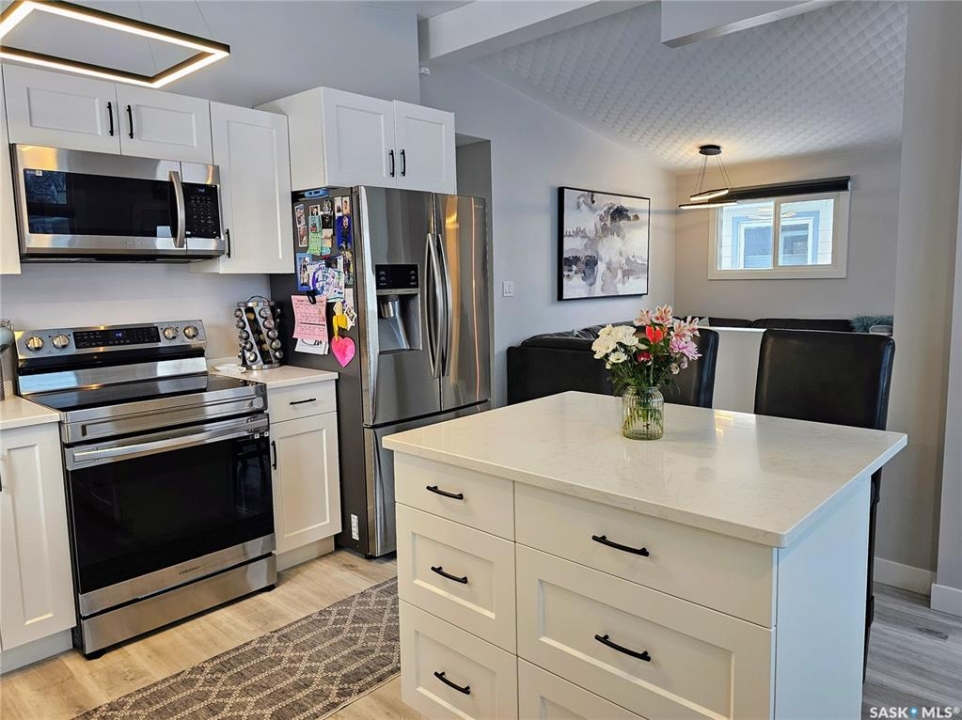 25 King Crescent in Humboldt offers the space, updates, and layout buyers are looking for. Renovations and exterior improvements have already been completed, giving this home a fresh, modern feel throughout. Meticulously maintained, pride of ownership is evident inside and out. Step inside to a bright main floor with vaulted ceilings and large front windows that bring in plenty of natural light. Vinyl plank flooring runs throughout the main living areas. The kitchen has been updated with white cabinetry, quartz countertops, stainless steel appliances, a functional island, and modern lighting. It opens directly to the dining and living room, creating a practical, open layout. Three bedrooms are located on the main level, including a primary bedroom with double closets and a two-piece ensuite. A full four-piece bathroom is also on the main floor. The basement provides additional living space with a large family room, one bedroom, a three-piece bathroom, storage room, and a den with a walk-in closet (window does not meet egress requirements for bedroom use). The attached garage is insulated, heated with electric heat, finished with custom flooring, and leads into a mudroom with laundry. Situated on a large pie-shaped lot, the fully fenced yard features mature trees, green space, and a patio area, along with a natural gas BBQ hookup. Recent updates include central air added in 2023 with a smart thermostat, new siding (2023), new roof and shingles (2023), new soffits and fascia (2023), new front windows (2023), new garage windows (2024), upgraded exterior lighting (2023), front and rear decks (2024), and a new fence (2024). This home has so much to offer and is sure to impress.