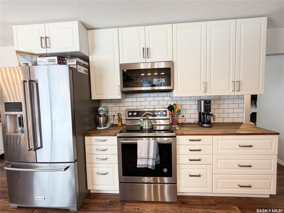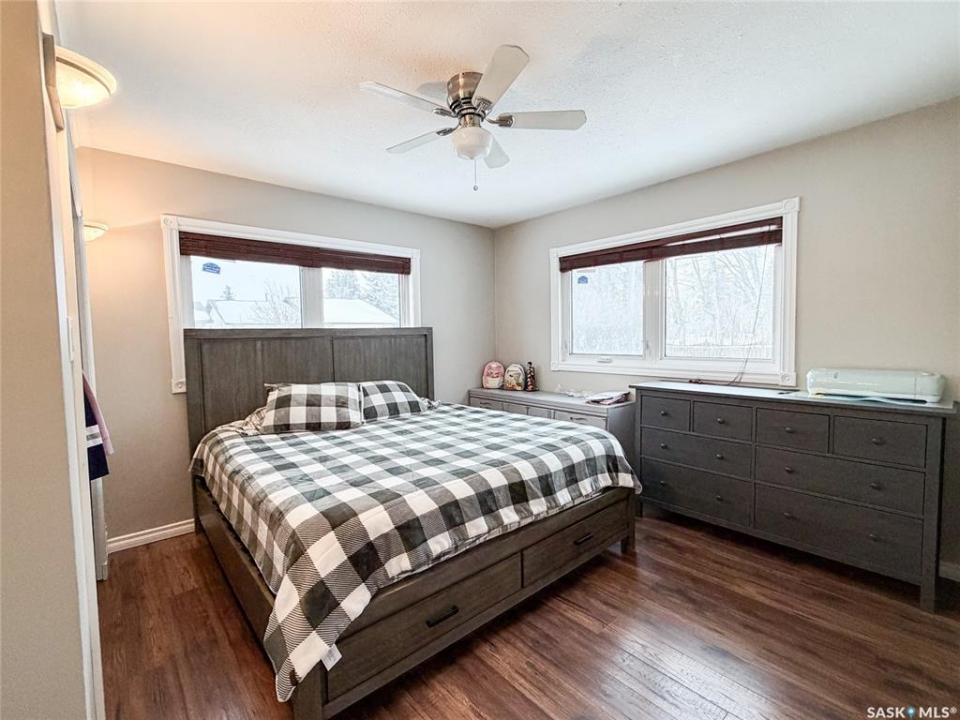 Giving fresh farmhouse vibes this 3 bedroom 2 bathroom bungalow has seen many updates over the recent years. Light and airy feel with large windows letting in generous amounts of natural light. Contemporary laminate flooring in the perfect shade runs the entirety of the home with exception of bathrooms. Living room has convenient built in storage and electric fireplace. The galley kitchen has great storage, updated stainless steel appliances and a designated dining area with patio door accessing the backyard. The primary bedroom and newest upgrade the 5pc ensuite is a space you will want to end your busy days with. The lower level has laundry and is currently utilized as storage but further development is possible. The backyard offers plenty of space! Plum and apple trees, raised garden bed with strawberries, raspberry and Saskatoon's. Shingles done 2025, water heater 2024. Garage measures 12'x24'. For more information don't hesitate to reach out.