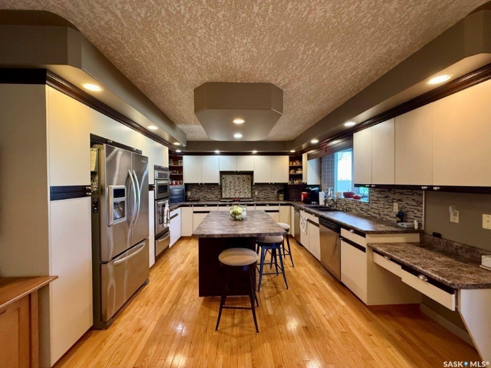 Welcome to this beautifully maintained 2,897 sq. ft. 1 � storey original-owner home, offering space, functionality, and timeless character. Situated on a mature lot with excellent street appeal, dormer accents, and a maintenance-free exterior, this property is ideal for a growing family. The home features a double attached garage plus an 18' x 24' heated detached garage perfect for extra vehicles or workshop space. Step inside the impressive front entrance open to the bright living room and staircase leading to the second level. From the foyer, you can also access the spacious great room featuring a sunken family room with a cozy wood-burning fireplace — an inviting space for everyday living or entertaining. The large dining area flows seamlessly into the well-designed kitchen, offering an abundance of cabinetry and generous counter space. Updated stainless steel appliances include a built-in microwave, convection oven with warming drawer, cooktop, and dishwasher. The island provides additional prep space and seating. Just off the dining area is a beautiful four-season sunroom, expanding your living space. Enjoy views of the backyard and direct access to the deck through patio doors — perfect for summer barbecues and relaxing evenings. The main floor also includes: Convenient 2-piece bathroom, Laundry closet, access to the attached garage and side entrance. Upstairs, you'll find four spacious bedrooms. The primary suite features a private sitting/office area and a 3-piece ensuite. A well-appointed 4-piece main bathroom completes the upper level. The basement offers even more living space with large family room, Games area, 2-piece bathroom, Utility area, and two separate storage rooms. Additional highlights include: 9” thick exterior walls, Brick exterior on cement foundation (not L iron),6' high PVC fencing, abundant storage throughout the home. Homes of this size and quality rarely come available — call today to book your private tour!