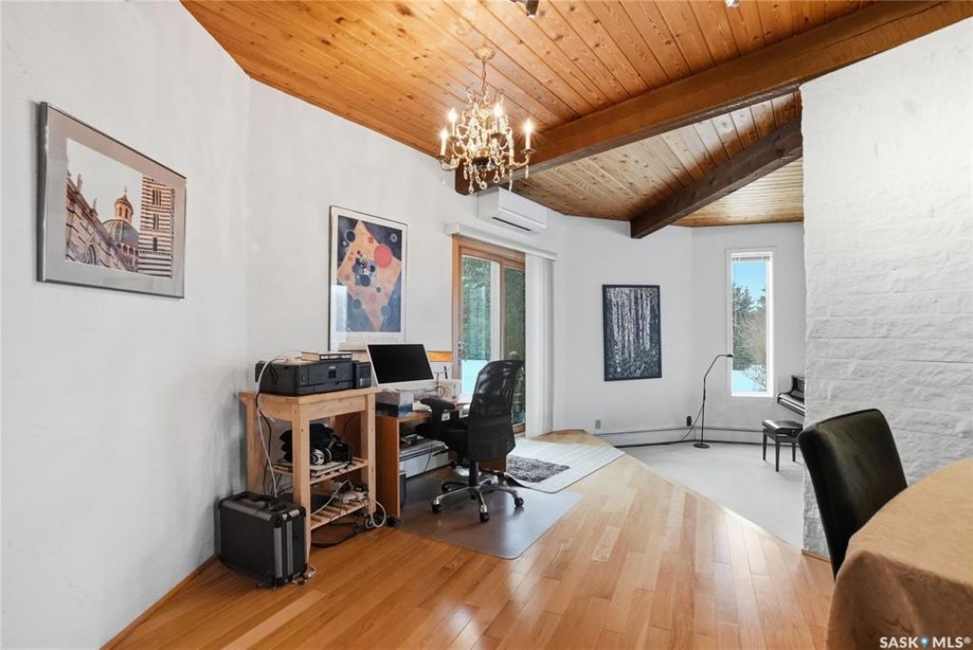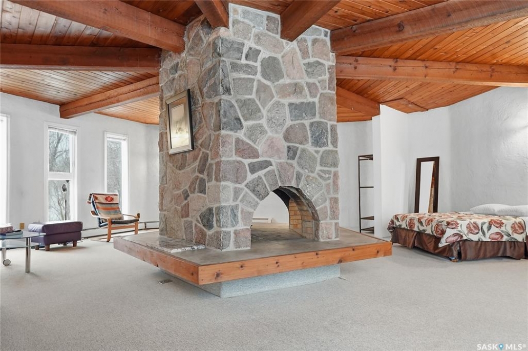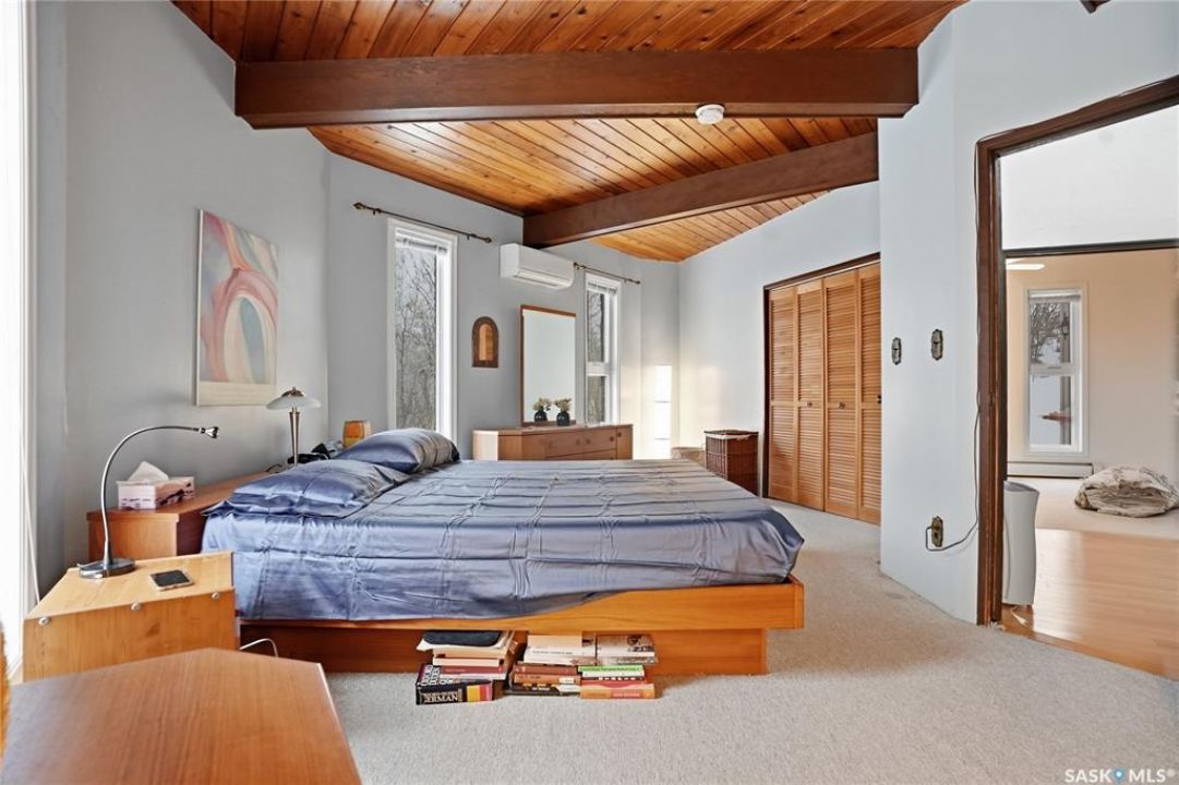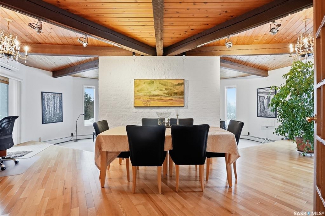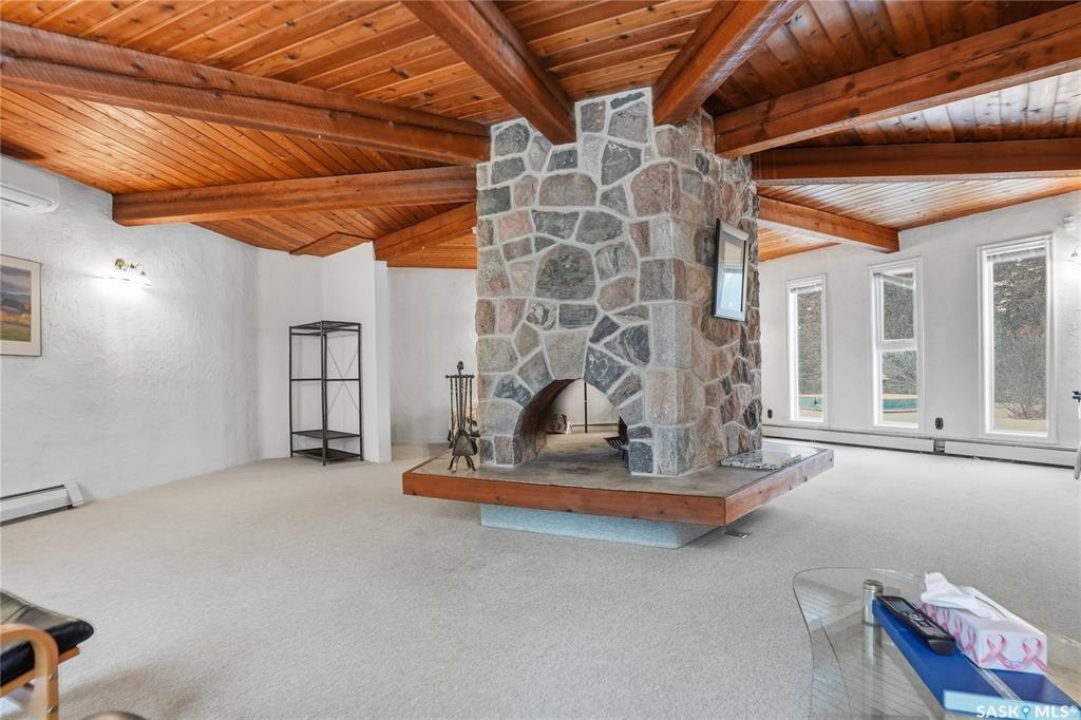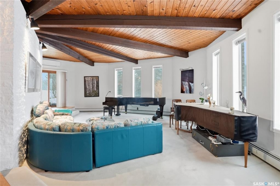 Located in prestigious Riverside Estates, this exceptional post-and-beam home offers a rare blend of architectural character, extensive upgrades, and a beautifully preserved natural setting. The mature, treed lot is rich with Saskatoon berry bushes and chokecherries, creating a private, vibrant landscape with a true acreage feel. This incredibly unique layout features multiple wings and flexible living spaces, ideal for families, entertaining, or working from home. The 3-bedroom, 2-bathroom design showcases soaring 9–11 foot ceilings, a dramatic five-sided stone fireplace, a sunken living room, and a chef's kitchen built for both everyday living and hosting. This home truly must be seen to be appreciated. Major upgrades provide exceptional efficiency and peace of mind. The roof has been replaced with a durable membrane system and enhanced insulation for superior energy performance. All 24 windows have been upgraded to triple-pane units with a lifetime warranty. A premium four-zone ductless air conditioning and heat-exchange system allows for customized comfort throughout the home. Additional highlights include an on-demand hot water system, dual ovens, and a dedicated well for landscape irrigation — ideal for maintaining the mature grounds and natural vegetation. Ideally located just 15 minutes from Saskatoon International Airport, approximately 2 km from Riverside Country Club and Chief Whitecap Park, and only 5 km from Saskatoon Golf & Country Club, this property offers an exceptional balance of privacy, nature, and convenience. A rare opportunity to own a thoughtfully upgraded home in one of the area's most desirable acreage communities.