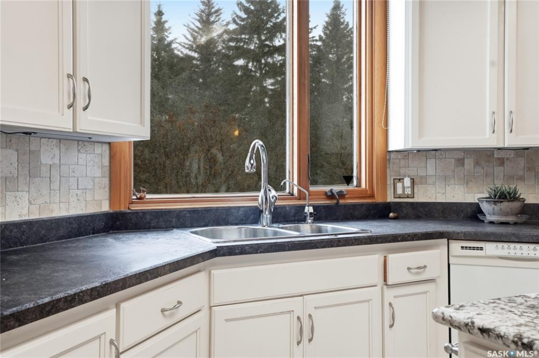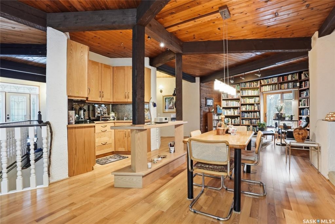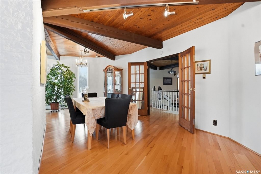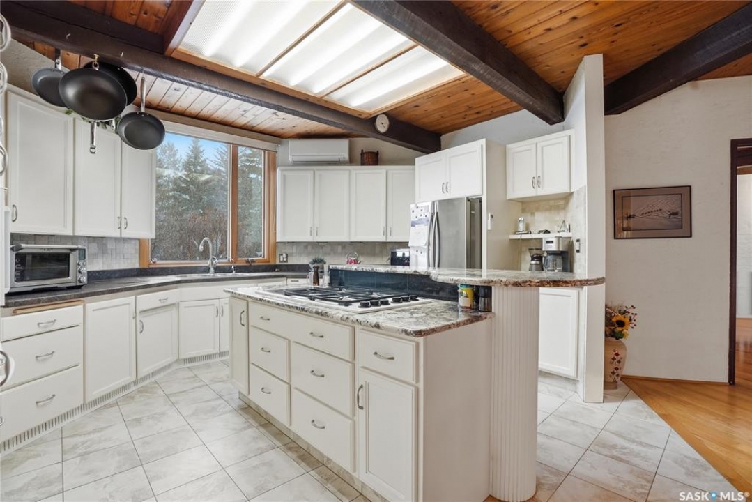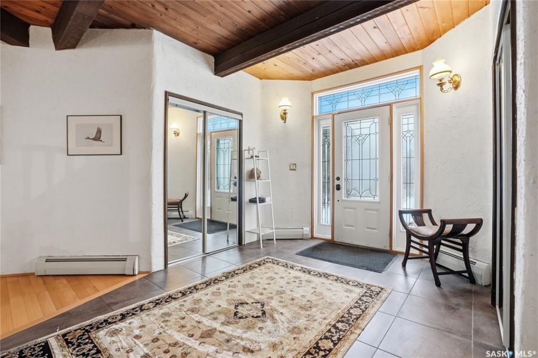 Located in prestigious Riverside Estates, this exceptional post-and-beam home offers a rare blend of architectural character, extensive upgrades, and a beautifully preserved natural setting. The mature, treed lot is rich with Saskatoon berry bushes and chokecherries, creating a private, vibrant landscape with a true acreage feel. This incredibly unique layout features multiple wings and flexible living spaces, ideal for families, entertaining, or working from home. The 3-bedroom, 2-bathroom design showcases soaring 9–11 foot ceilings, a dramatic five-sided stone fireplace, a sunken living room, and a chef's kitchen built for both everyday living and hosting. This home truly must be seen to be appreciated. Major upgrades provide exceptional efficiency and peace of mind. The roof has been replaced with a durable membrane system and enhanced insulation for superior energy performance. All 24 windows have been upgraded to triple-pane units with a lifetime warranty. A premium four-zone ductless air conditioning and heat-exchange system allows for customized comfort throughout the home. Additional highlights include an on-demand hot water system, dual ovens, and a dedicated well for landscape irrigation — ideal for maintaining the mature grounds and natural vegetation. Ideally located just 15 minutes from Saskatoon International Airport, approximately 2 km from Riverside Country Club and Chief Whitecap Park, and only 5 km from Saskatoon Golf & Country Club, this property offers an exceptional balance of privacy, nature, and convenience. A rare opportunity to own a thoughtfully upgraded home in one of the area's most desirable acreage communities.