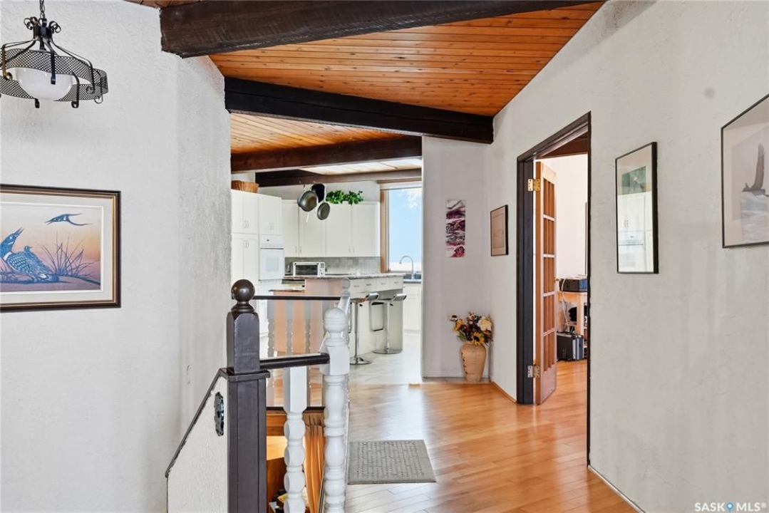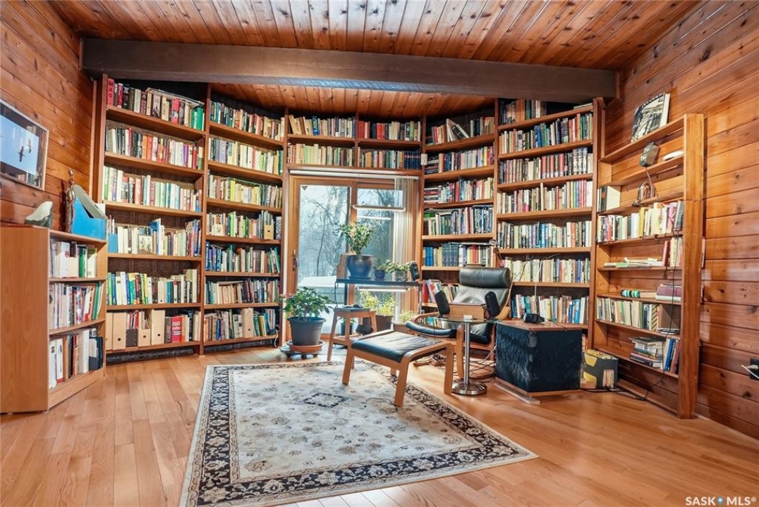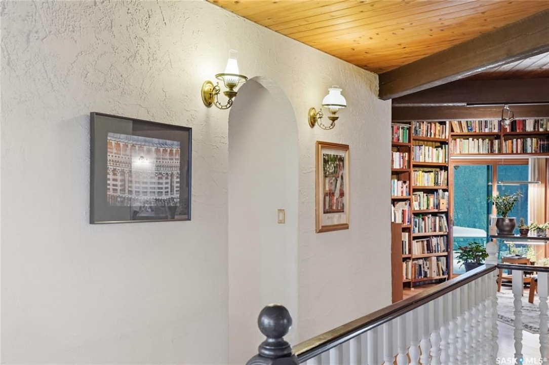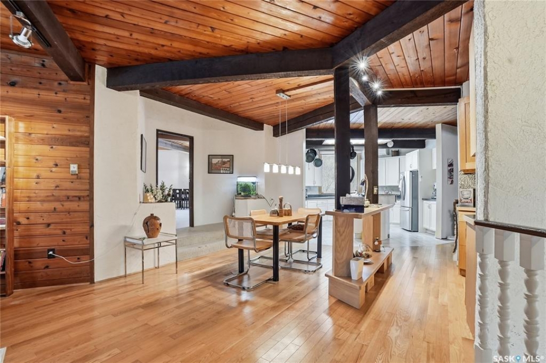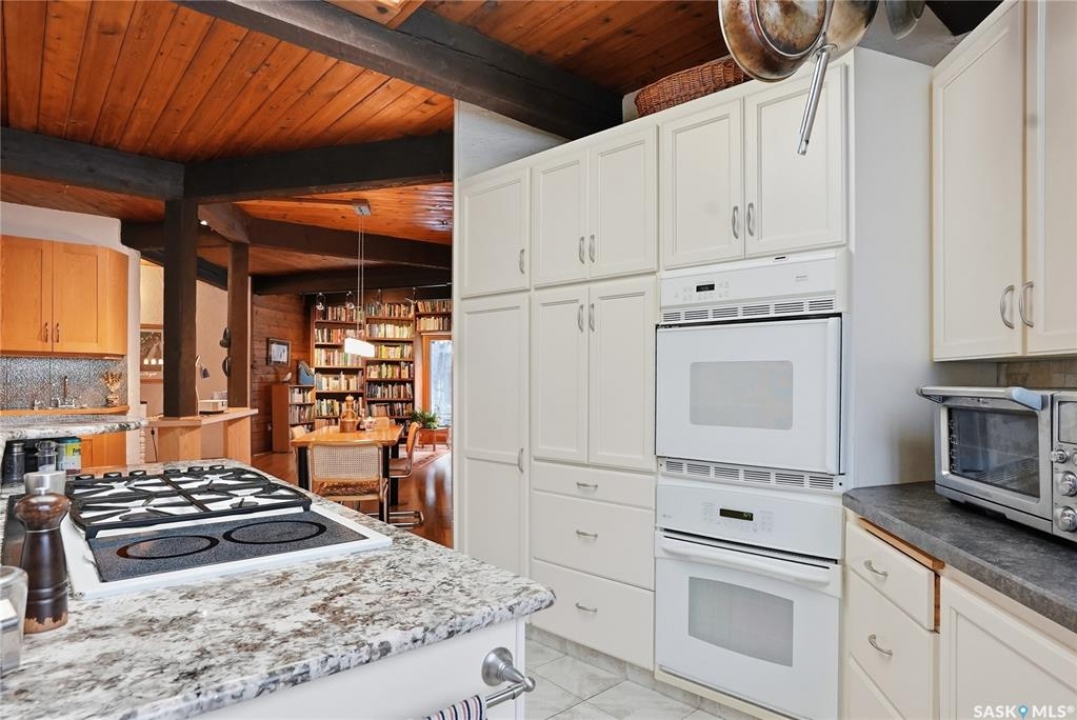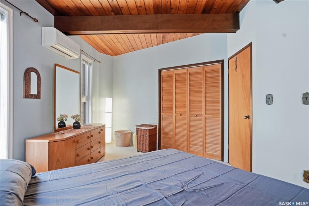 Located in prestigious Riverside Estates, this exceptional post-and-beam home offers a rare blend of architectural character, extensive upgrades, and a beautifully preserved natural setting. The mature, treed lot is rich with Saskatoon berry bushes and chokecherries, creating a private, vibrant landscape with a true acreage feel. This incredibly unique layout features multiple wings and flexible living spaces, ideal for families, entertaining, or working from home. The 3-bedroom, 2-bathroom design showcases soaring 9–11 foot ceilings, a dramatic five-sided stone fireplace, a sunken living room, and a chef's kitchen built for both everyday living and hosting. This home truly must be seen to be appreciated. Major upgrades provide exceptional efficiency and peace of mind. The roof has been replaced with a durable membrane system and enhanced insulation for superior energy performance. All 24 windows have been upgraded to triple-pane units with a lifetime warranty. A premium four-zone ductless air conditioning and heat-exchange system allows for customized comfort throughout the home. Additional highlights include an on-demand hot water system, dual ovens, and a dedicated well for landscape irrigation — ideal for maintaining the mature grounds and natural vegetation. Ideally located just 15 minutes from Saskatoon International Airport, approximately 2 km from Riverside Country Club and Chief Whitecap Park, and only 5 km from Saskatoon Golf & Country Club, this property offers an exceptional balance of privacy, nature, and convenience. A rare opportunity to own a thoughtfully upgraded home in one of the area's most desirable acreage communities.