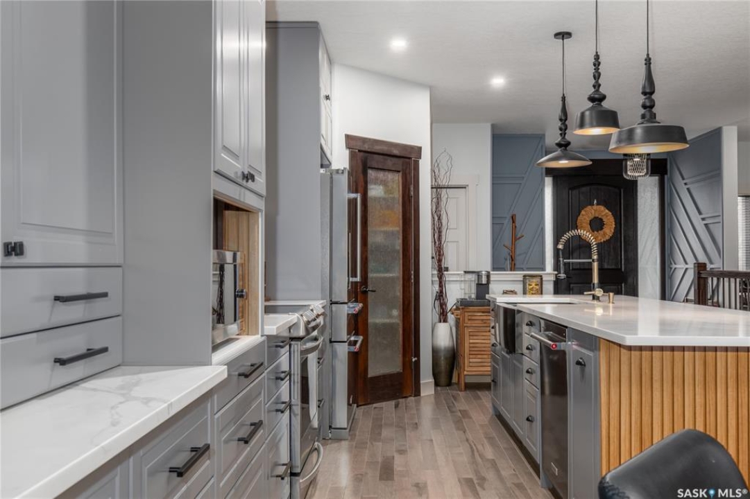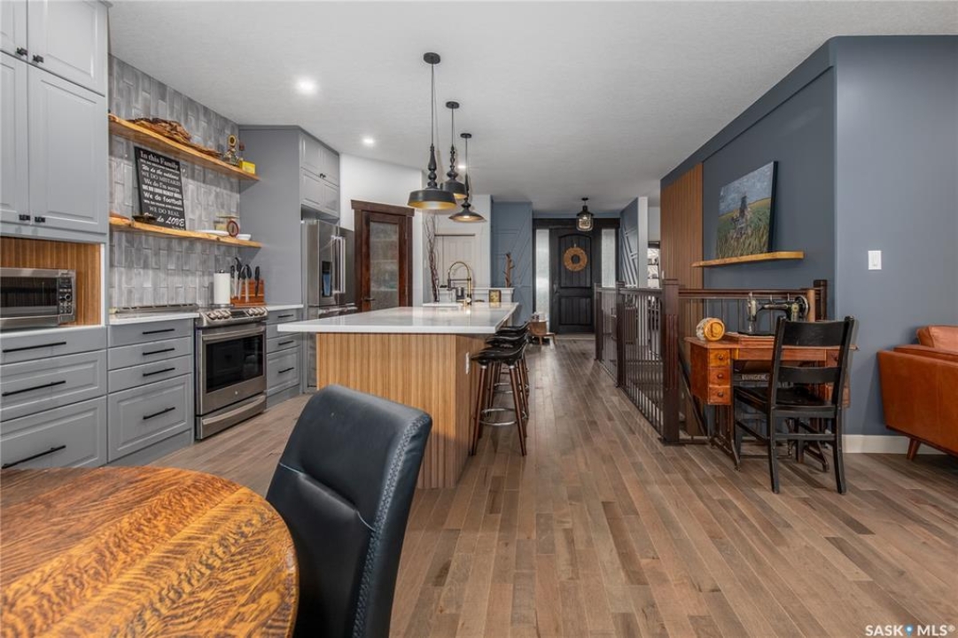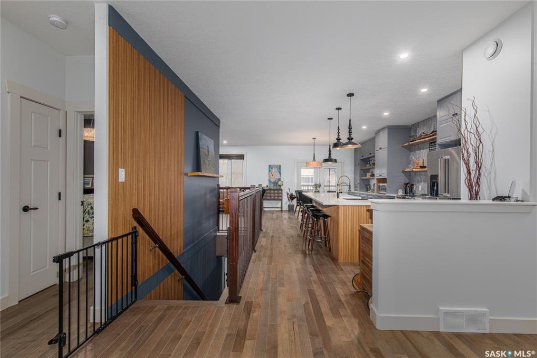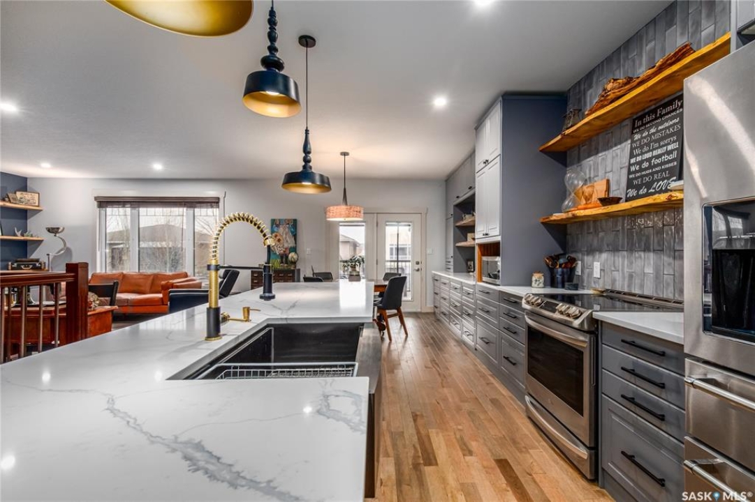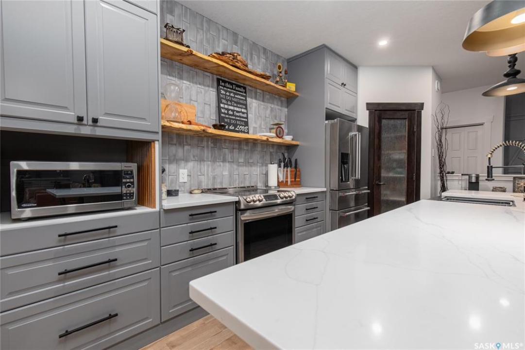 Welcome to this beautifully designed and thoughtfully upgraded 1,680 sq ft home offering exceptional space & quality construction. Situated on a large, fully fenced lot with mature trees and landscaping, this property is perfect for growing families who value both comfort and functionality. The main floor features a recently renovated kitchen, dining area, and living room, showcasing an abundance of custom grey cabinetry with soft-close hardware, quartz countertops, floating shelves, stainless steel appliances, and a spacious walk-in pantry. The living room is highlighted by built-in custom cabinetry and a beautiful electric fireplace, creating a warm and inviting focal point. Two front entry closets provide ample storage for outdoor wear. Convenience continues with main floor laundry, complete with laundry sink, located in the mudroom. The primary bedroom is a true retreat featuring his and hers walk-in closets and a 4-piece ensuite with an extra-large tiled walk-in shower. Two additional bedrooms complete the main level. One bedroom is currently being used as an office. The fully finished basement is constructed with an ICF foundation and supported by a structural steel beam, to help eliminate some teleposts to provide a wide-open, unobstructed layout. Downstairs you'll find three additional bedrooms, a corner gas fireplace, floating shelves, under-stair storage with lighting, and stair lighting on a timer for added safety and ambiance. Additional features include: 200-amp electrical service, 2 water heaters for endless hot water supply, composite covered deck, natural gas BBQ hookup, patio with gazebo, shed, heated double attached garage & underground sprinklers (front yard only) With 6 bedrooms total 3 baths, and thoughtful upgrades throughout, this move-in ready home offers incredible value and functionality inside and out. A must-see property!