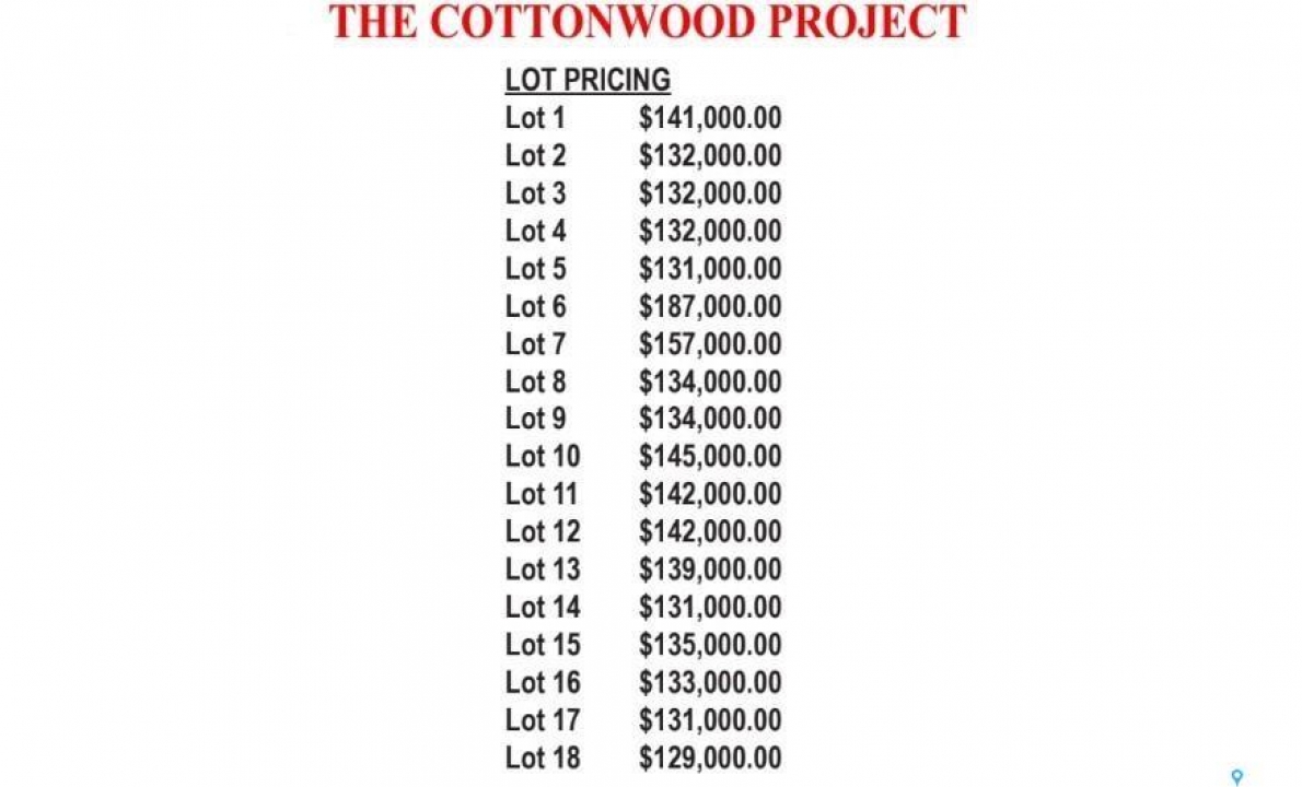 Welcome to Cottonwood Project - Weyburn's exciting, new residential neighborhood development! Nestled in a beautifully treed area in a developed residential location, the Cottonwood Project offers an opportunity previously unavailable in Weyburn - the chance to build your dream home among large, mature trees and be located within the heart of the city rather than restricted to a fringe area as with other residential lot developments. The Cottonwood Project is bordered by 13th St on one side, Hartney Ave on another, and Ashford St on the back. It is across from St. Michael School - Weyburn's only Catholic School (pre-K to grade 9). Additionally, it is within easy walking distance to public schools, Jubilee Park (the central location for baseball, soccer, tennis), the City Leisure Centre and outdoor pool, and more. With a variety of sizes, there are lots for everyone. From large pie-shaped lots, to elongated lots and standard rectangular options - you won't be disappointed. Kenney Crescent is a central L-shaped road which services the neighborhood, creating that community feel. If you've been looking for that perfect place to build your family home but haven't been satisfied with the current options, check out the Cottonwood Project.