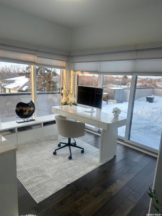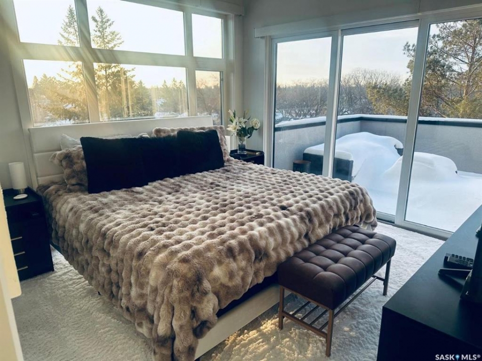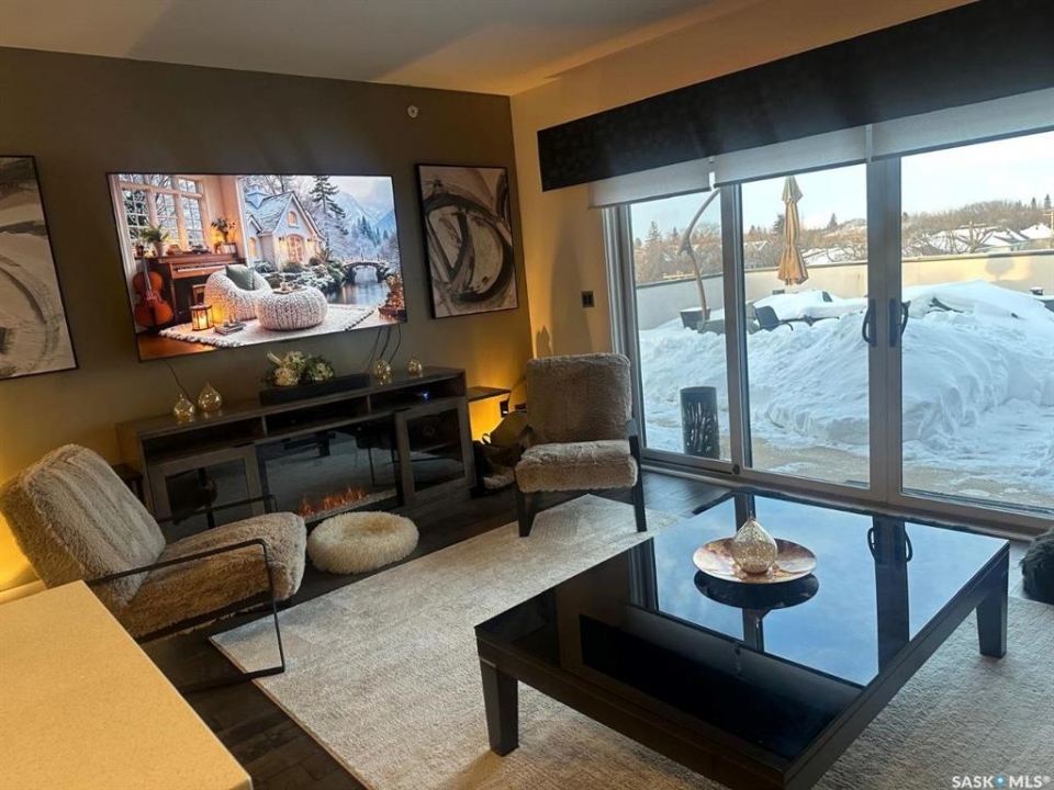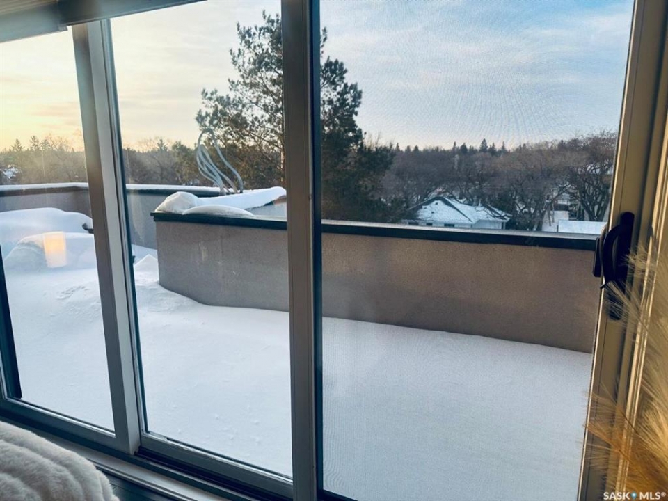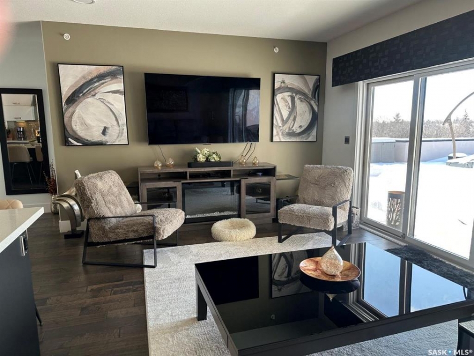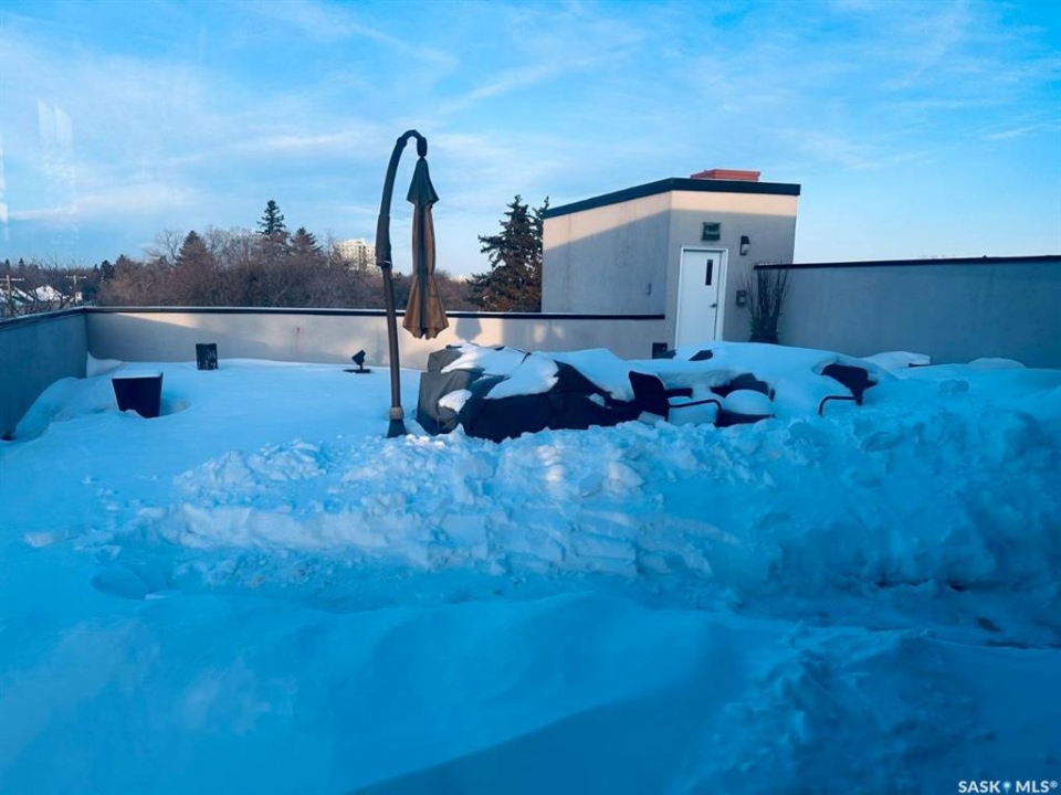 Penthouse condo with amazing outdoor space, 3 bedrooms, 2 bathrooms, and a huge 1,800 sq.ft. private patio! The unit features engineered hardwood flooring in the living, dining, and kitchen areas. Quartz countertops throughout, with the kitchen showcasing two-tone cabinets. All new light fixtures. New window coverings. The living room and master bedroom both have remote-controlled Hunter Douglas blinds. The laundry area includes double cabinets for extra storage. There are 5 patio doors. The unit comes with two parking stalls: one underground (tandem) stall #23 and one surface stall #404. The large 1,800 sq. ft. balcony is perfect for entertaining. Additional features include an individual furnace, central air, and a spacious storage/laundry room. Two small pets are allowed. The West Coast style combined with East Coast energy gives TriBeCa its unique vibe, making it one of Saskatoon's most desirable and vibrant areas. This striking building truly captures attention. It is ideally located with great proximity to the University of Saskatchewan, Broadway, and Downtown.