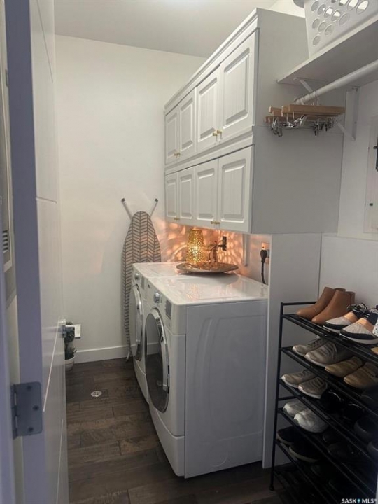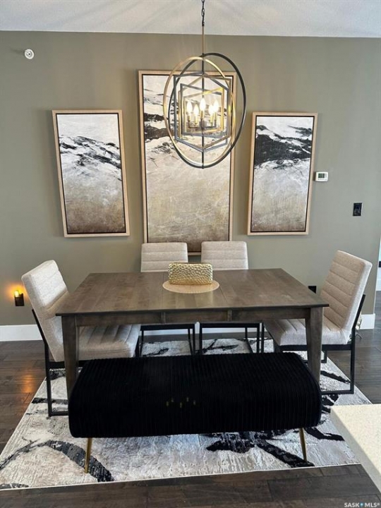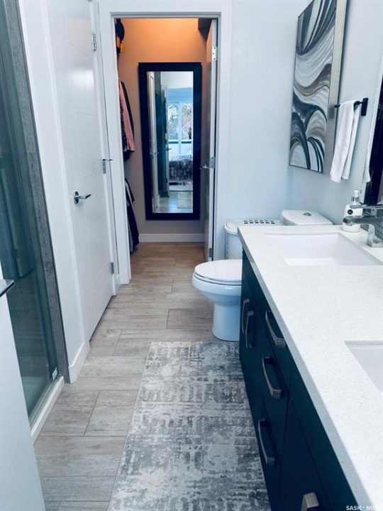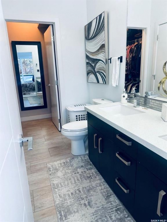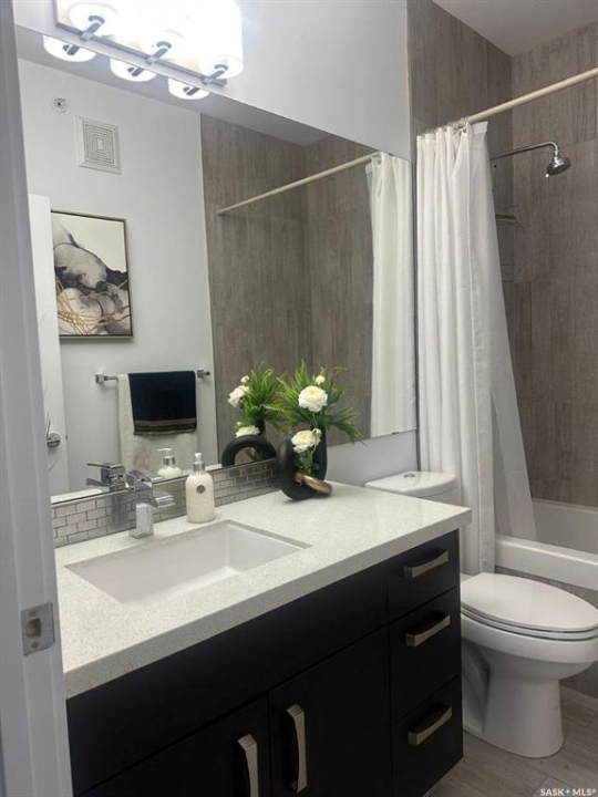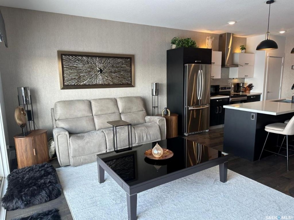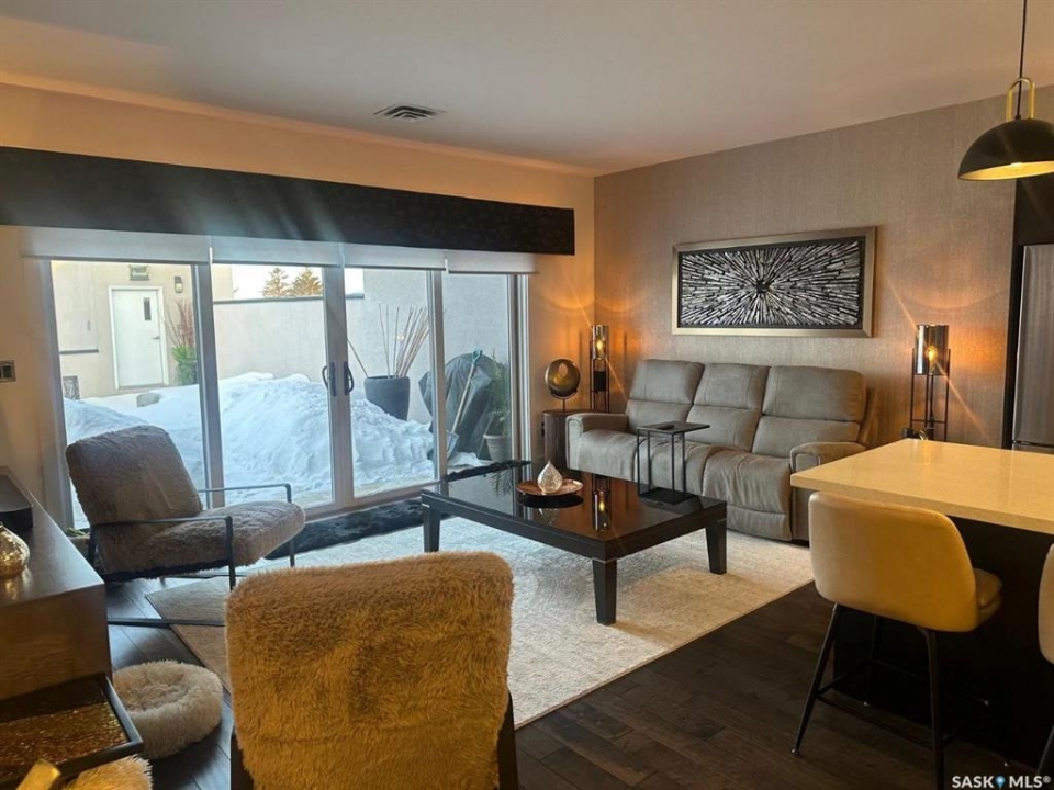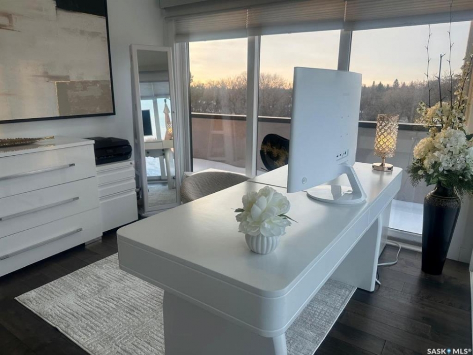 Penthouse condo with amazing outdoor space, 3 bedrooms, 2 bathrooms, and a huge 1,800 sq.ft. private patio! The unit features engineered hardwood flooring in the living, dining, and kitchen areas. Quartz countertops throughout, with the kitchen showcasing two-tone cabinets. All new light fixtures. New window coverings. The living room and master bedroom both have remote-controlled Hunter Douglas blinds. The laundry area includes double cabinets for extra storage. There are 5 patio doors. The unit comes with two parking stalls: one underground (tandem) stall #23 and one surface stall #404. The large 1,800 sq. ft. balcony is perfect for entertaining. Additional features include an individual furnace, central air, and a spacious storage/laundry room. Two small pets are allowed. The West Coast style combined with East Coast energy gives TriBeCa its unique vibe, making it one of Saskatoon's most desirable and vibrant areas. This striking building truly captures attention. It is ideally located with great proximity to the University of Saskatchewan, Broadway, and Downtown.