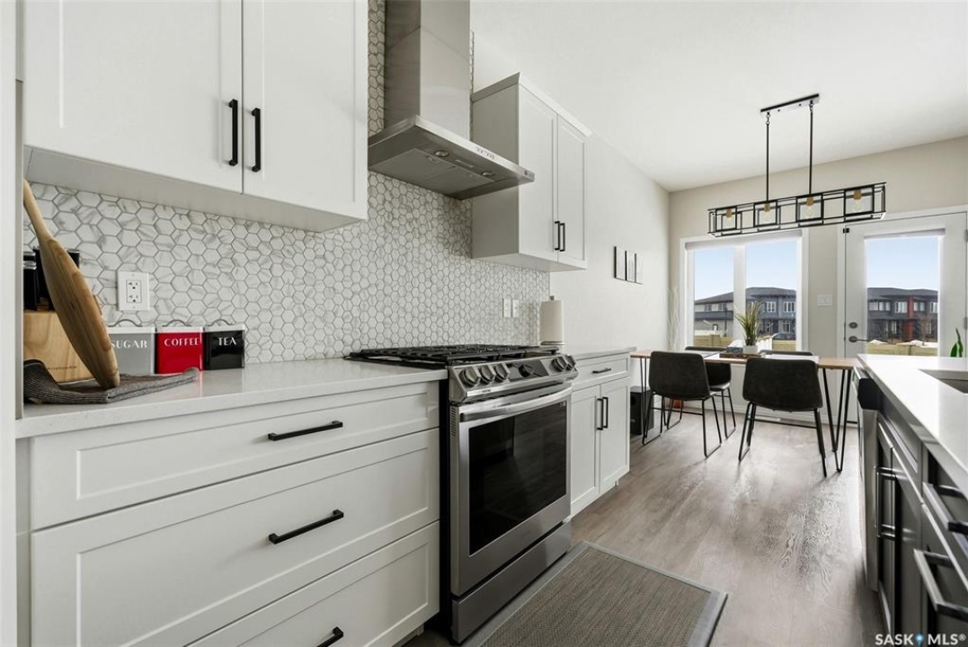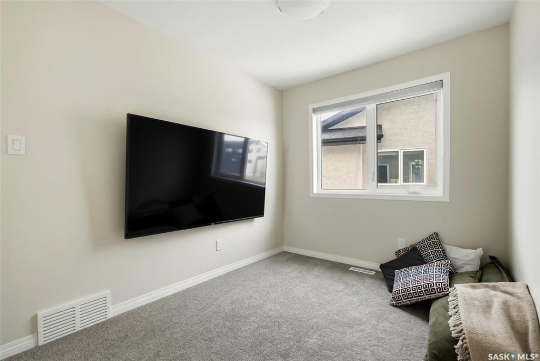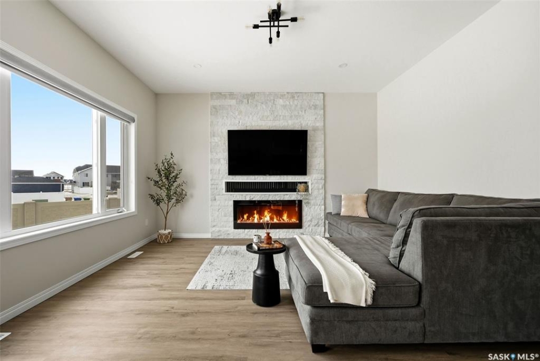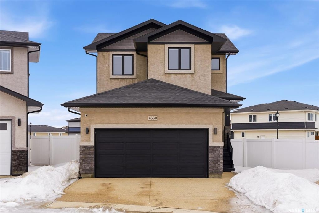 Welcome to 4330 Kinloch Bay E in The Towns—an impressive 2-storey home offering modern style, a functional family-friendly layout, and a huge fully fenced backyard. Built in 2021, this well-kept home features 1,609 sq. ft. above grade with 3 bedrooms, 3 bathrooms, and a bright second-floor bonus room. The main floor showcases an open-concept design with durable vinyl plank flooring, a stunning living room feature wall with electric fireplace, and a beautiful kitchen finished with quartz counters, two-tone cabinetry, tile backsplash, stainless steel appliances, gas range, and a large island perfect for everyday living and entertaining. The dining area overlooks the backyard and offers direct access outside. You'll also appreciate main floor laundry and a convenient 2-piece bath. Upstairs, the spacious primary suite includes a 3-piece ensuite, while two additional bedrooms and a full 4-piece bath complete the level. The full basement is unfinished and ready for your future development, with a separate entry for added flexibility. Additional features include central A/C, on-demand hot water, sump pump, double attached garage, exposed aggregate double driveway, and parking for 4 vehicles. Situated on a generous 8,380 sq. ft. lot, this home offers excellent outdoor space and room to grow in a sought-after east Regina neighbourhood.