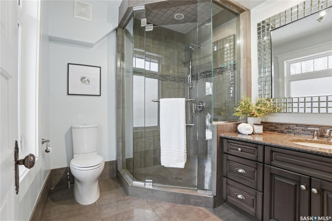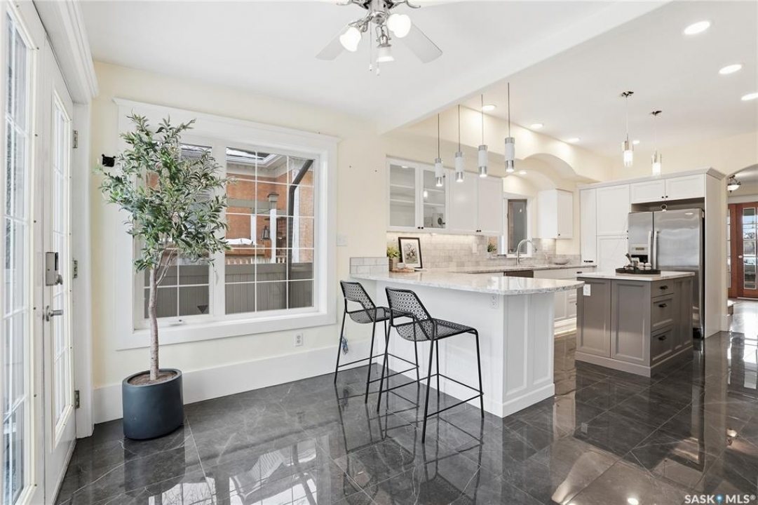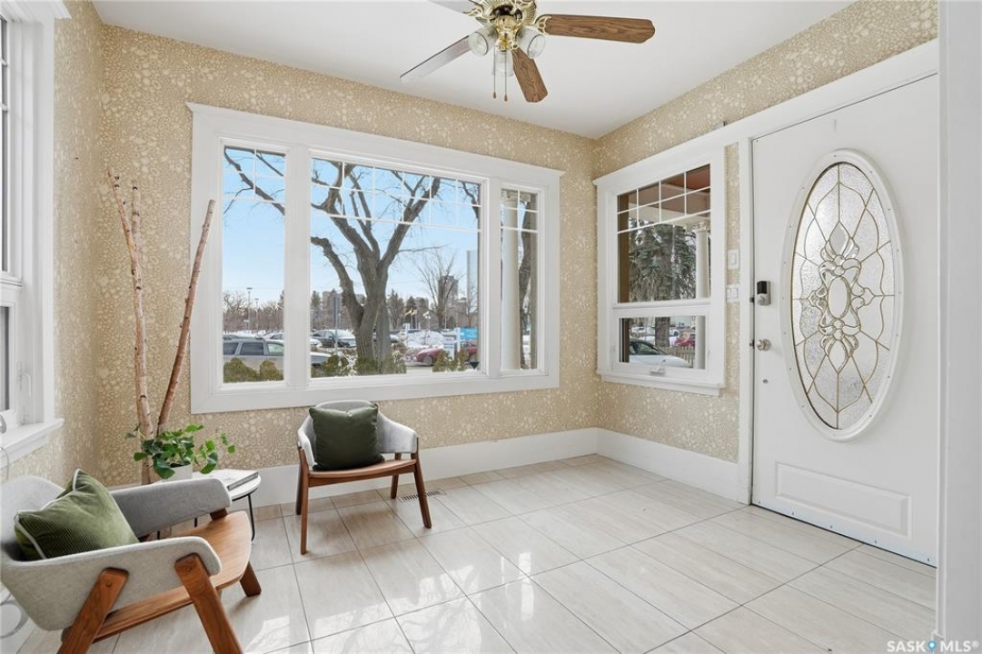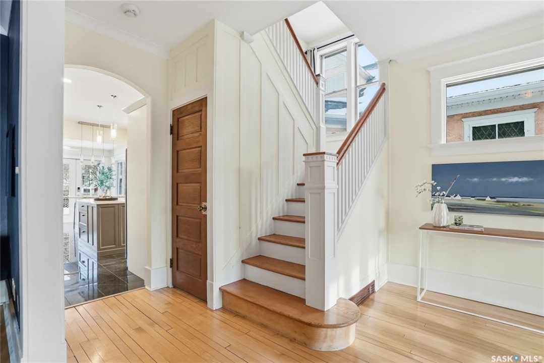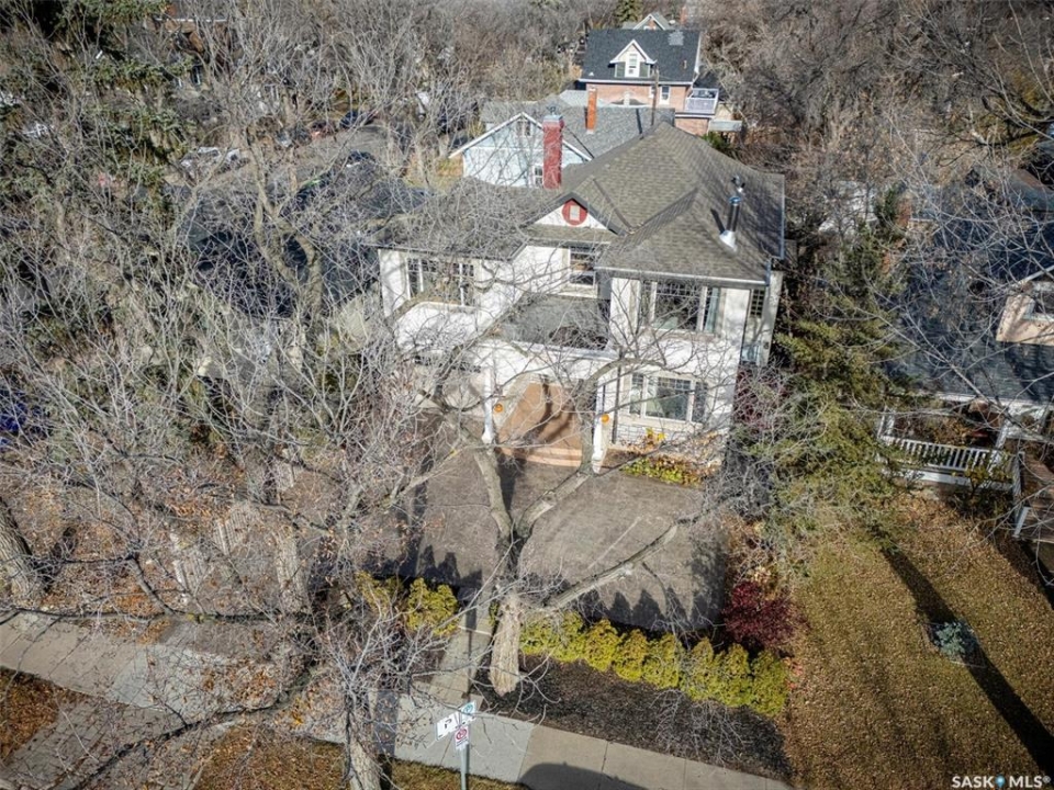 Don't miss this INCREDIBLE character home in one of Saskatoon's most desirable neighbourhoods! A stately family home with a fully developed basement with separate entry. This property exudes pride of ownership with charm and professional updates throughout. Enter into the main floor to find a welcoming sunroom and foyer, living room with wood burning fireplace, and a formal dining with a bay window. At the heart of the home is a chef's DREAM KITCHEN- spacious and beautifully appointed with quartz countertops, stainless appliances, and a sit-up eating area that opens onto a sitting room, overlooking a large deck and private yard. A 2-pc bath completes the main. Upstairs, you'll find 3 bedrooms: a primary suite with an ensuite and a charming private deck of the master. Two additional lrg bedrooms and a newly renovated 3-piece bathroom complete 2nd flr. Large windows flood every room with natural light, highlighting the significant character. Extensive renovations and upgrades have been meticulously completed recently, blending heritage with modern class. The unique dev basement offers a modern living room, lounge and 1 bed layout with a sep entrance, 4-pc bath, 2x laundry, kitchenette, and a family room w/ gas fireplace — ideal for additional cash flow. The oversized, heated att garage includes a large attic storage area above. The front yard is low maintenance with a stamped concrete driveway providing parking 3 vehicles. The private backyard will impress w/manicured grounds: a two-tiered deck, garden boxes, artificial turf, curbing, and climbing vines. In total, there are three decks, including a covered front deck and the private balcony off the master. Upgrades include: furnace, hot water heater, shingles, garage, decks, kitchen, two bathrooms, basement development, many new windows, updated exterior, and driveway — the list goes on! This gem is ideally situated within walking distance to the river, downtown, U of S, and all hospitals, the location is unbeatable!