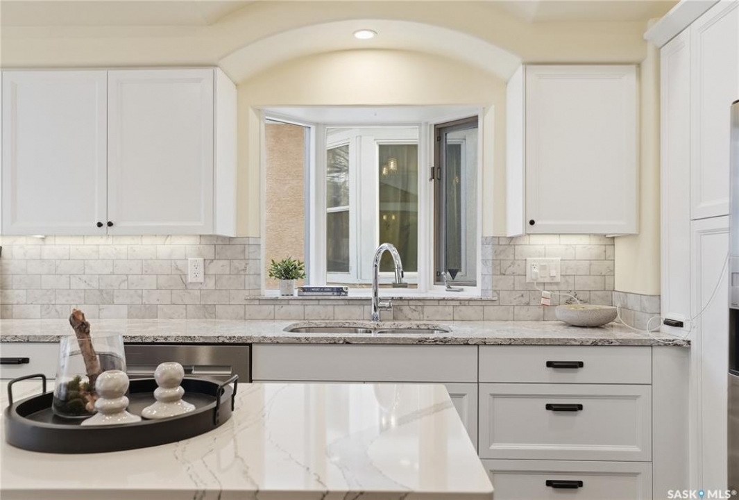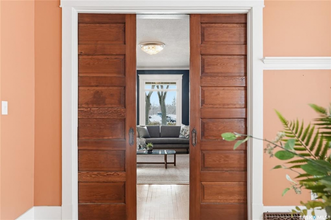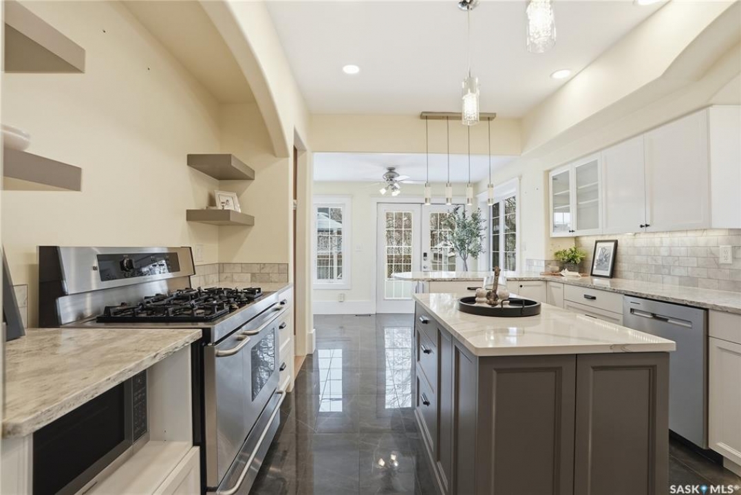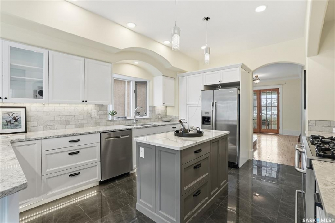 Don't miss this INCREDIBLE character home in one of Saskatoon's most desirable neighbourhoods! A stately family home with a fully developed basement with separate entry. This property exudes pride of ownership with charm and professional updates throughout. Enter into the main floor to find a welcoming sunroom and foyer, living room with wood burning fireplace, and a formal dining with a bay window. At the heart of the home is a chef's DREAM KITCHEN- spacious and beautifully appointed with quartz countertops, stainless appliances, and a sit-up eating area that opens onto a sitting room, overlooking a large deck and private yard. A 2-pc bath completes the main. Upstairs, you'll find 3 bedrooms: a primary suite with an ensuite and a charming private deck of the master. Two additional lrg bedrooms and a newly renovated 3-piece bathroom complete 2nd flr. Large windows flood every room with natural light, highlighting the significant character. Extensive renovations and upgrades have been meticulously completed recently, blending heritage with modern class. The unique dev basement offers a modern living room, lounge and 1 bed layout with a sep entrance, 4-pc bath, 2x laundry, kitchenette, and a family room w/ gas fireplace — ideal for additional cash flow. The oversized, heated att garage includes a large attic storage area above. The front yard is low maintenance with a stamped concrete driveway providing parking 3 vehicles. The private backyard will impress w/manicured grounds: a two-tiered deck, garden boxes, artificial turf, curbing, and climbing vines. In total, there are three decks, including a covered front deck and the private balcony off the master. Upgrades include: furnace, hot water heater, shingles, garage, decks, kitchen, two bathrooms, basement development, many new windows, updated exterior, and driveway — the list goes on! This gem is ideally situated within walking distance to the river, downtown, U of S, and all hospitals, the location is unbeatable!