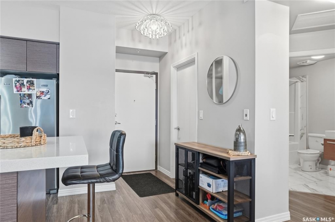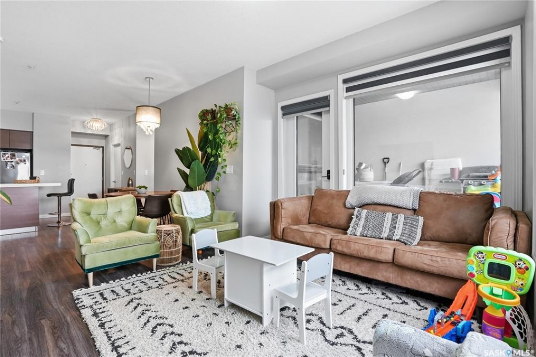 Welcome to Sequoia Square, where comfort meets convenience in this exceptionally maintained main-floor condo. This beautiful 2-bedroom, 2-bathroom home offers stylish living with the added bonus of direct exterior access — providing extra privacy and easy entry. Step inside to discover a bright, open-concept layout enhanced by soaring 9-foot ceilings and expansive windows that fill the space with natural light. The thoughtfully designed floor plan features forced air heating for consistent, year-round comfort. The contemporary kitchen is both functional and elegant, showcasing quartz countertops, stainless steel appliances, soft-close cabinetry, and a standalone island that offers additional prep space, storage, and casual seating. Seamlessly connected to the dining and living areas, it's perfectly suited for entertaining or relaxed everyday living. The spacious primary suite serves as a private retreat, complete with large windows, a refined dressing/closet area, and a modern ensuite featuring double sinks and a walk-in shower. A second well-sized bedroom, a full four-piece bathroom, and a convenient in-suite laundry and storage room complete the interior. Enjoy your morning coffee or unwind in the evening on the generous covered balcony — a perfect extension of your living space. Additional features include central air conditioning, one underground parking stall, and one electrified surface stall. Residents also enjoy access to a welcoming main lobby and recreation rooms on each floor. Ideally situated with quick access to the University of Saskatchewan and nearby amenities, this outstanding main-floor unit offers the perfect blend of style, function, and location.