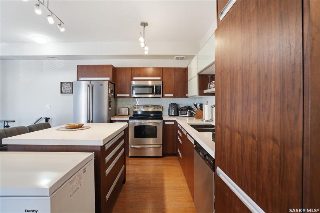 Welcome to this bright and beautifully maintained top-floor Ginger Loft unit offering 2 bedrooms and 1 full bathroom in a prime location! The open-concept layout creates a spacious and inviting atmosphere, perfect for both relaxing and entertaining. The living and dining areas flow seamlessly together, with large windows bringing in plenty of natural light and access to a private balcony. In the livingroom over the stairs, you will find a space dedicated to extra storage. The functional kitchen overlooks the main living space, making it easy to stay connected with guests or family. Located just minutes from shopping centres, restaurants, and the University of Saskatchewan, this home is perfect for students, professionals, or investors alike. Residents enjoy access to an impressive clubhouse featuring a fully equipped gym, games area, pool, and hot tub — bringing resort-style amenities right to your doorstep. Call your favourite Realtor to book your private showing!