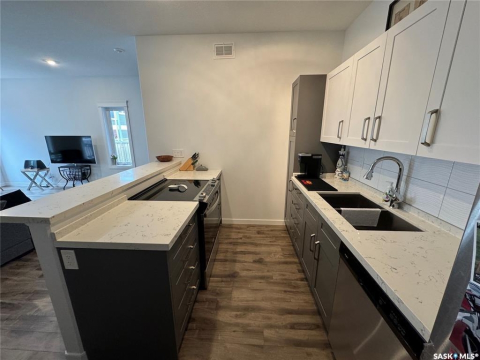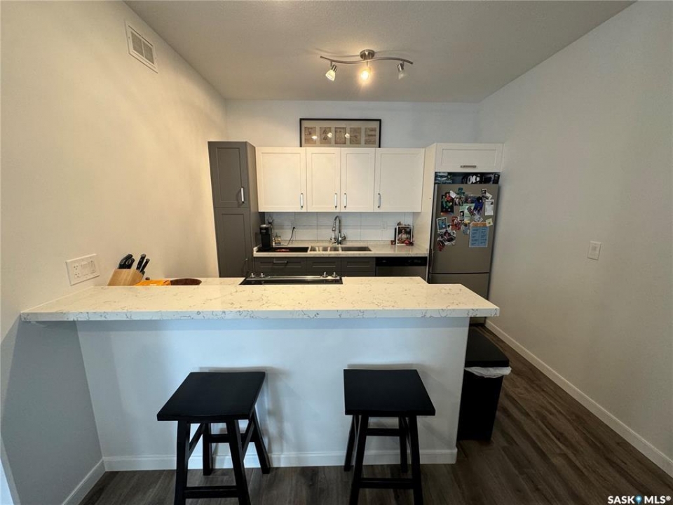 Clean, Modern Townhouse-Style Condo Offering Exceptional Value Welcome to this beautifully finished townhouse-style condo with quick access to Riversdale, the South Saskatchewan River, and minutes from Downtown. Combining modern design, functionality, and outstanding value, this home is perfect for first-time buyers, professionals, or investors. The main floor showcases a stylish two-tone kitchen with soft-close cabinetry, white quartz countertops throughout, stainless steel appliances, and energy-efficient recessed LED lighting. Premium Chestnut millwork adds warmth and character to the custom staircase railings. Upstairs features two spacious bedrooms, including a large primary with a walk-in closet and custom organizer, along with a contemporary three-piece bathroom and convenient stacked washer and dryer. The basement is neatly roughed-in and ready for future development, making it easy to add additional living space and a third bathroom leaving room for even more future opportunity to build equity and enhance long-term value. This is a fantastic opportunity to own a move-in ready home in a very central location of Saskatoon.