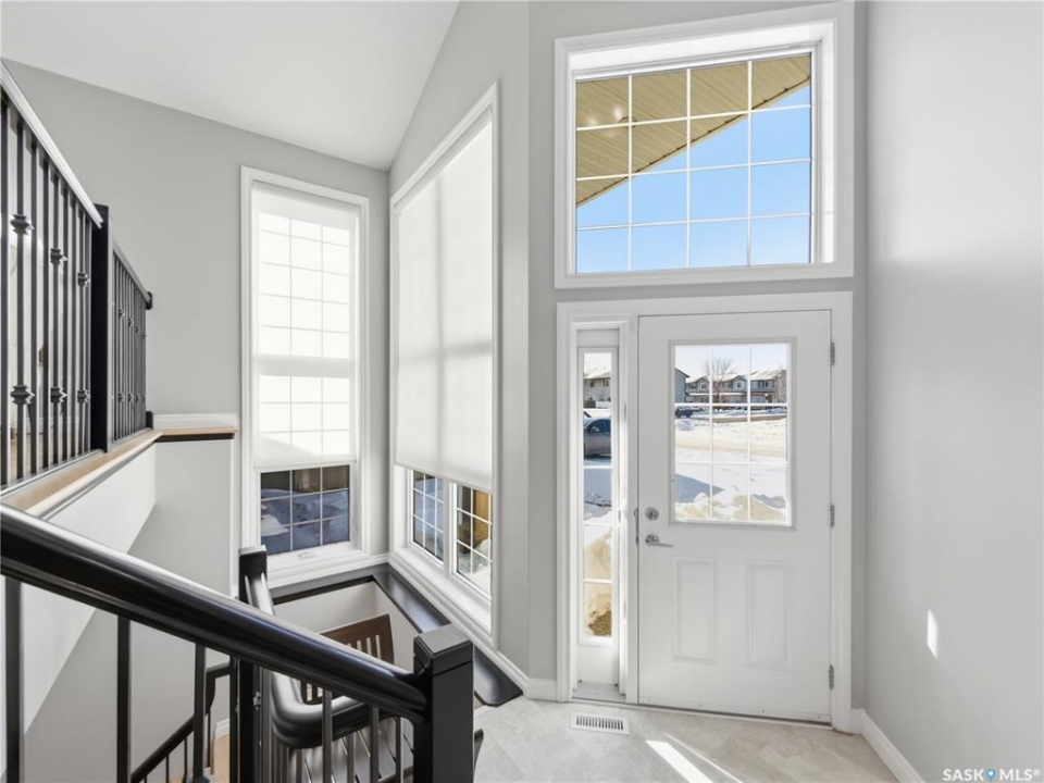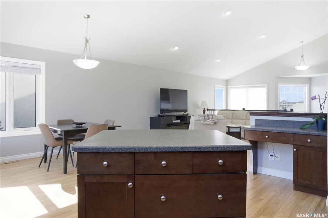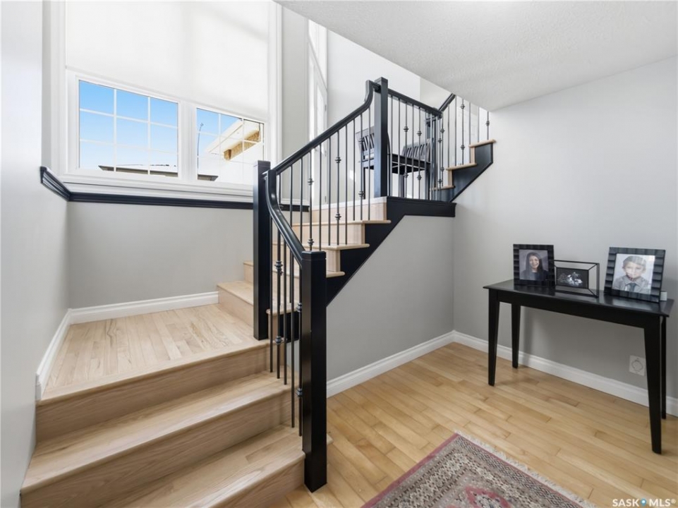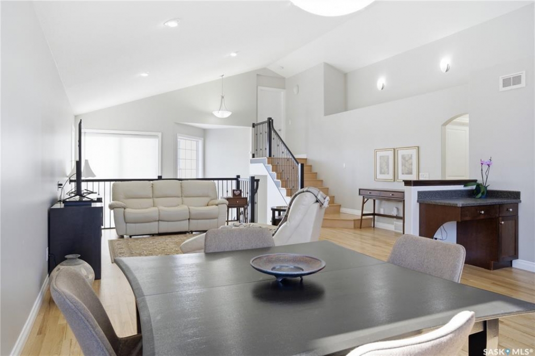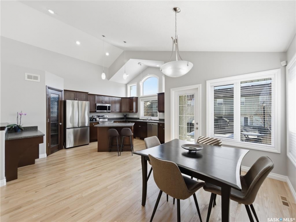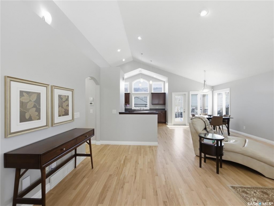 Welcome to this custom built modified bi-level by Gilroy Homes, located in the highly sought-after community of Lakeridge in Regina. Offering 1,627 sq ft of thoughtfully designed living space, this home delivers comfort, style, and an unbeatable north-end location — just steps from shopping, restaurants, parks etc. From the moment you step inside, the spacious foyer sets the tone, opening to soaring vaulted ceilings and expansive windows that flood the main floor with natural light. The open-concept layout seamlessly connects the living and dining areas, creating an inviting atmosphere perfect for both everyday living and entertaining. The kitchen is designed to impress, featuring abundant cabinetry, a functional pantry, and brand new appliances — offering both style and practicality for the home chef. Brand-new hardwood flooring (completed December 2025) and fresh paint throughout give the home a crisp, modern feel. The main level hosts two generously sized bedrooms and a full 4-piece bath, along with conveniently located laundry. The primary bedroom is tucked away on the upper level, complete with a spacious bedroom and a spa-inspired ensuite featuring a standalone shower and a relaxing soaker tub — your own personal escape at the end of the day. The fully developed basement welcomes you through elegant French doors into a large recreation space, highlighted by engineered hardwood flooring and a cozy electric fireplace. A built-in sound system enhances the entertainment experience, while the additional bedroom and 3-piece bathroom with in-floor heating add comfort and flexibility for guests or family members. Outside, enjoy summer evenings on the expansive deck overlooking the landscaped yard and garden area. Garage man-door leads directly to the dog run — perfect for pets. This exceptional home combines quality craftsmanship, modern upgrades, and a prime location. Don't miss your opportunity to call it yours--book your private showing today before it's gone!