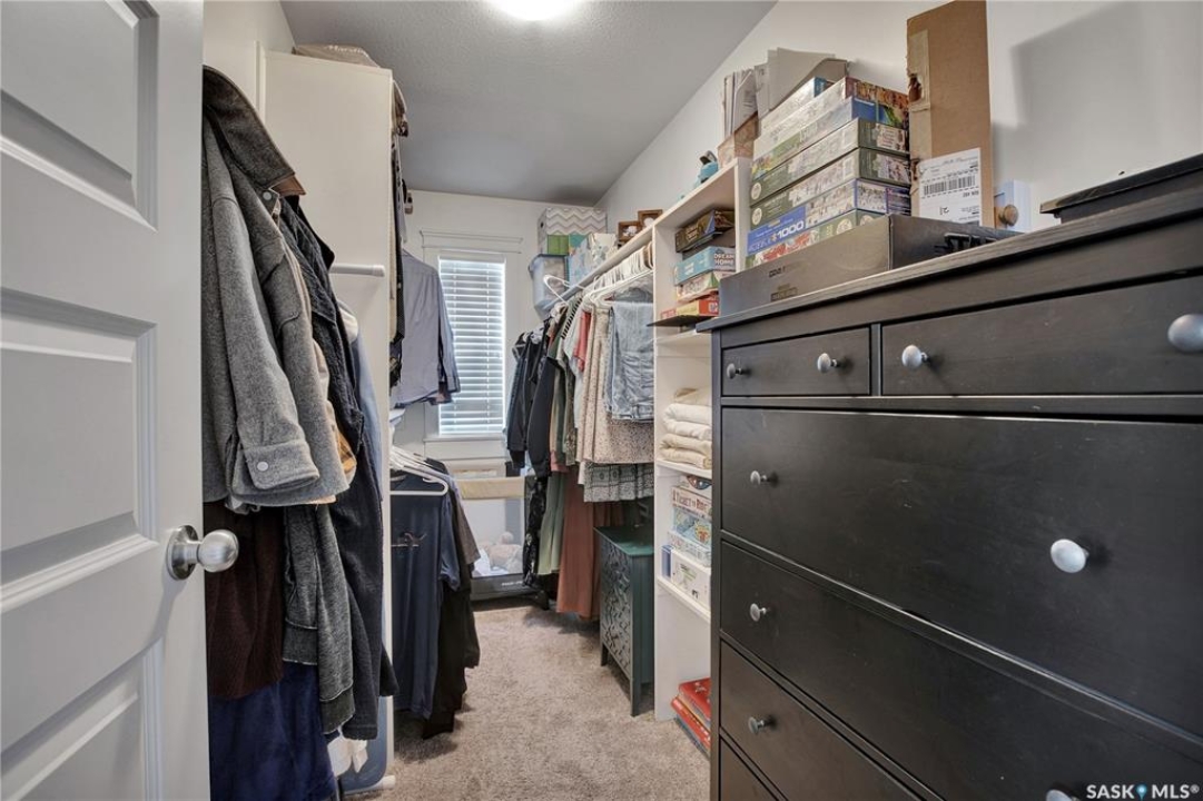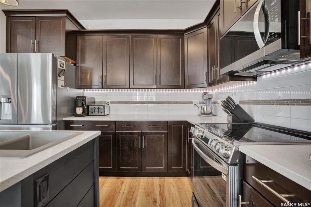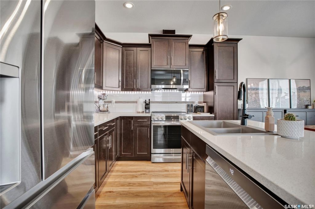 Walk into incredible value in this fully customized 1,643 sq. ft. unit , thoughtfully upgraded and perfectly suited for a growing family. From the moment you step inside, you'll notice how functional this home is. The oversized entry offers generous storage with built-in hooks and space to keep everyday life organized (because backpacks, hockey bags, and Costco runs need a home too). The main floor has been updated with stylish, durable vinyl plank flooring that flows seamlessly through the living areas. The kitchen is designed for connection — featuring a spacious island with ample seating, ideal for homework sessions, casual breakfasts, or hosting friends. The cozy gas fireplace in the living room creates a warm focal point, a great place to unwind at the end of the day. The majority of the high traffic areas have smart bulbs that can be controlled by WIFI. Throughout the home, the owners have added beautiful custom touches ;feature walls, built-in shelving, and clever storage solutions that truly maximize every square foot. It feels intentional, polished, and move-in ready. Upstairs, you'll find generously sized bedrooms, convenient second-floor laundry, and a spacious primary retreat complete with a five-piece ensuite , your own quiet escape. The basement is also fully finished, offering an additional family room and a bedroom with a walk-in closet. Bonus: the walk-in closet has a bathroom rough-in, giving you the option to easily add another bathroom if desired. Outside, the backyard is south-facing and designed for low maintenance enjoyment. A partially covered deck and dedicated seating area make it easy to soak up those Saskatchewan summer evenings. What truly sets this property apart is its location , centrally situated near schools, parks, and walking paths. It's a neighbourhood where families settle in, kids and play outside. If you've been waiting for a turnkey home with space, style, and smart upgrades, this might just be it.
