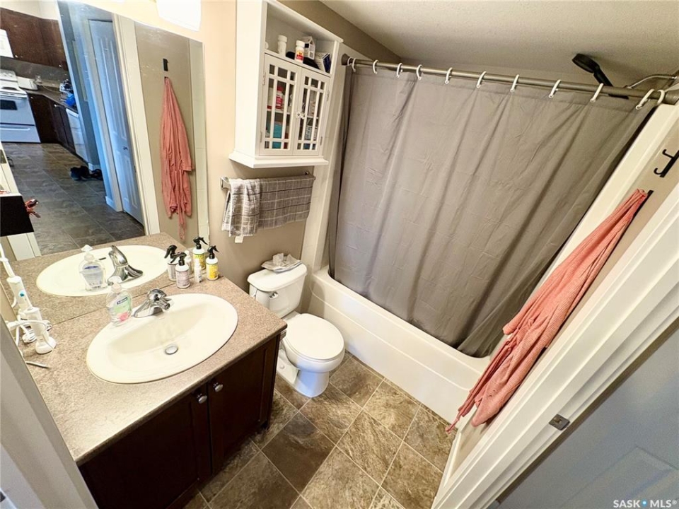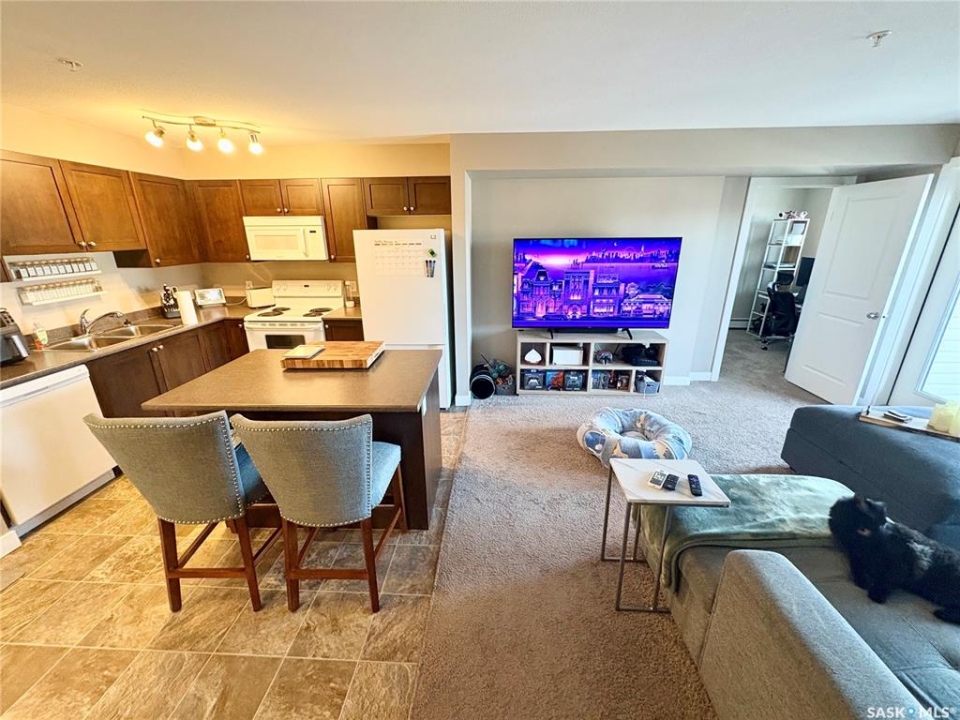 Welcome to this stylish 657 sq ft condo in the modern Fifth & 5th building. This thoughtfully designed one-bedroom plus office suite offers an open-concept layout that maximizes space and functionality. The kitchen seamlessly connects to the dining and living areas, creating an inviting space for everyday living or entertaining. The contemporary kitchen features updated white appliances, ample cabinet and counter space, and a functional island that adds both prep space and seating. The spacious primary bedroom is bright and comfortable, while the dedicated office provides the perfect work-from-home space or compact second bedroom to suit your needs. A well-appointed 4-piece bathroom, convenient in-suite laundry, and a private north-facing balcony add to the comfort and practicality of this home. This unit also includes one reserved outdoor parking stall. This is an excellent opportunity for first-time buyers, professionals, or investors. Book your private viewing today.
