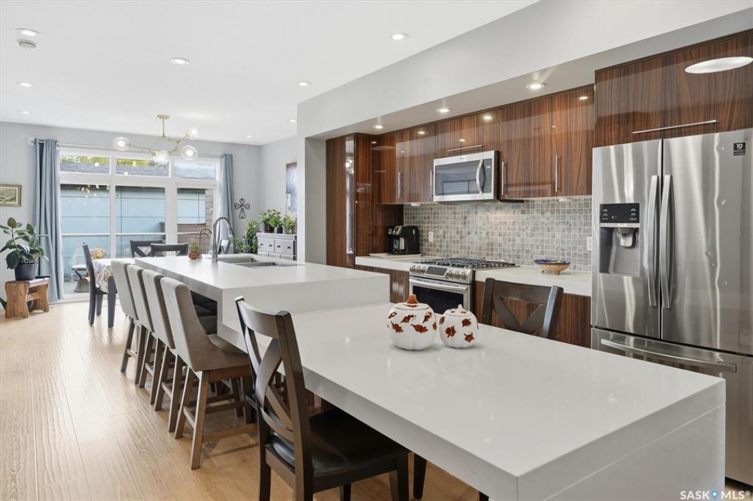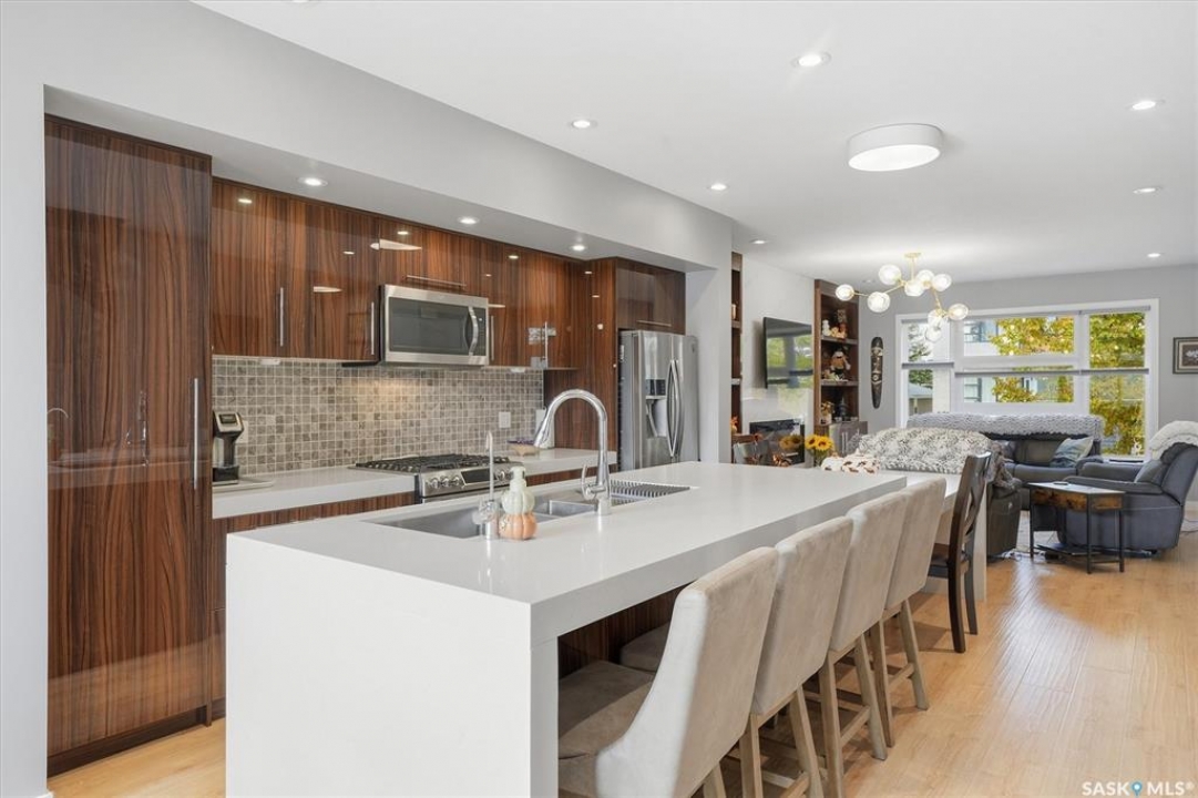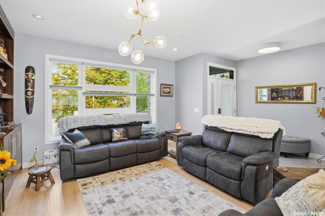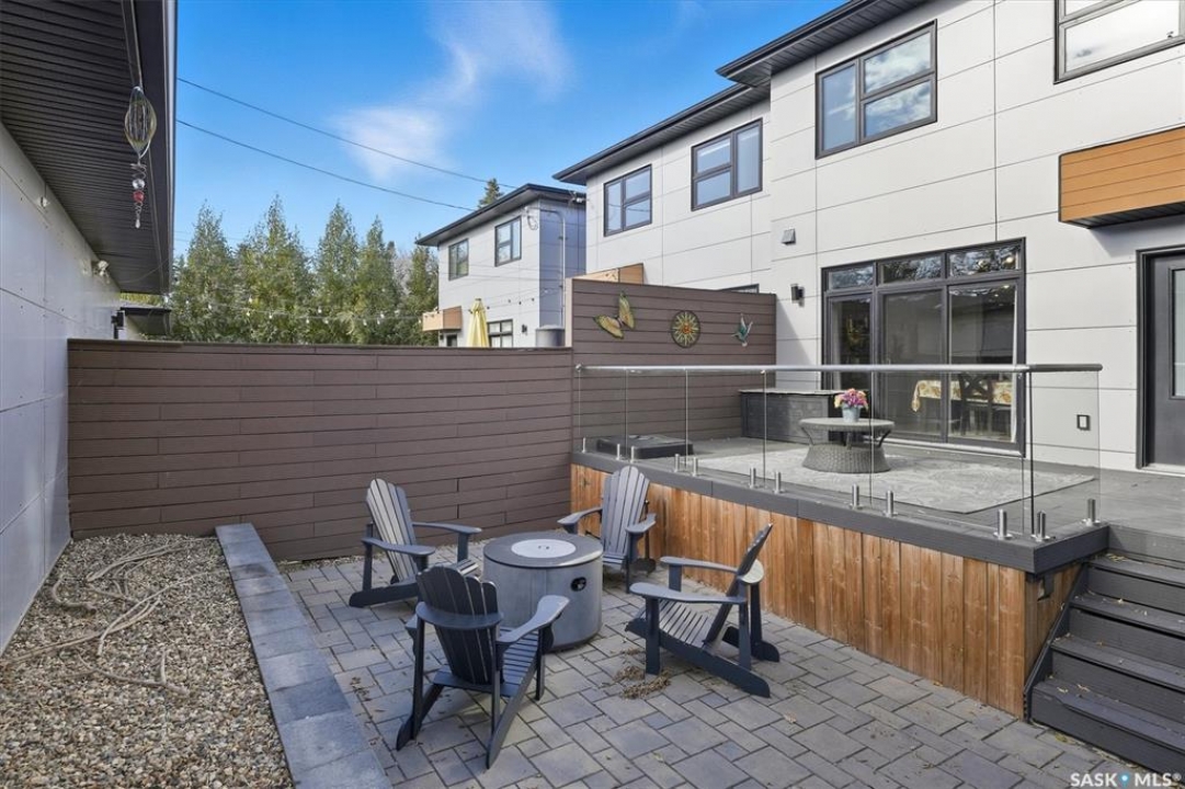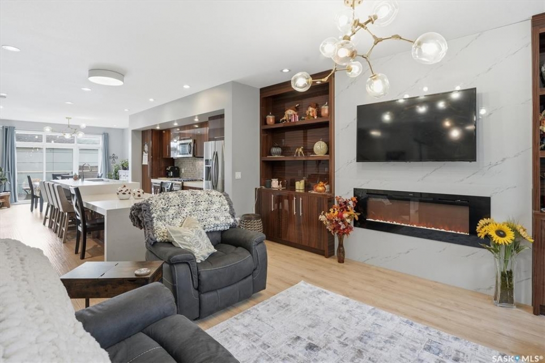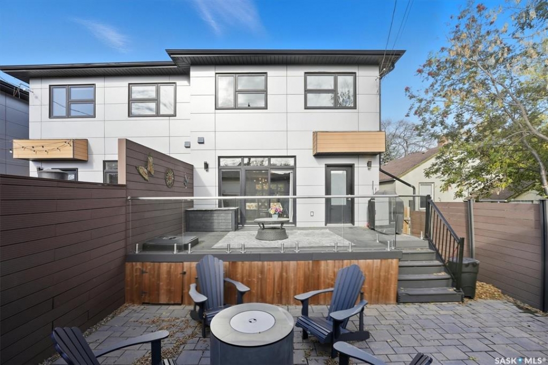 OPEN HOUSE SUNDAY MAR 8th 1-3PM. Welcome to 1106 7th St E. This stunning 1,897 sq. ft. semi-detached two-storey offers modern style and exceptional craftsmanship in the established Haultain neighbourhood. The bright, open concept main floor features 9-ft ceilings, large windows, and a stylish electric fireplace with built-in shelving. The chef's kitchen boasts high gloss cabinets, a massive quartz island, tile backsplash, and stainless steel appliances including a gas range. French doors off the dining area lead to a south-facing, maintenance-free deck and an insulated double detached garage. Upstairs, the primary suite impresses with a walk-in closet and spa-like 5-pc ensuite featuring a soaker tub, glass shower, and double sinks. Two more spacious bedrooms, a 5-pc main bath, and 2nd floor laundry complete this floor. Additional features include no carpet, custom closet organizers, open-tread staircase, pot lighting, and a side entry to the basement with 9-ft ceilings ready for development and a zeroscape yard featuring artificial turf in the front and a custom paving stone patio in the back. Call for your private showing today!!
