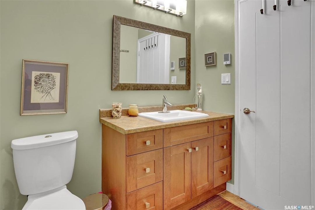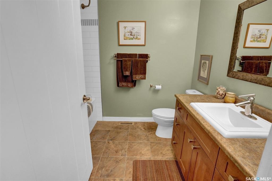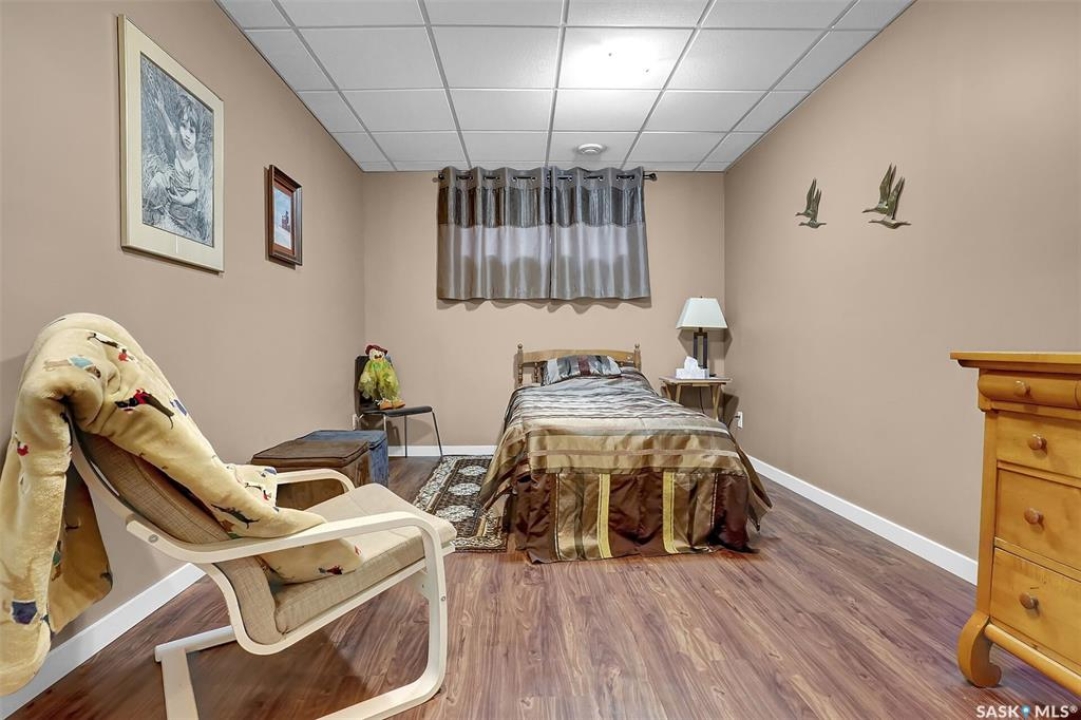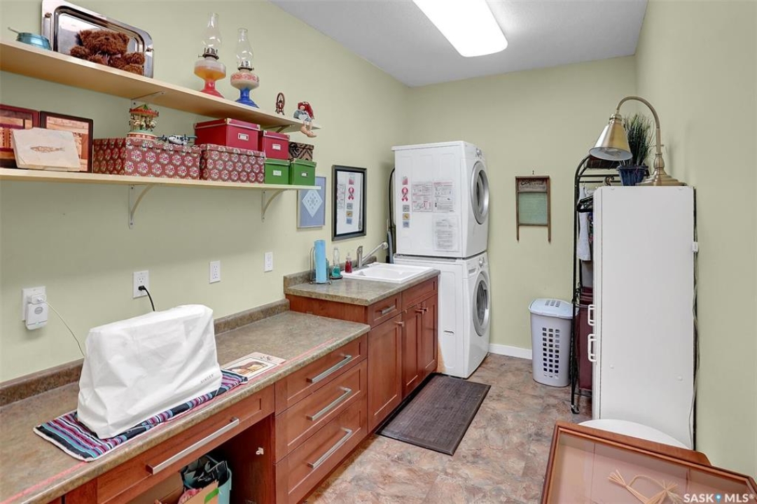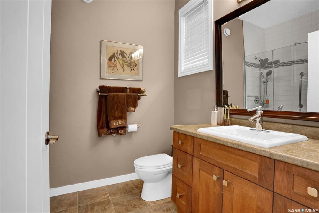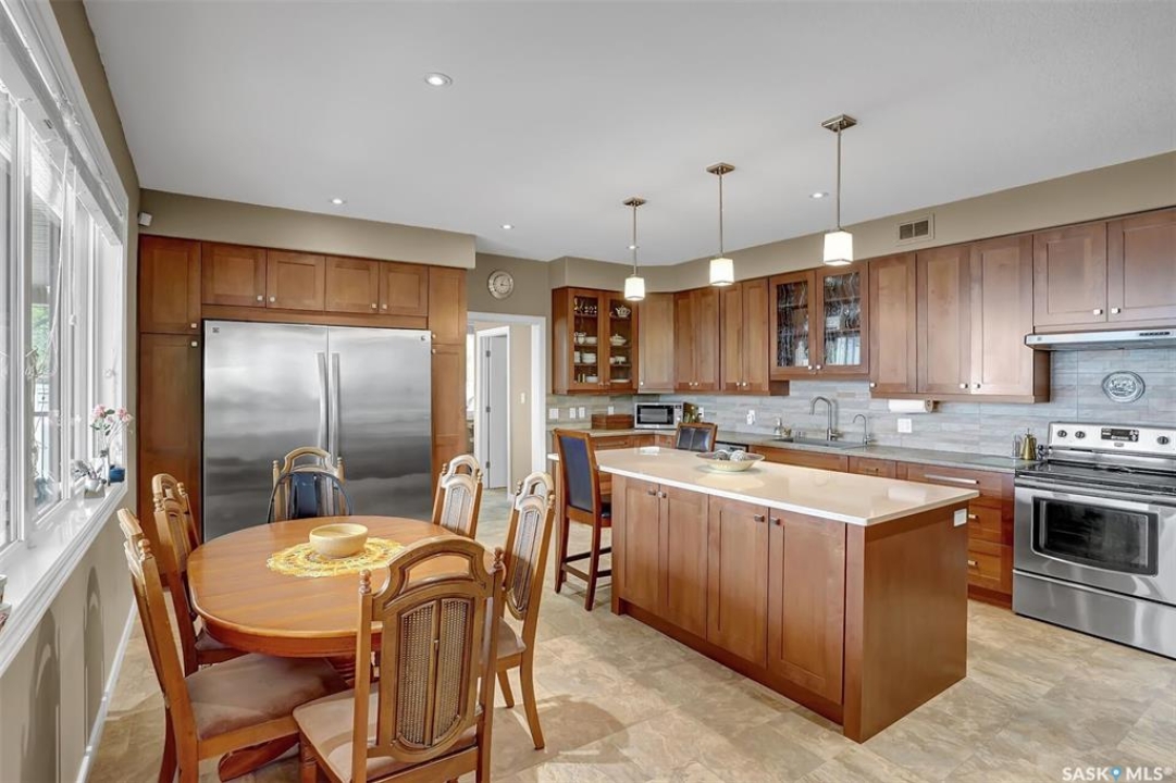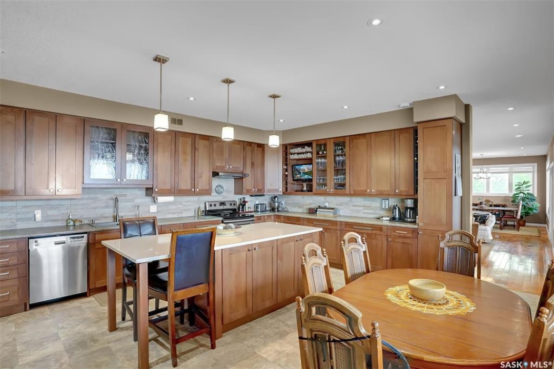 Welcome to 81 Kinsley Place at Mission Lake! WOW! This large walkout delivers incredible, unobstructed views to the lake! This custom, thoughtfully designed home offers an abundance of both luxury and practicality! The main level features 3 good size bedrooms + the primary suite that proudly includes a great 3 pc ensuite, walk in closet, and large windows. The formal dining area is open to the living room with gorgeous hardwood floors. The large kitchen is a chef's dream with nutmeg maple cabinets, large island with a quartz top, S/S appliances (Kenmore Elite freezer/fridge combo), built in pantry with rolling drawers, wine rack, tons of counter space/storage and added pot lights. There is a convenient flex room and 2 pc bath tucked away behind the kitchen. The main bath and ensuite boasts heated flooring. The large laundry room includes the washer and dryer, sink, and more storage capacity. The impressive walkout level showcases an 1800 sq ft suite with a large kitchen with crisp white cabinets, full set of appliances, 3 bedrooms, private laundry room, a full 4 pc bath, and patio doors that lead to a large, private patio space. The exterior of this property includes a retaining wall, swale, garden area, ample parking, and a super impressive covered deck that spans the entire length of the home where you could easily have 75+ people comfortably enjoying the sunrise or the sunsets! There has been many large gatherings and even a few weddings on the property! A large insulated and heated double garage with a workshop completes this property. Other important noteables - steel beam construction, original owners, central vac, central air, air exchanger, original drawings available. A true gem in the land of the living skies!