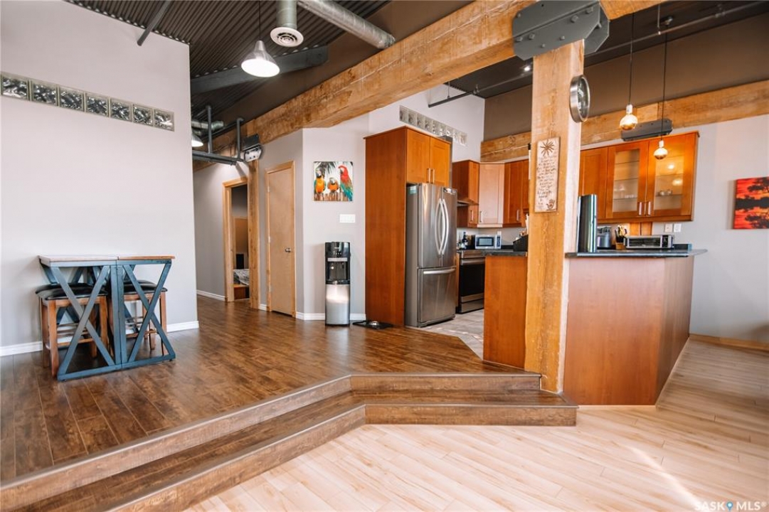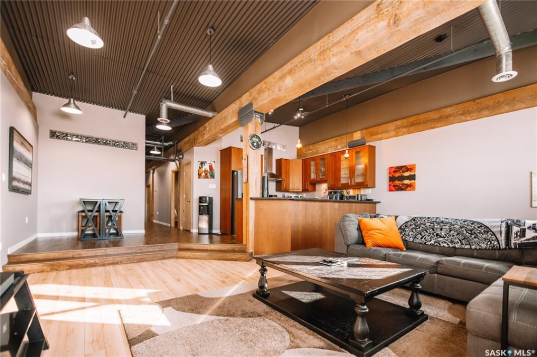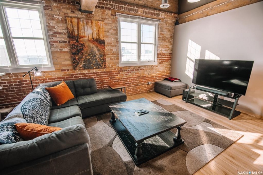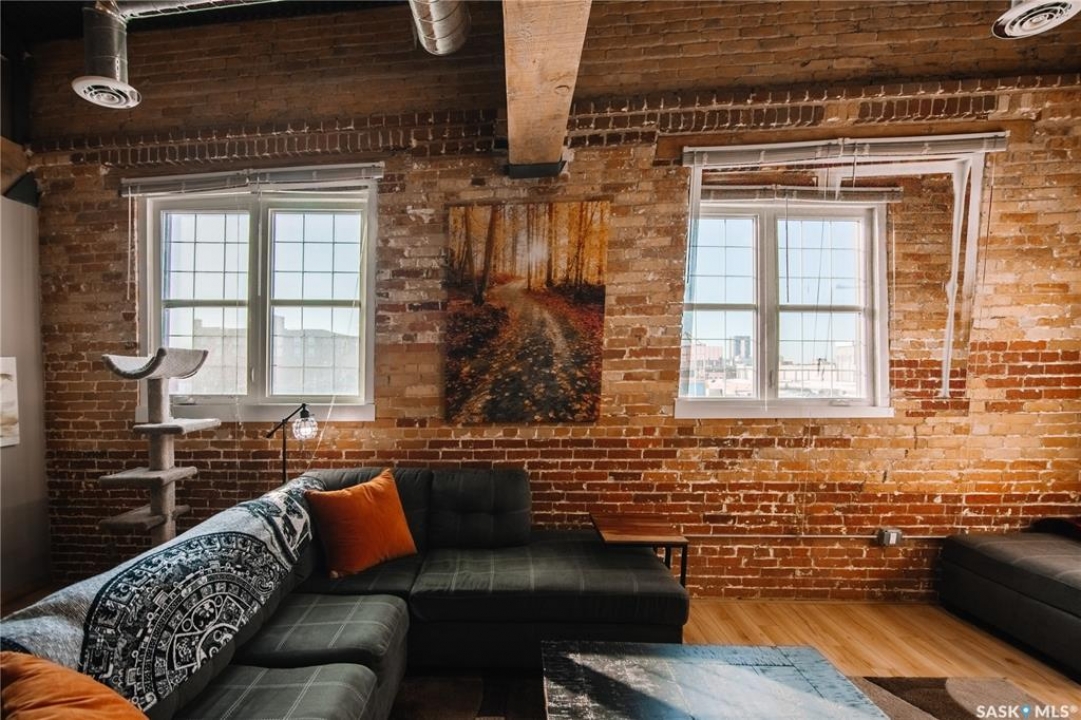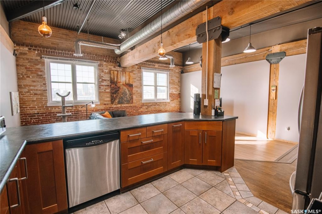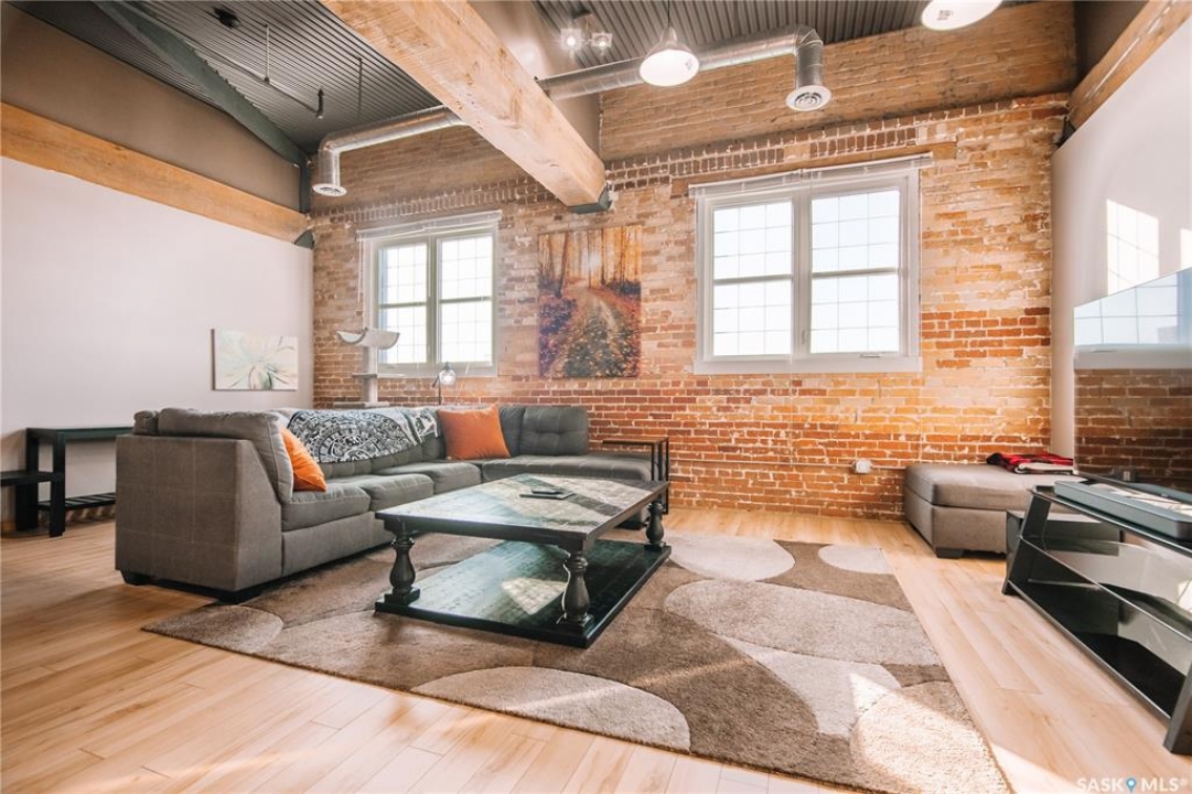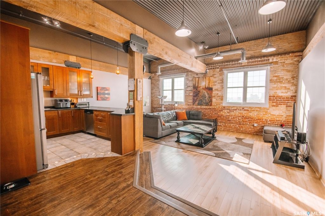 Welcome to this truly one-of-a-kind condo located in the heart of Regina's vibrant Warehouse District. Offering over 1,500 sq. ft. of living space, this rare top-floor unit features three bedrooms and two bathrooms, layout that is seldom found in warehouse-style condominiums. The living room, dining room, and kitchen blend seamlessly together, creating an inviting space perfect for both everyday living and entertaining. Large, newer south-facing windows fill the condo with natural light while offering pleasant views from the top floor. The kitchen is both functional and stylish, featuring maple shaker-style cabinetry, ample counter space, and all included appliances. The open layout allows for easy interaction with guests or family while preparing meals. The primary bedroom is generously sized and includes a walk-in closet along with a private 3-piece ensuite bathroom. Two additional bedrooms provide excellent flexibility for guests, a home office, or additional living space. A full 4-piece bathroom featuring a relaxing jetted tub serves the additional bedrooms. This well-designed unit also includes a dedicated in-suite laundry room, adding everyday convenience and additional storage space. Downstairs in the underground parking area, you'll find a heated parking stall along with an exceptionally large private storage area. This versatile space is perfect for tool benches, a motorbike, seasonal items, or even a hobby workspace, a rare feature that offers incredible flexibility. Recent upgrades include a/c, carpet, stove and windows in 2023. Located in the sought-after Warehouse District, this condo places you steps away from restaurants, coffee shops and downtown amenities, while still providing a comfortable and private living environment. Opportunities like this don't come along often. With its spacious layout, rare three-bedroom design, and unbeatable location, this condo is truly a unique offering in one of Regina's most character-filled neighbourhoods.