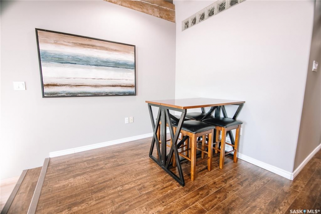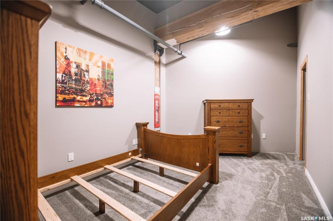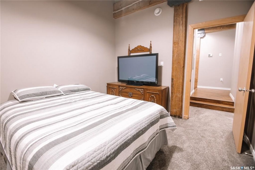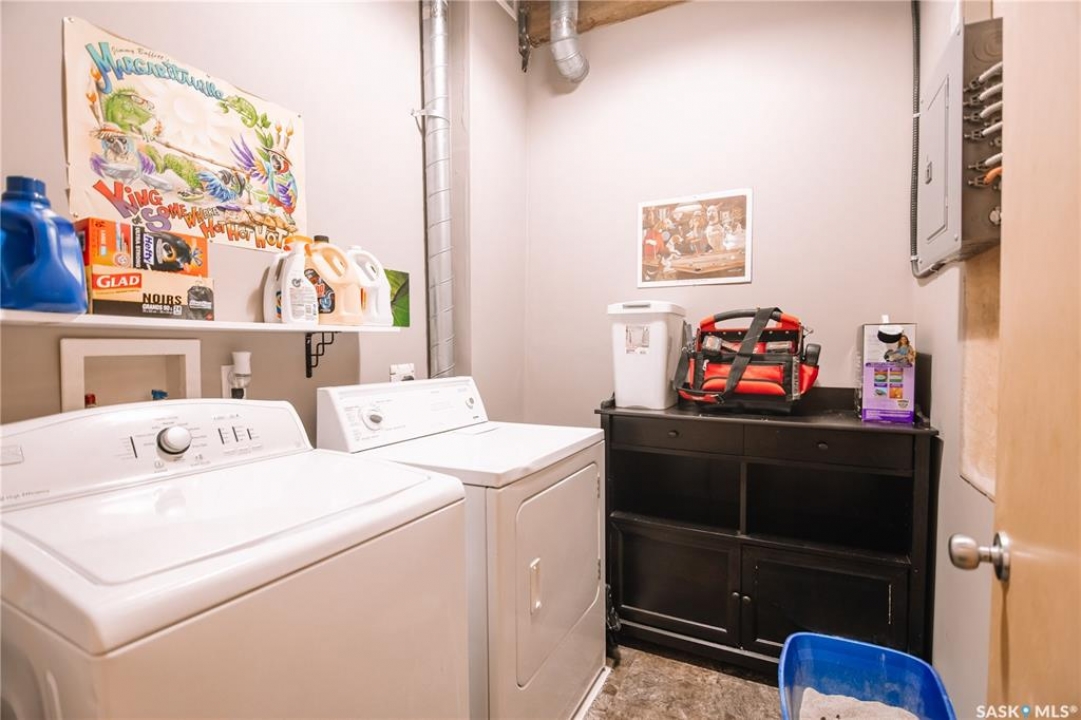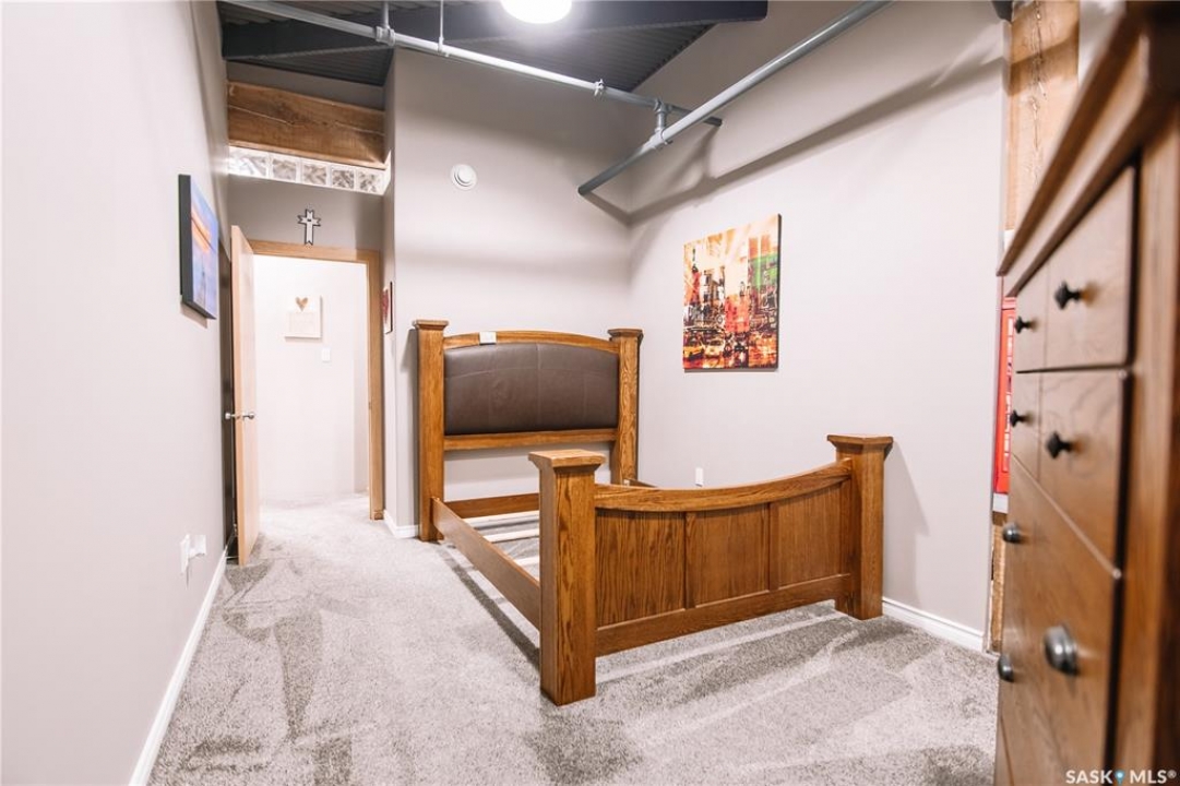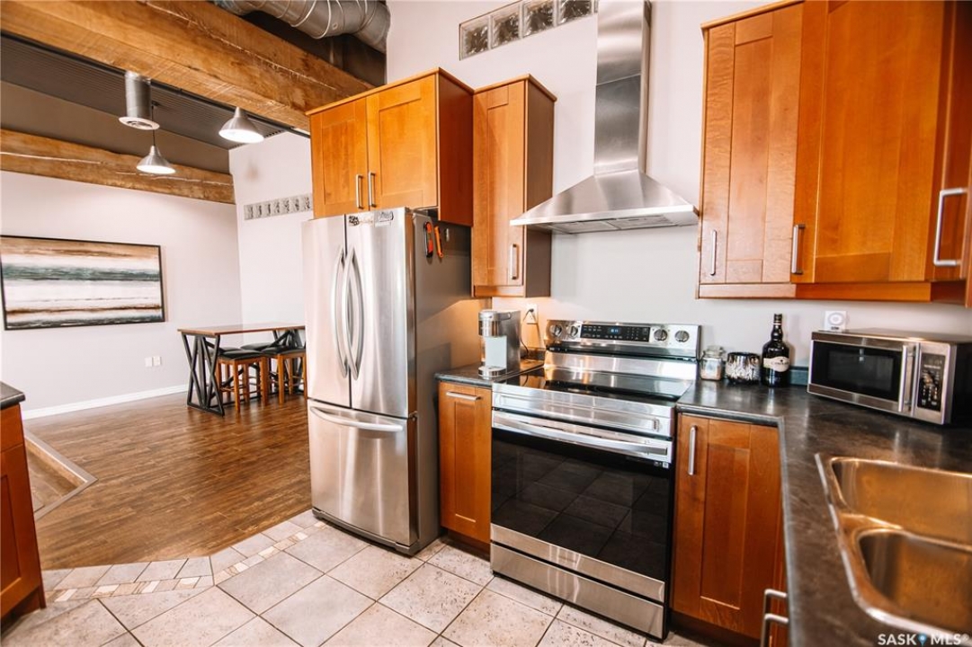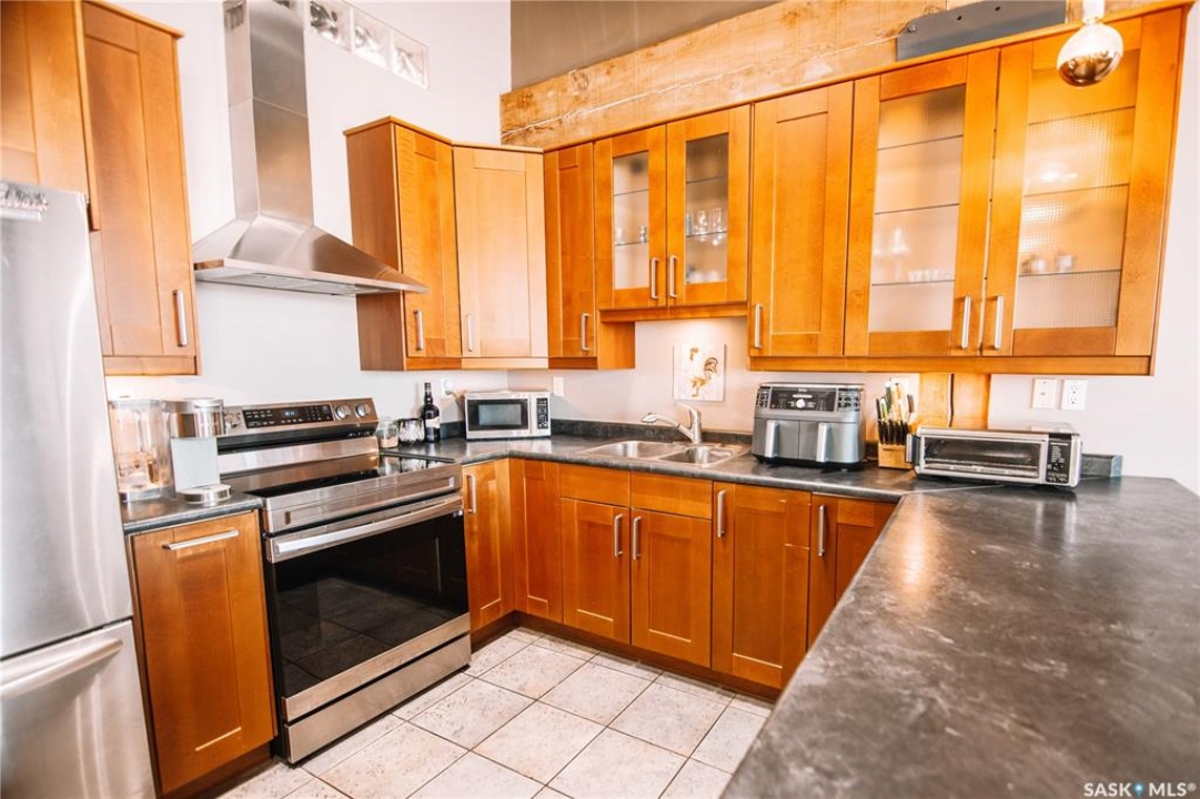 Welcome to this truly one-of-a-kind condo located in the heart of Regina's vibrant Warehouse District. Offering over 1,500 sq. ft. of living space, this rare top-floor unit features three bedrooms and two bathrooms, layout that is seldom found in warehouse-style condominiums. The living room, dining room, and kitchen blend seamlessly together, creating an inviting space perfect for both everyday living and entertaining. Large, newer south-facing windows fill the condo with natural light while offering pleasant views from the top floor. The kitchen is both functional and stylish, featuring maple shaker-style cabinetry, ample counter space, and all included appliances. The open layout allows for easy interaction with guests or family while preparing meals. The primary bedroom is generously sized and includes a walk-in closet along with a private 3-piece ensuite bathroom. Two additional bedrooms provide excellent flexibility for guests, a home office, or additional living space. A full 4-piece bathroom featuring a relaxing jetted tub serves the additional bedrooms. This well-designed unit also includes a dedicated in-suite laundry room, adding everyday convenience and additional storage space. Downstairs in the underground parking area, you'll find a heated parking stall along with an exceptionally large private storage area. This versatile space is perfect for tool benches, a motorbike, seasonal items, or even a hobby workspace, a rare feature that offers incredible flexibility. Recent upgrades include a/c, carpet, stove and windows in 2023. Located in the sought-after Warehouse District, this condo places you steps away from restaurants, coffee shops and downtown amenities, while still providing a comfortable and private living environment. Opportunities like this don't come along often. With its spacious layout, rare three-bedroom design, and unbeatable location, this condo is truly a unique offering in one of Regina's most character-filled neighbourhoods.