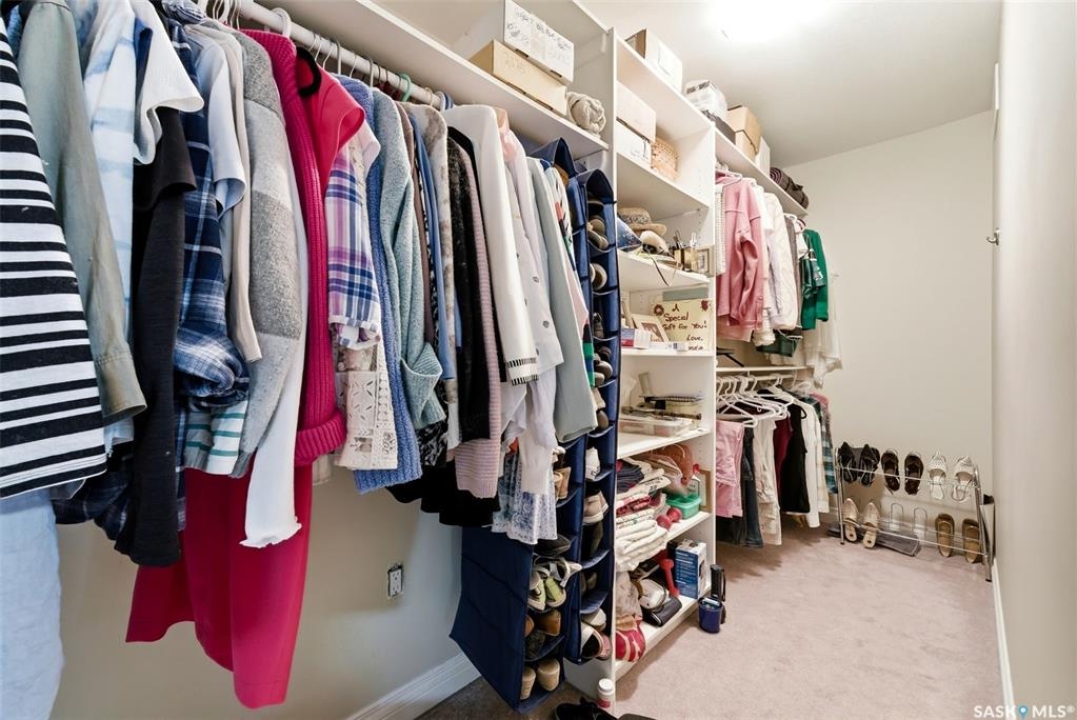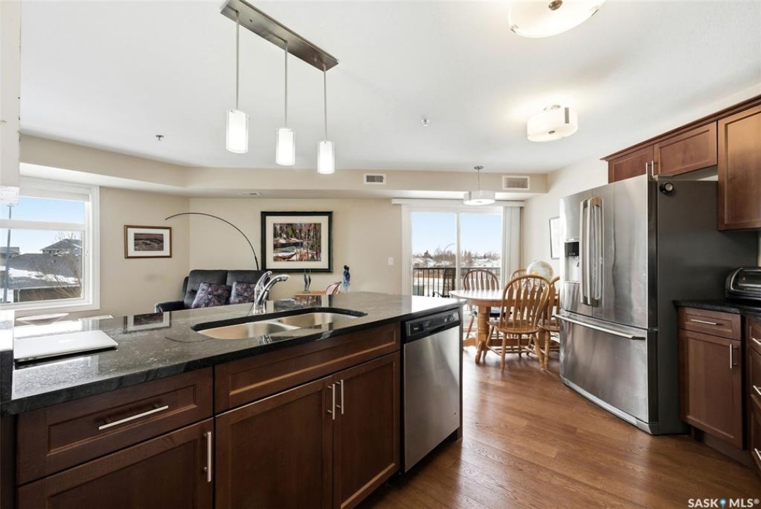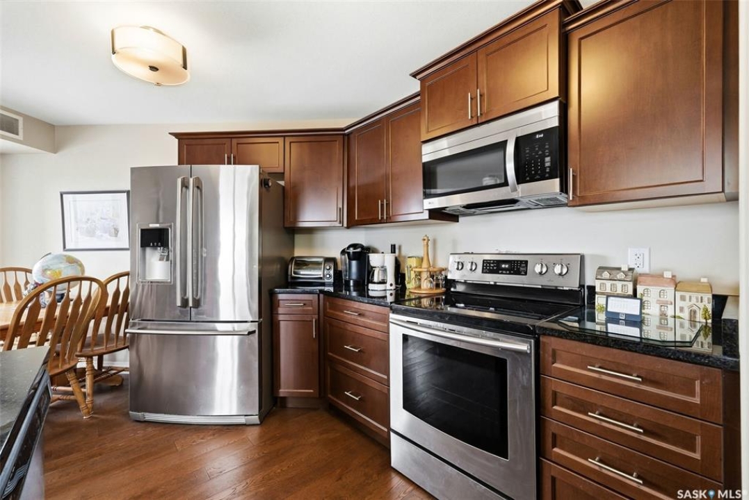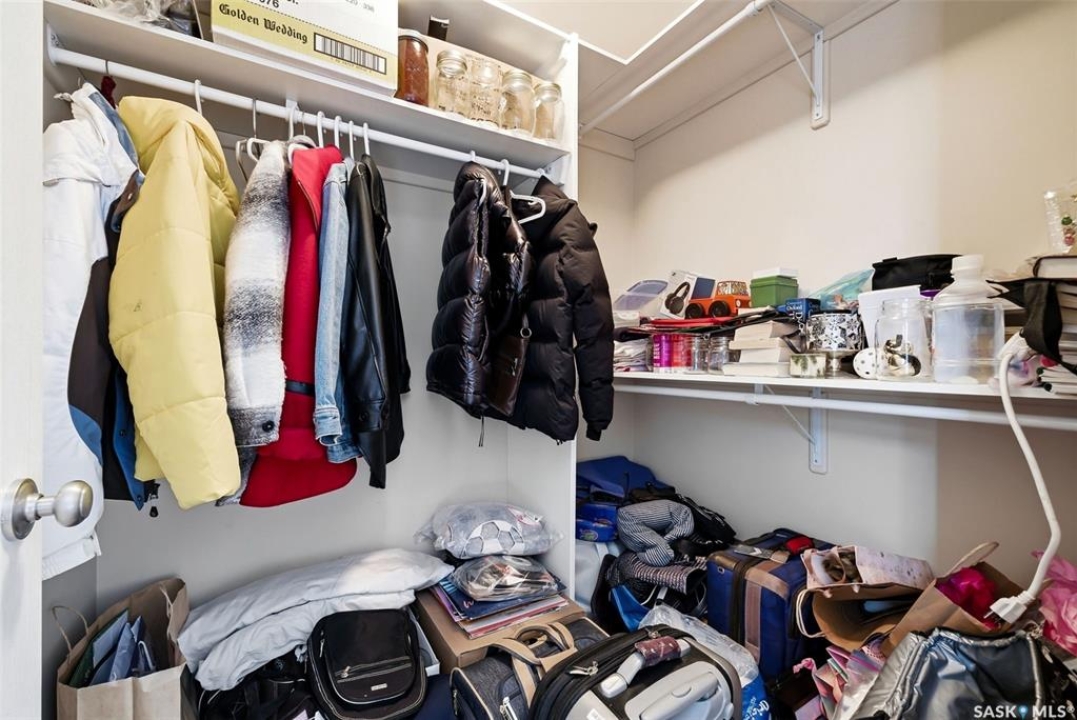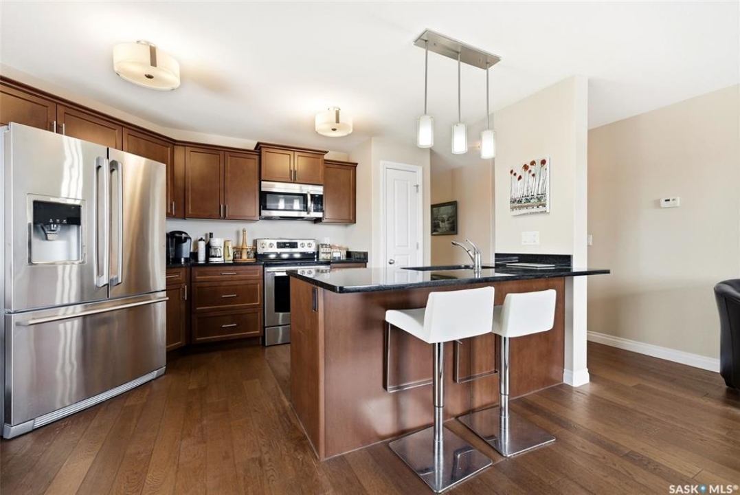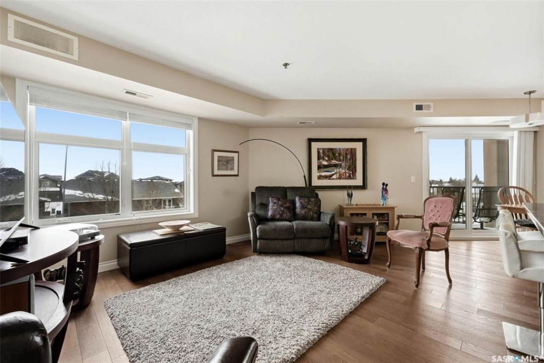 A very bright and spacious 2nd floor corner unit in the Haughton Villas. A very unique building that includes a shared courtyard and great common spaces. Well located in Regina's East End close to parks, Prince of Wales Drive and plenty of restaurants and shopping. This two bedroom, two bathroom unit welcomes you with a spacious foyer and a well-laid out floor plan. The 2nd bedroom (with walk-in closet) and full bathroom are located away from the rest of the unit, perfect for guests. The main living room, kitchen and dining space have a great natural light. Easy access to the corner balcony and storage room. The large master suite has a massive walk-in closet and full ensuite with shower. In suite laundry room. One heated underground parking stall and an oversized storage space are included with this unit. Condos fees of $547.75 include water (building has central, shared water heater). Unit has it's own furnace and central air conditioning.