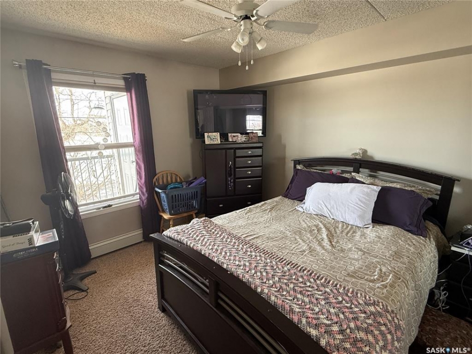 Fantastic 2 bedroom, 1 bathroom condo located on the second floor with desirable west-facing exposure! This bright and inviting unit offers a spacious open-concept layout with a cozy living room, room for a dining table, and a functional kitchen featuring plenty of cabinet space. One of the standout features is the spacious in-suite laundry room with a spot for a freezer and additional storage, plus multiple storage closets throughout the unit, giving you exceptional room to stay organized. Step outside to the generous west-facing balcony, the perfect spot to relax and enjoy the evening sun, complete with its own storage closet. The building offers secure access with an intercom system, elevator service, and one assigned parking stall in the heated main-floor garage. You'll also enjoy the beautifully updated lobby and common room, ideal for hosting visitors or family gatherings. This well-established building is known for its strong sense of community and many long-term residents, reflecting true pride of ownership. Moderate condo fees include heat and water, and there is ample visitor parking available in the exterior lot. A fantastic opportunity for comfortable, low-maintenance living in a welcoming and well-cared-for building!