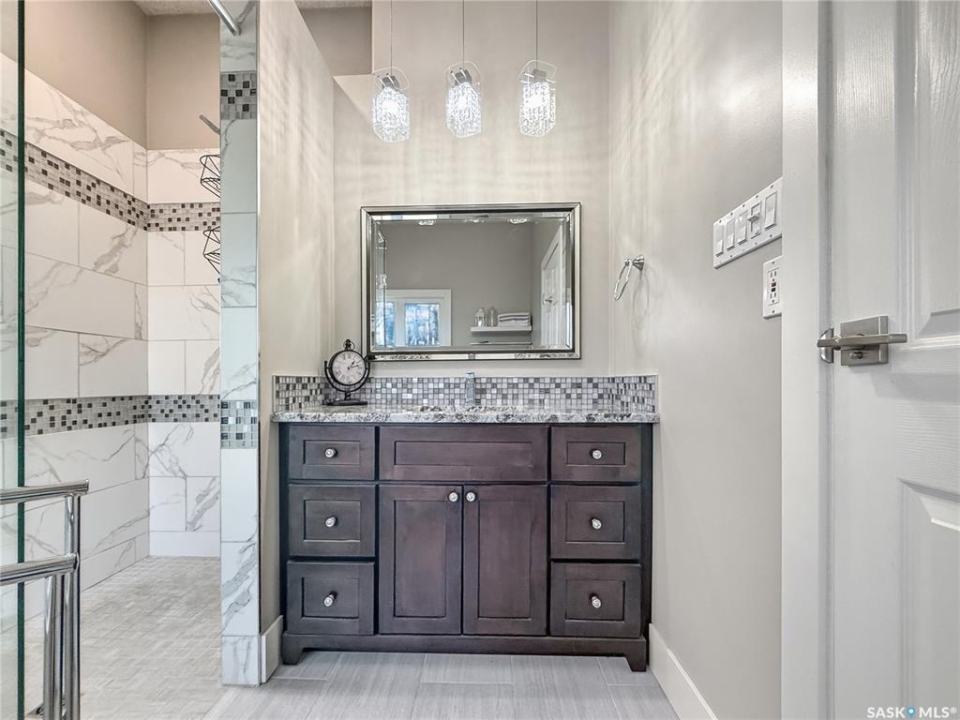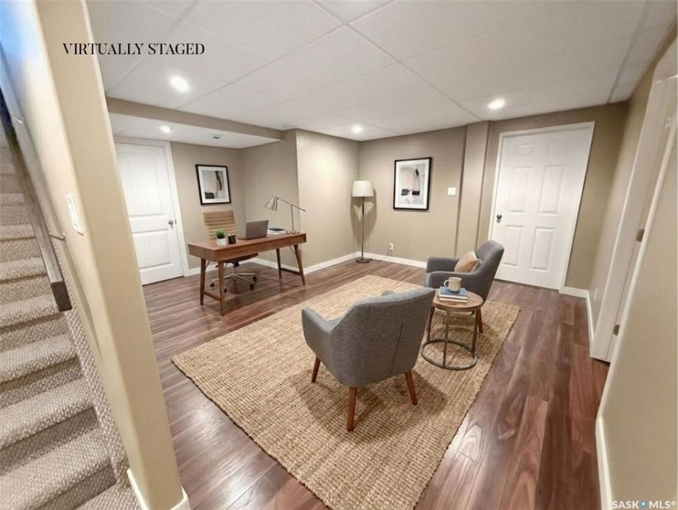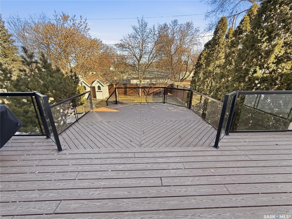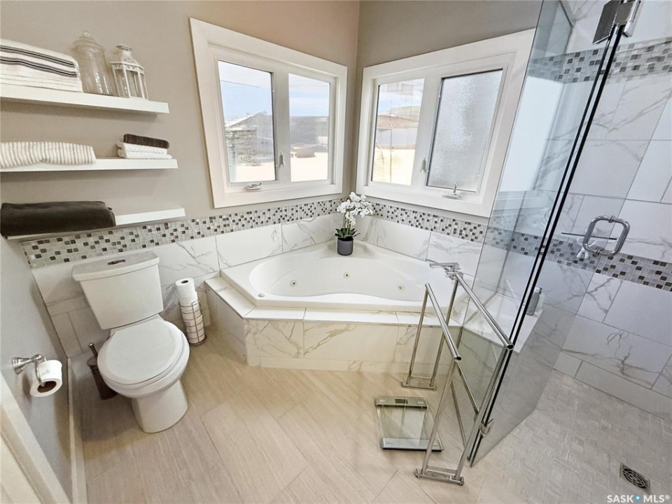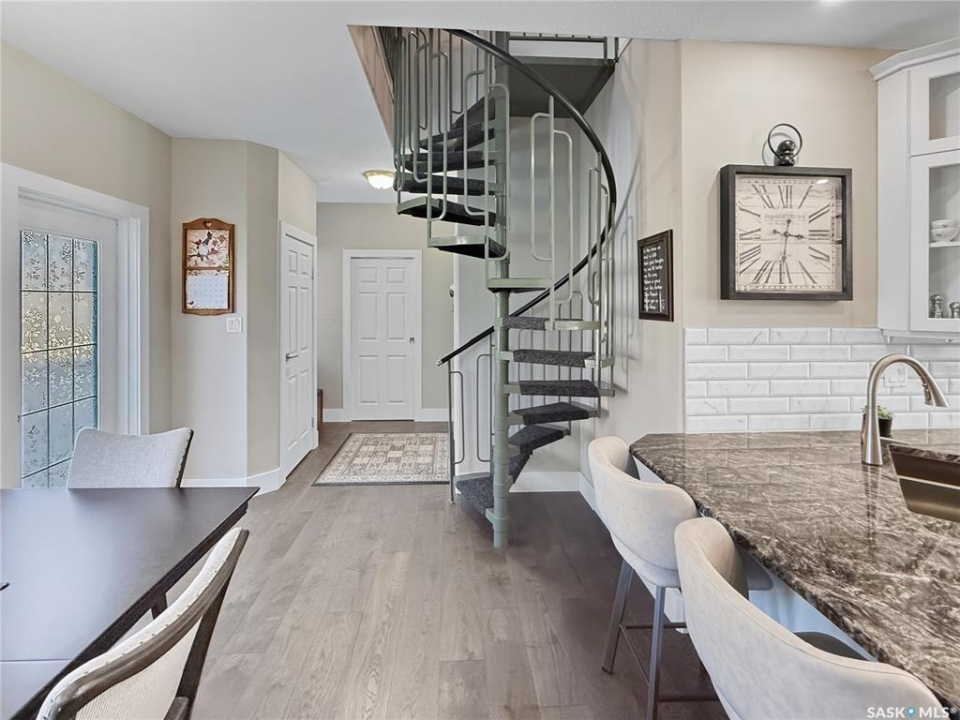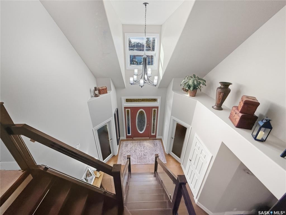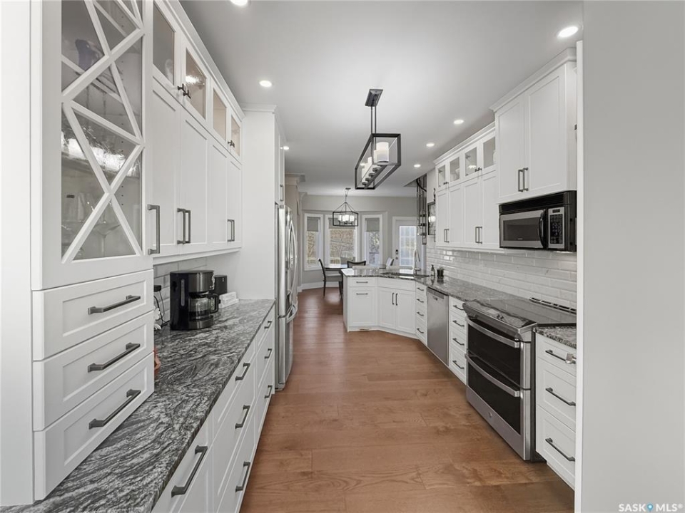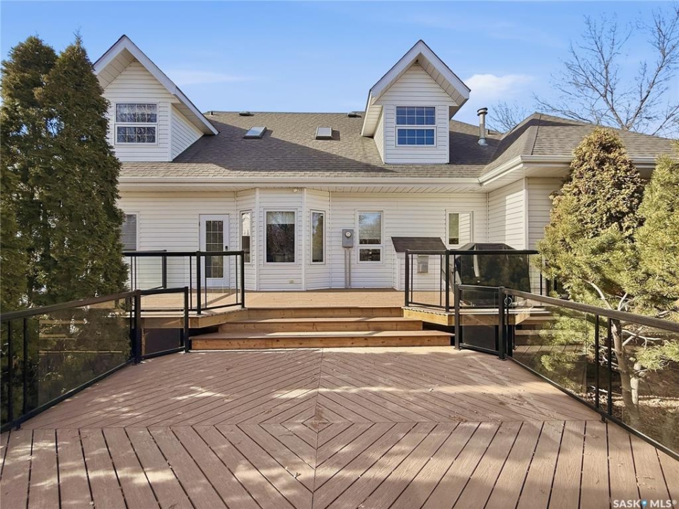 Executive two-storey home located on a quiet cul-de-sac in Swift Current's desirable North Hill neighbourhood. Situated on a mature, oversized pie-shaped lot, this beautifully maintained property offers over 2,400 sq ft above grade with a layout ideal for both everyday living and entertaining. A grand staircase welcomes you into an impressive foyer featuring 10' ceilings, crown moulding, and engineered hardwood flooring. The main floor includes a private office with French doors, a formal dining room filled with natural light, and a spacious living room with updated windows, quality blinds, silk curtains, and a cozy gas fireplace. The fully renovated kitchen (2019) showcases white cabinetry, granite countertops, tile backsplash, under-cabinet lighting, and stainless steel appliances including a double-oven slide-in range. A sit-up peninsula and bright east-facing dining nook provide access to the composite deck and backyard. Main floor laundry, a powder room, and direct entry to the attached garage add everyday convenience. The main floor primary suite offers privacy with a walk-in closet and renovated ensuite featuring granite counters, an oversized custom shower, and a corner jetted tub. Upstairs features a large family room with skylights overlooking the foyer, two spacious bedrooms with a generous Jack & Jill closet, and a full bathroom. The fully developed lower level includes a family room, two bedrooms, a three-piece bath, dance studio/flex space, storage rooms, and access to the lower-level garage. Parking and storage are exceptional with a front attached double garage plus a second garage with alley access—ideal for extra vehicles, hobbies, or workshop space. The private east-facing backyard offers mature landscaping, an oversized tiered composite deck, underground sprinklers on timers, and space to build an additional garage if desired. Shingles replaced in 2024.