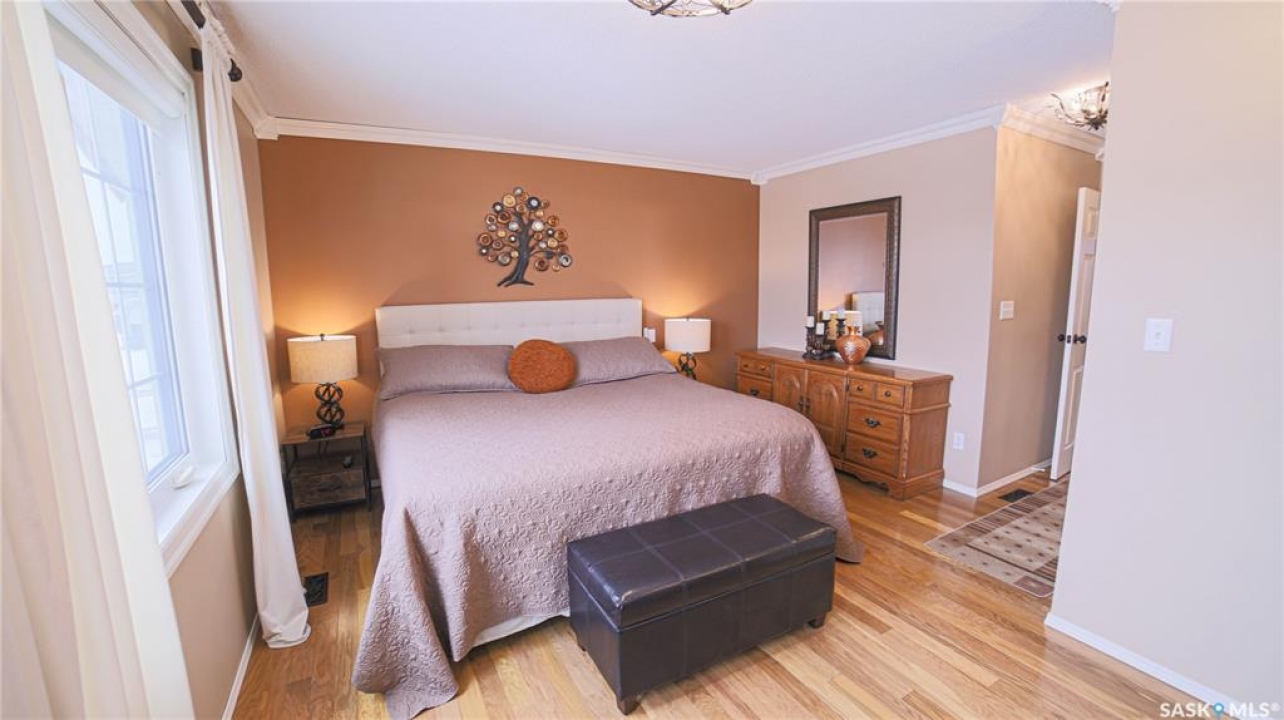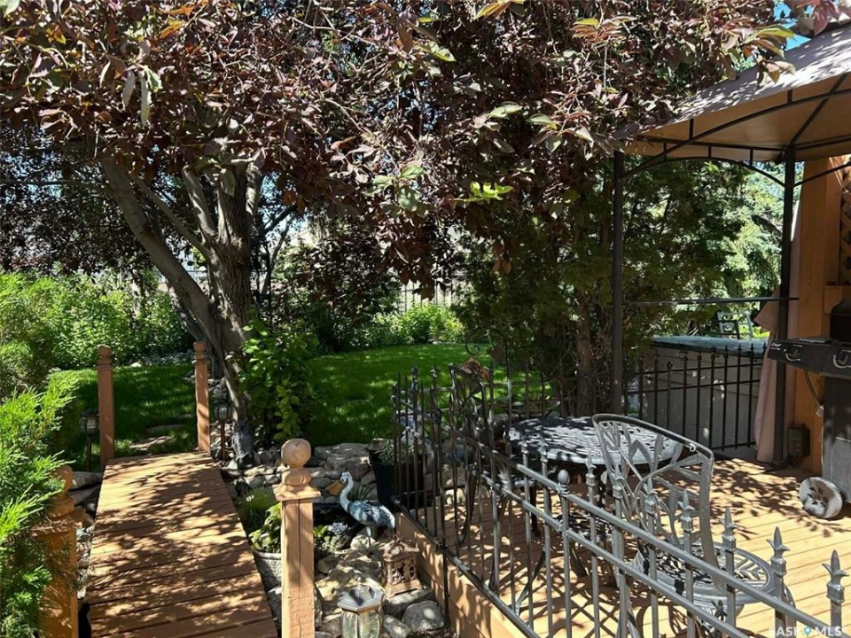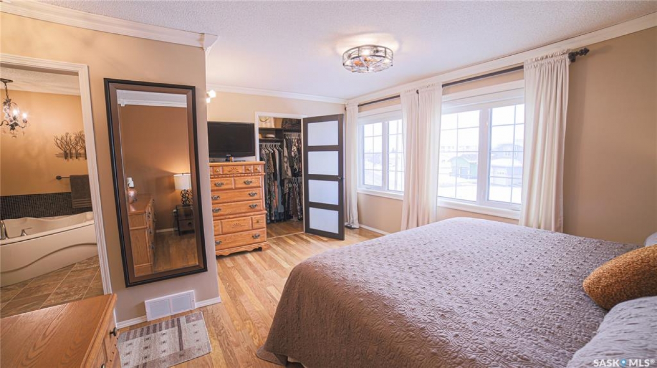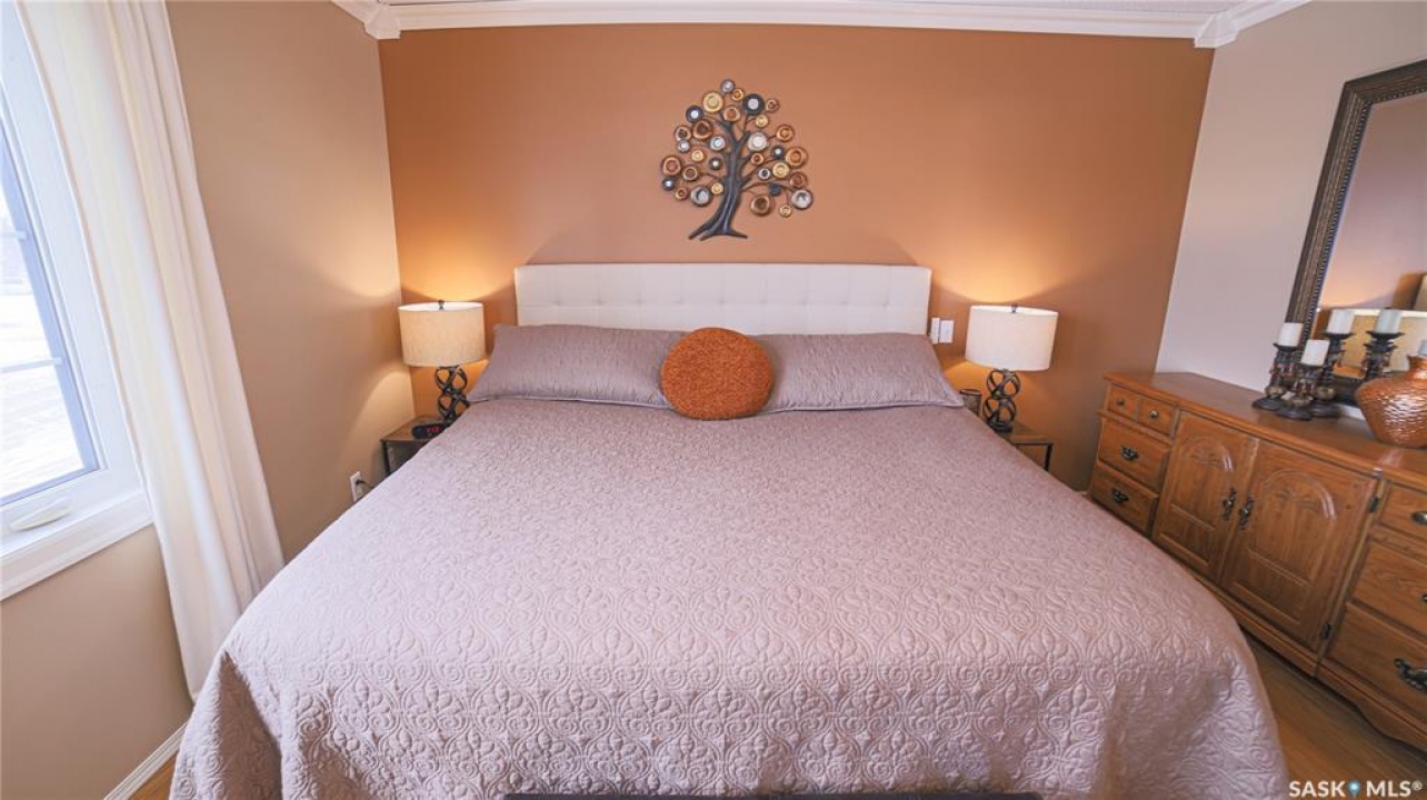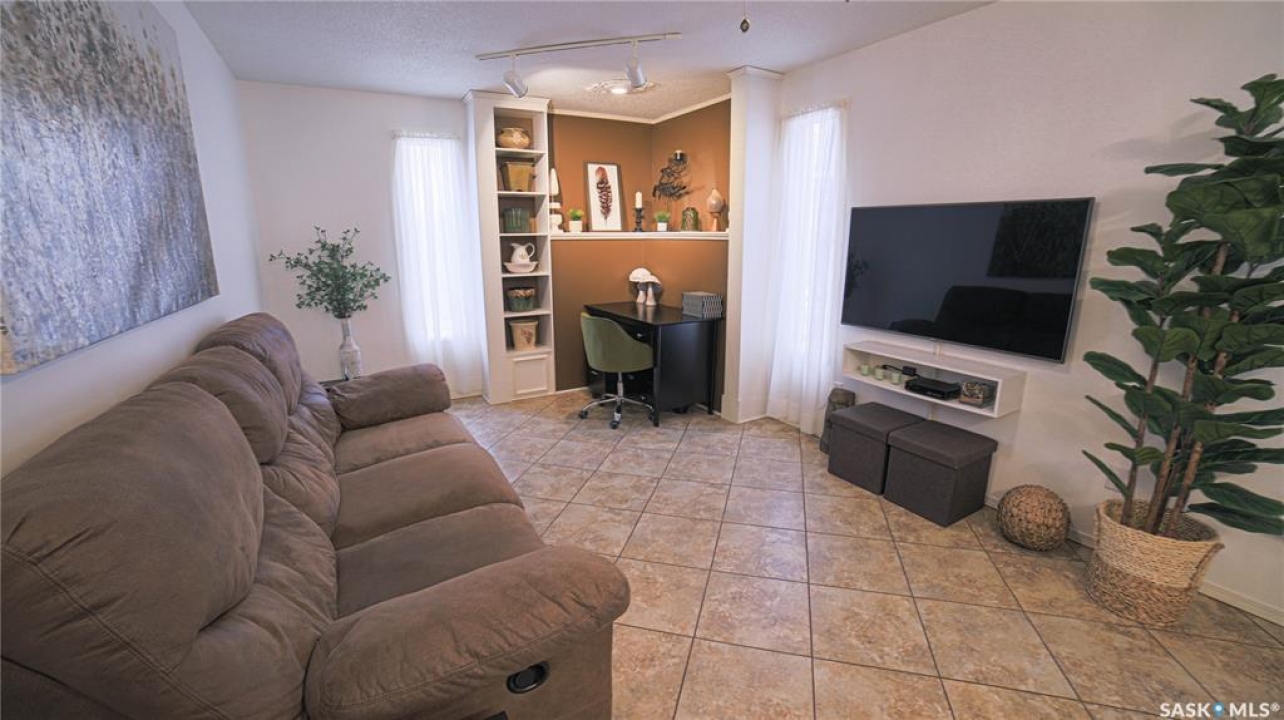 This exceptional home is a rare find in one of Estevan's most desirable neighbourhoods. Offering over 2,000 sq. ft. of living space above grade, this beautifully maintained property stands apart from the ordinary with its thoughtful layout and immaculate condition inside and out. Step into the spacious front foyer where you're immediately welcomed by soaring vaulted ceilings in the bright front living room, creating an impressive first impression. The living room flows seamlessly into the large formal dining area, perfect for entertaining. The eat-in kitchen is ideally situated between the dining room and a cozy secondary living space, providing the perfect spot to relax with family. From here, patio doors lead to the incredible backyard featuring a covered deck, mature trees, and lush foliage that creates exceptional privacy throughout the summer months. A convenient two-piece powder room and direct access to the attached double garage complete the main floor. Upstairs you'll find three generous bedrooms plus a versatile bonus room that would make an ideal playroom, office, or hobby space. The spacious primary suite features a walk-in closet and a stunning five-piece ensuite complete with a heated whirlpool tub. A second full bathroom and conveniently located laundry complete the upper level. The fully developed basement is an entertainer's dream, offering a large gathering space perfect for a dining area or pool table, a wet bar, comfortable family room with gas stove, and an additional two-piece bathroom. It's large enough for hosting gatherings while still providing a cozy space for family movie nights. Meticulously maintained from top to bottom, this one-of-a-kind home offers space, comfort, and exceptional care in every detail.