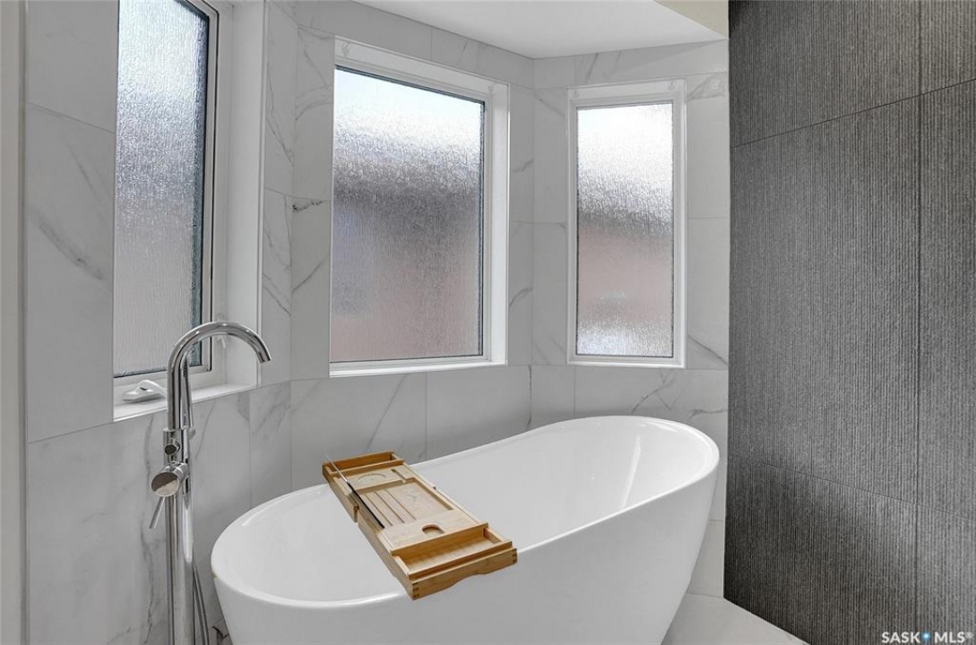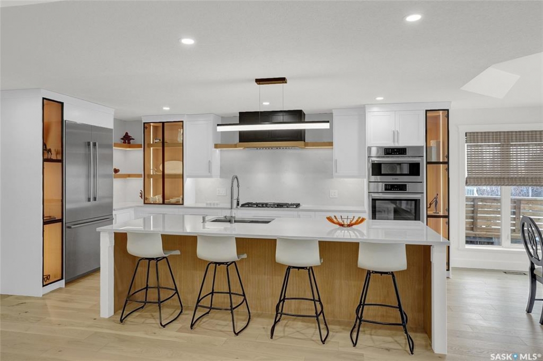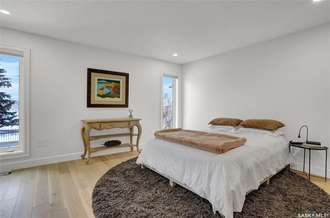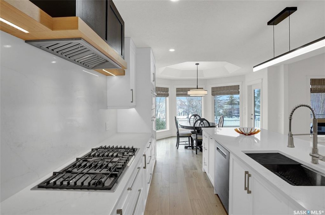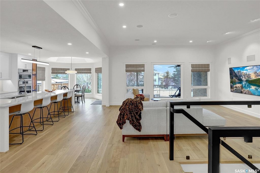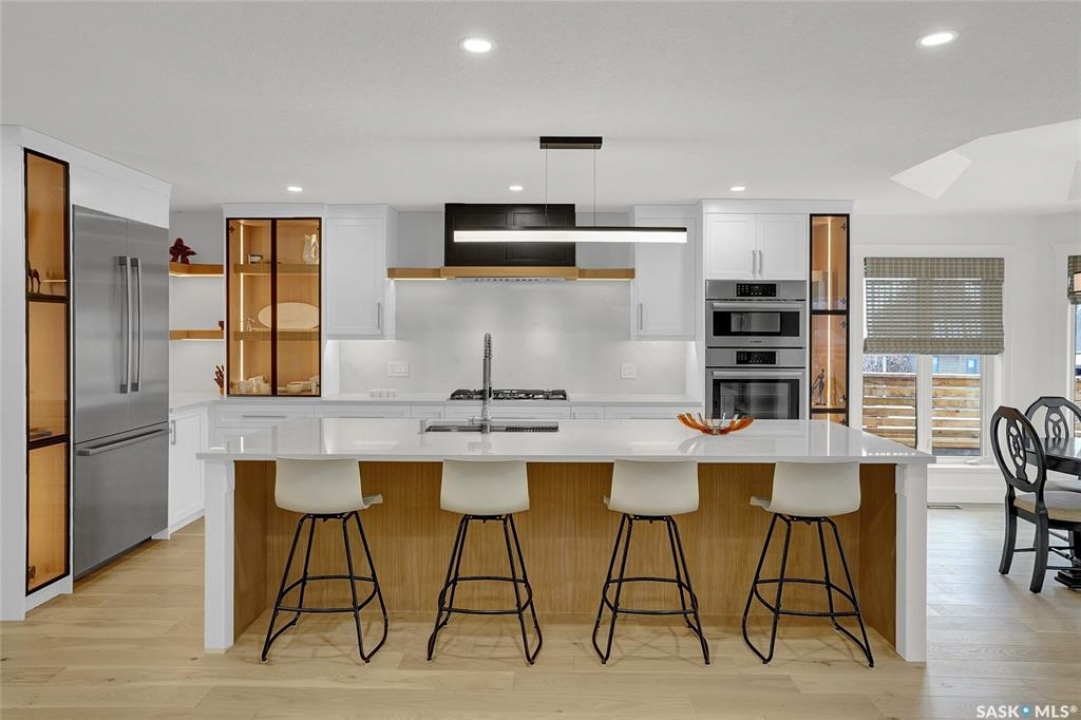 Absolutely stunning 1,922 sq. ft. bungalow backing onto a park in Wascana View. This beautifully updated home offers a bright, open-concept floor plan and has undergone extensive main floor renovations. The main level features all new flooring with white engineered oak by Burkhardt Bros., including custom stair nosing, along with new tile flooring in the bathrooms and mudroom. The completely renovated dream kitchen showcases custom cabinetry by Grace & Mave, a Kraus sink, large island with quartz countertops and quartz backsplash wall, glass accent cabinets, floating shelves, and high-end Bosch stainless steel appliances including a gas cooktop. A spacious eating area overlooks the backyard and park, with a garden door leading to a screened-in deck, perfect for relaxing or entertaining. A formal dining room or main floor office adds flexibility to the layout. The main floor also features all new lighting and updated 6-inch baseboards throughout. The large primary bedroom includes a custom Clutter-X closet and a beautifully renovated spa-like ensuite featuring a dual-sink vanity with automatic under-cabinet lighting, heated tile floors, large zero-entry glass shower, freestanding tub, and private water closet. The second bedroom offers two closets and direct access to the main floor stylish three-piece bathroom. New glass railing, new woodwork and white oak HW on stairs to lower level that is partially developed with a third bedroom, den, and full bathroom offering plenty of additional living space. Additional highlights include a spacious mudroom/laundry area with new tile flooring and cabinetry and direct entry to the insulated and drywalled double attached garage. This is truly a wonderful home in show home condition!