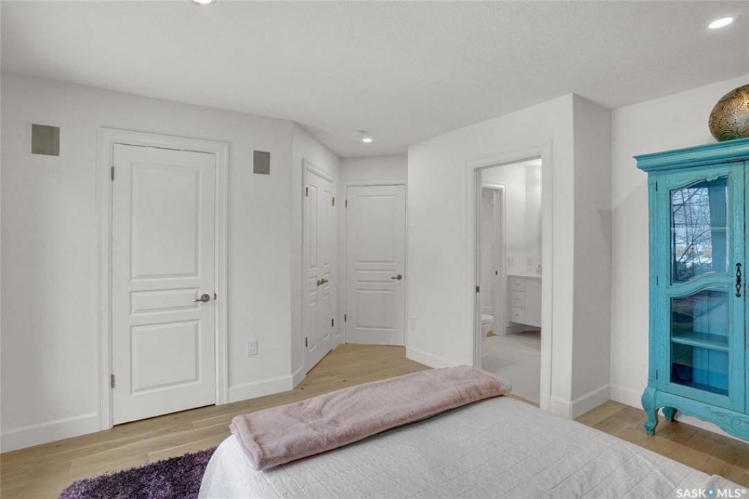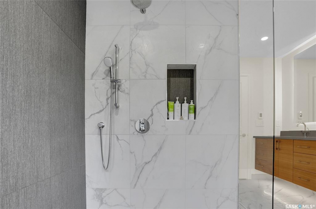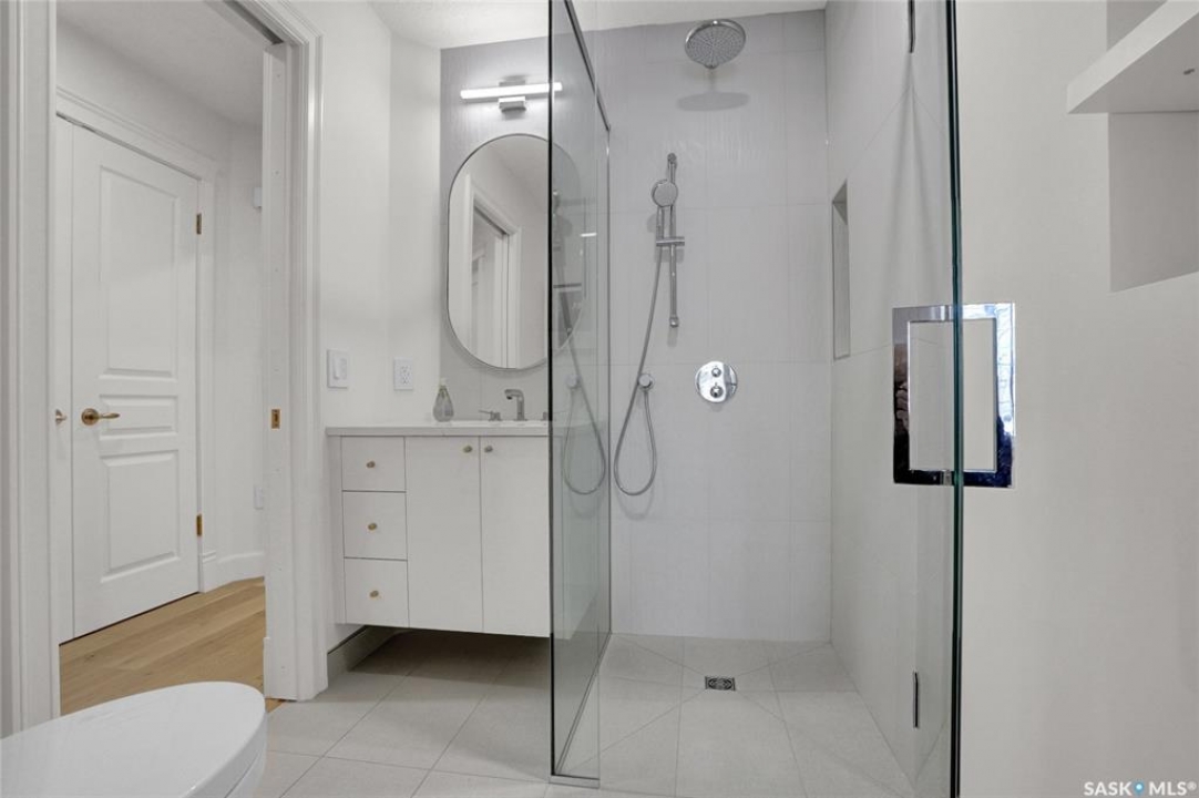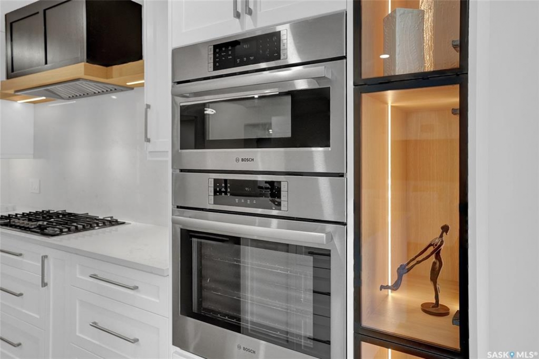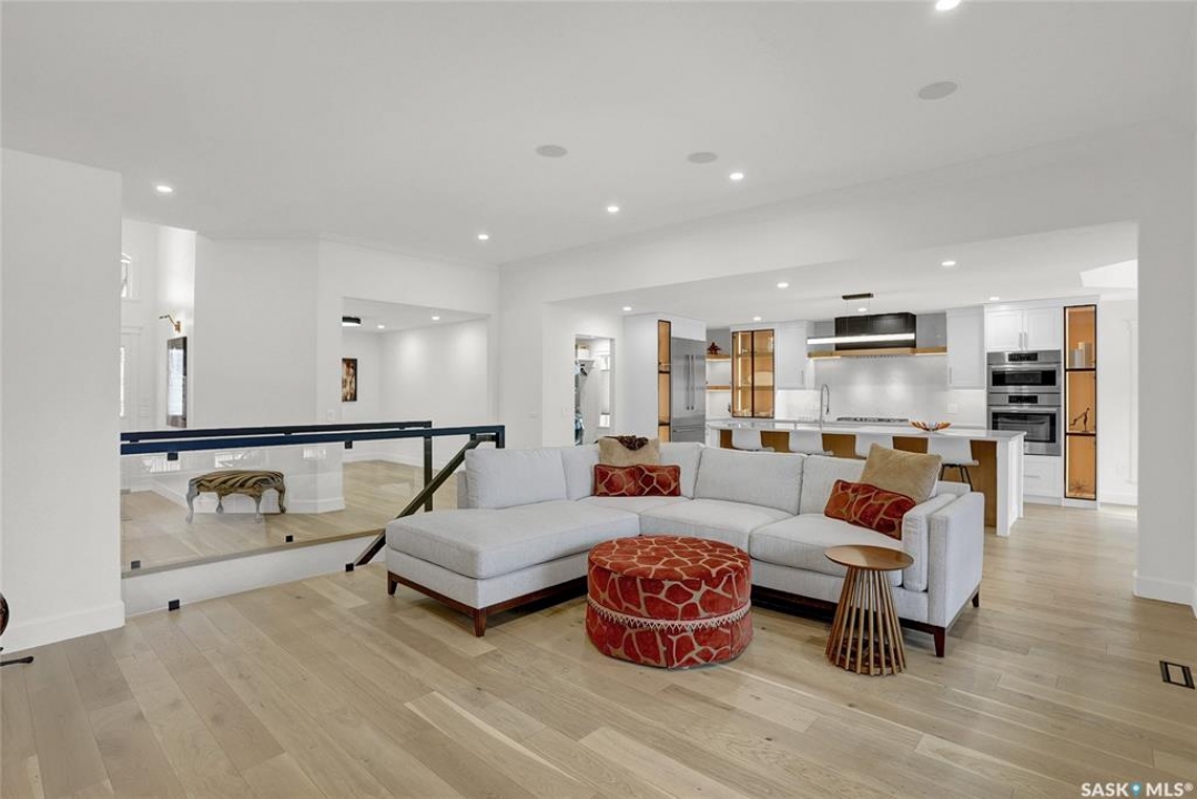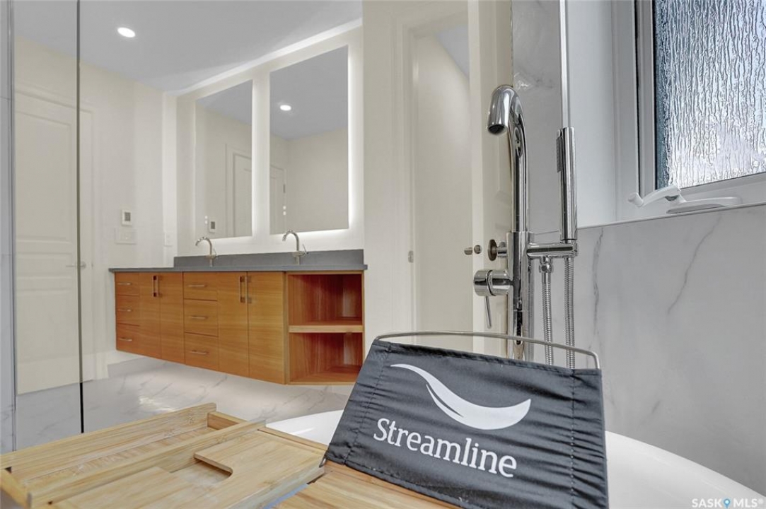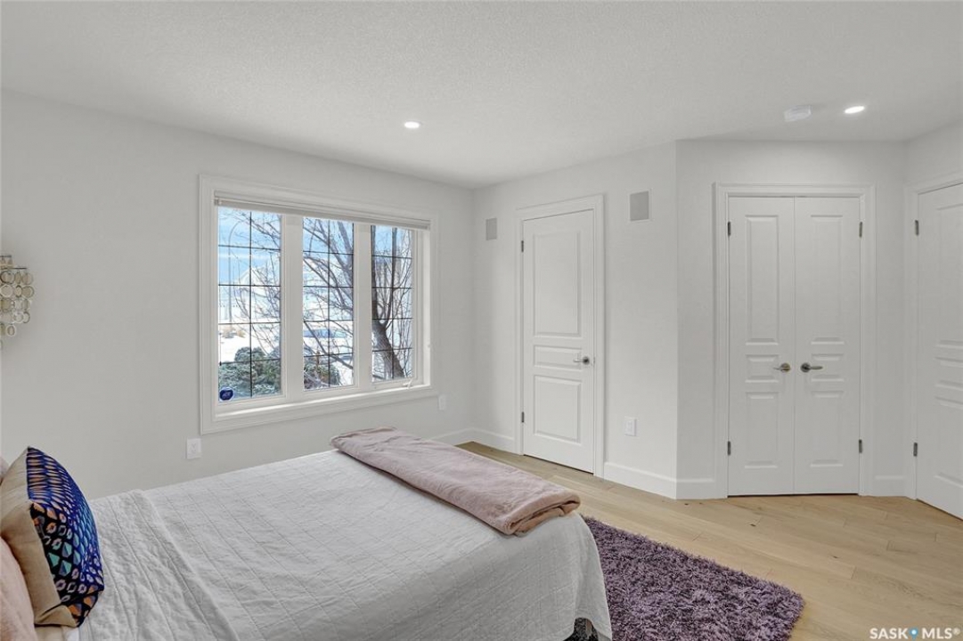 Absolutely stunning 1,922 sq. ft. bungalow backing onto a park in Wascana View. This beautifully updated home offers a bright, open-concept floor plan and has undergone extensive main floor renovations. The main level features all new flooring with white engineered oak by Burkhardt Bros., including custom stair nosing, along with new tile flooring in the bathrooms and mudroom. The completely renovated dream kitchen showcases custom cabinetry by Grace & Mave, a Kraus sink, large island with quartz countertops and quartz backsplash wall, glass accent cabinets, floating shelves, and high-end Bosch stainless steel appliances including a gas cooktop. A spacious eating area overlooks the backyard and park, with a garden door leading to a screened-in deck, perfect for relaxing or entertaining. A formal dining room or main floor office adds flexibility to the layout. The main floor also features all new lighting and updated 6-inch baseboards throughout. The large primary bedroom includes a custom Clutter-X closet and a beautifully renovated spa-like ensuite featuring a dual-sink vanity with automatic under-cabinet lighting, heated tile floors, large zero-entry glass shower, freestanding tub, and private water closet. The second bedroom offers two closets and direct access to the main floor stylish three-piece bathroom. New glass railing, new woodwork and white oak HW on stairs to lower level that is partially developed with a third bedroom, den, and full bathroom offering plenty of additional living space. Additional highlights include a spacious mudroom/laundry area with new tile flooring and cabinetry and direct entry to the insulated and drywalled double attached garage. This is truly a wonderful home in show home condition!