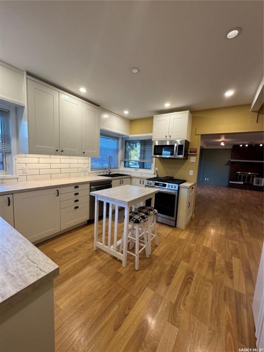 Timeless Character Meets Modern Luxury! Step into a home where character, comfort, & thoughtful design come together beautifully. This stunning 3-bedroom, 2-bath residence offers inviting spaces, quality updates, & unique architectural charm throughout. The beautifully renovated kitchen is the heart of the home, featuring stylish cabinetry, elegant countertops, a spacious island, & a custom built-in coffee bar. A cozy breakfast nook creates the perfect spot for morning coffee while natural light fills the space. Included appliances feature a natural gas stove, refrigerator, microwave fan, and dishwasher. Designed for both everyday living and entertaining, the open-concept dining and living area showcases a charming built-in china cabinet, creating a warm and welcoming atmosphere for gatherings with family and friends. A dramatic recreational room with vaulted ceilings and expansive windows floods the home with natural light and offers an impressive space for relaxing or entertaining. The spiral staircase leads to a charming sitting area or private office retreat—an ideal place to unwind while enjoying breathtaking views of the Northern Lights dancing across the night sky.The finished basement provides exceptional versatility with a spacious bedroom, a stylish three-piece bath, and a large rumpus room perfect for family activities or hosting guests. A rare and highly desirable feature is the attached triple-car garage (13'x34' +19'x42'),complete with in-floor heating, a private bathroom, and a workbench with sink-perfect for hobbyists, car enthusiasts, or additional workspace. Outdoors, the property continues to impress with a beautiful front-yard fountain, raised garden beds, and a backyard oasis that includes a greenhouse and workshop, offering endless possibilities for gardening, creativity, and relaxation.This exceptional home offers space, charm, & distinctive features rarely found in one property. Experience it for yourself—schedule your private viewing today.