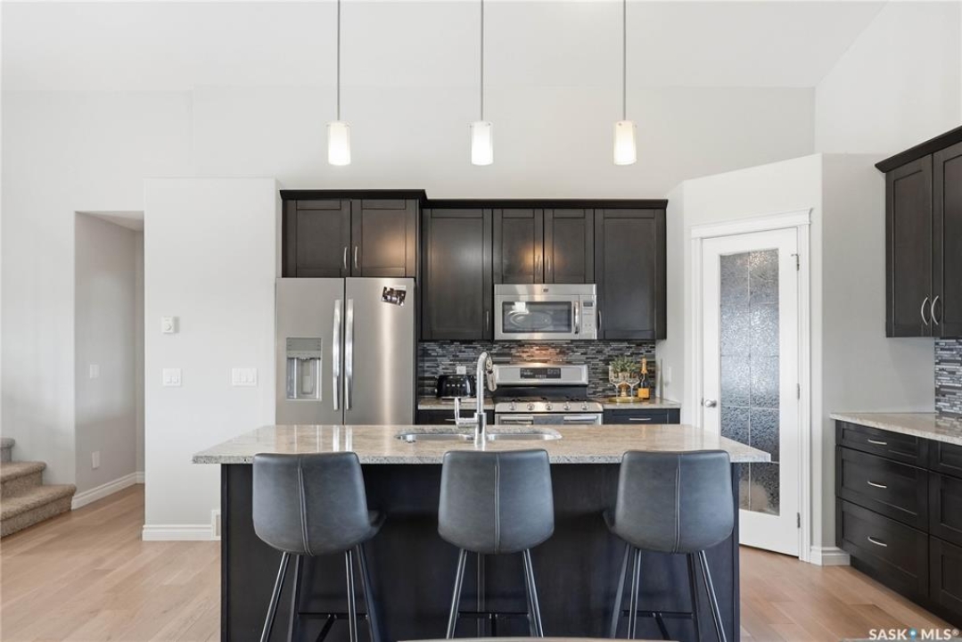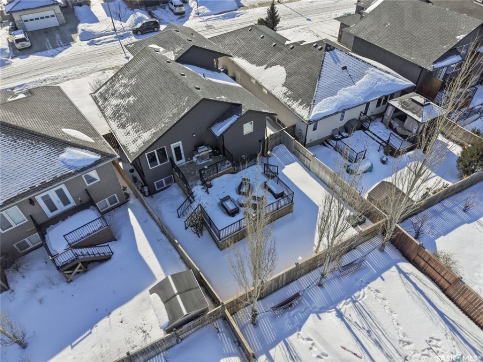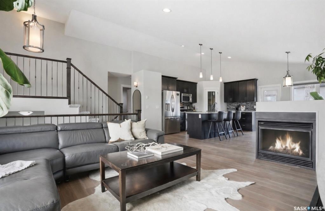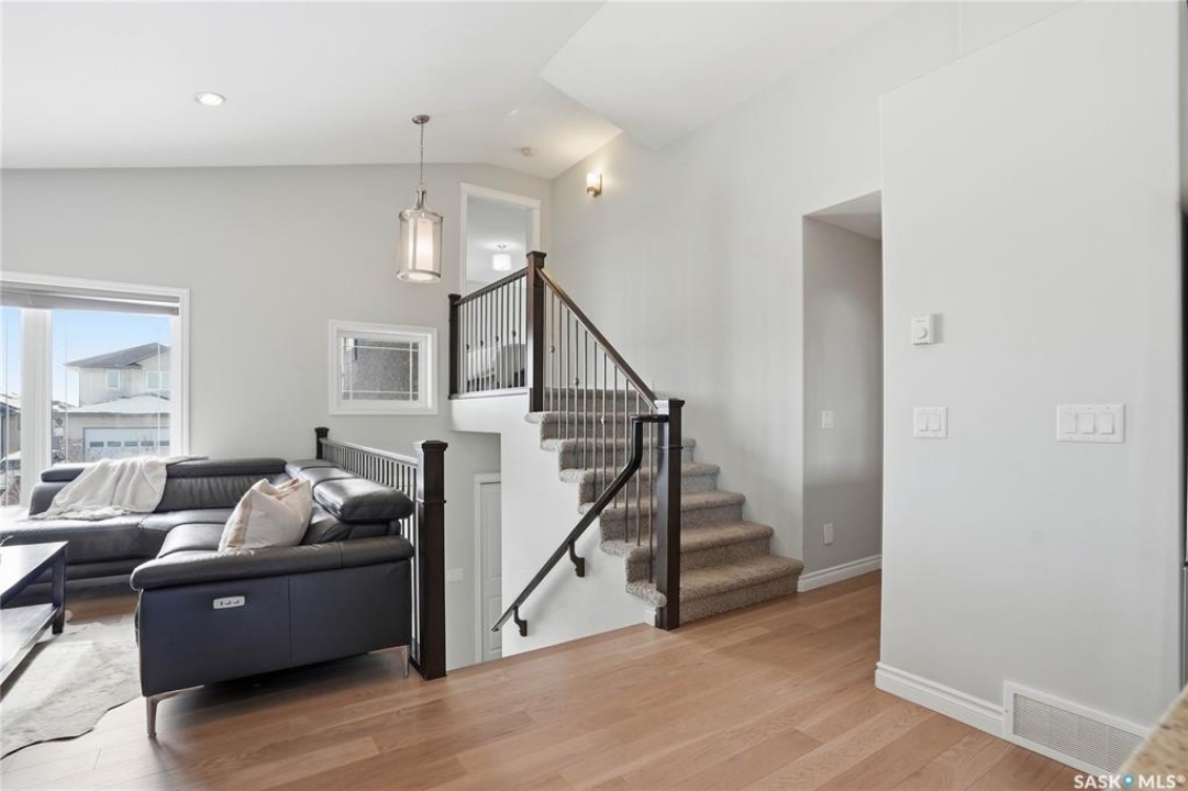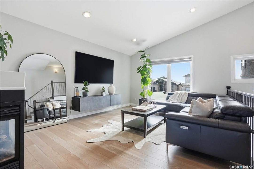 Stonebridge modified bi-level offering 1,455 sq. ft., 4 bedrooms, and 3 full bathrooms, ideally located on one of the neighbourhood's most desirable crescents — with all the features you could hope for! Step into a welcoming vaulted foyer. Just ahead is a bright, open great room featuring gorgeous newer genuine modern hardwood floors, a large picture window, a 3-sided fireplace, and soaring vaulted ceilings that continue throughout the main living space. The great room connects to a spacious dining area and a modern kitchen complete with stainless steel appliances, a central island with granite counters, tile backsplash, and a corner pantry — an exceptional layout for family living and entertaining. The main floor also offers a functional laundry room, 2 bedrooms, and a 4-piece bathroom with granite counters and tile flooring. The second level is a luxurious primary suite, featuring an oversized bedroom with a connected sitting room. The 5-piece ensuite includes a jetted soaker tub, glass shower with tile surround, double sink vanity, and a customized walk-in closet with drawers and built-in storage. The fully developed basement provides even more living space with a very spacious family room featuring a 2nd gas fireplace, a four-piece bathroom, and a connected games area or gym. This level also includes a lrg 4th bedroom with walk-in closet, plus utility and storage space. Outdoor living is accessed from the great room, leading to a fantastic double-tiered deck — truly an entertainer's dream. The yard offers tall trees for privacy and complete landscaping, plus shed storage. Additional upgrades include a heated double garage, heated floors in bathrooms, newer high-end hardwood throughout the entire main floor, central air, u/g sprinklers, nat gas BBQ hookup, customized closets, central vac, and two gas fireplaces. Located just a short distance to parks, schools, and shopping, this home sits on one of Stonebridge's most sought-after streets.