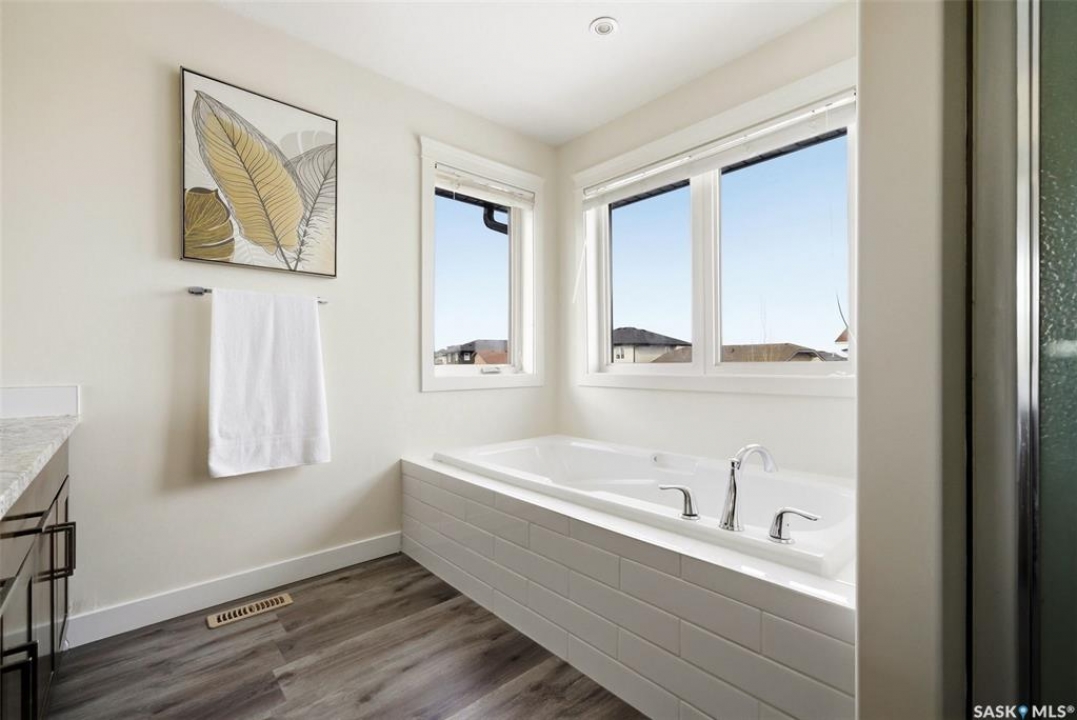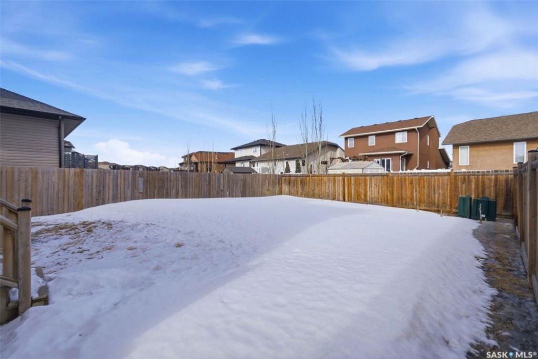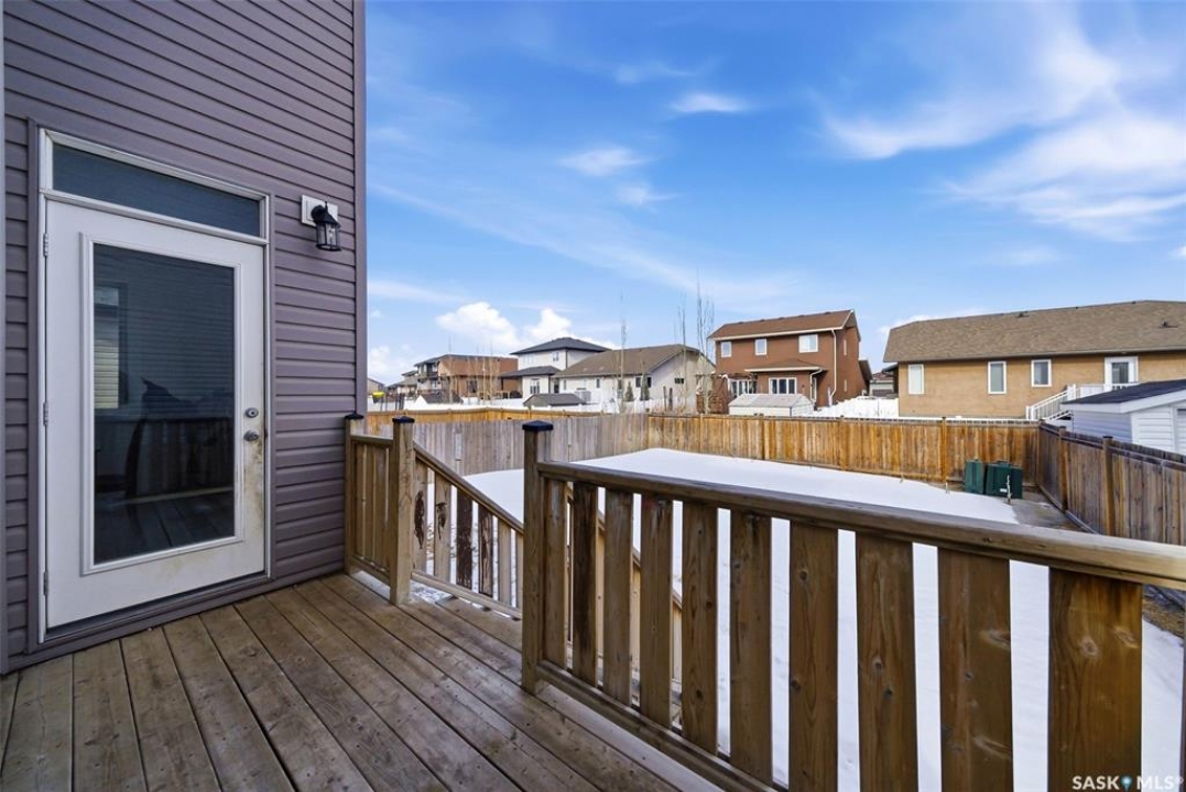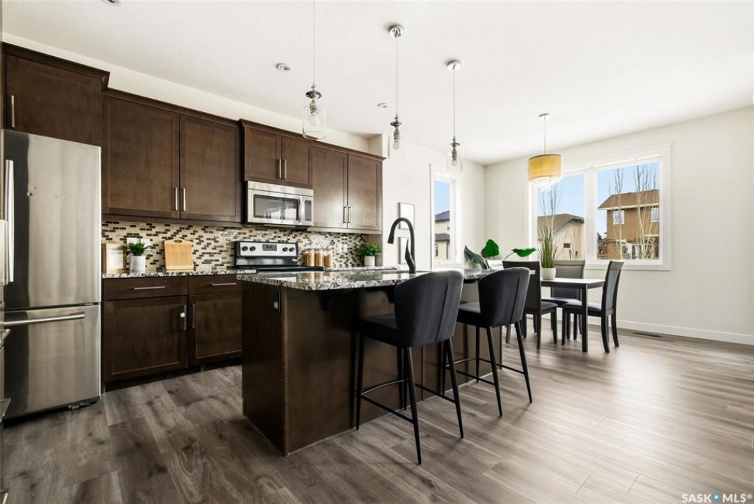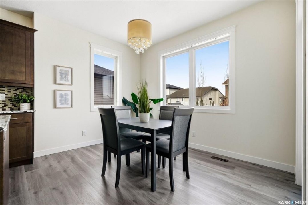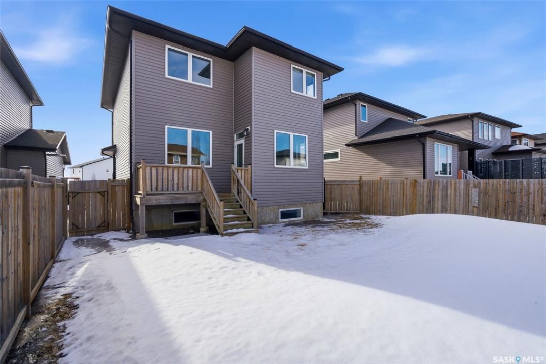 Welcome to 4830 Green Apple Drive, located in the heart of the desirable Greens on Gardiner neighbourhood. This custom-built two-storey offers over 1,730 sq. ft. of well-designed living space, featuring 4 bedrooms and 4 bathrooms, plus a fully developed basement with separate side entrance. Open-concept main floor features 9-foot ceilings and newer vinyl plank flooring throughout, creating a bright and modern living space. A convenient mudroom area leads to the double attached garage, adding functionality for everyday living. The spacious living room is filled with natural light thanks to large windows overlooking the backyard. The kitchen is beautifully finished with espresso-toned maple cabinetry, a built-in pantry, granite countertops, tile backsplash, soft-close drawers, and a large island perfect for meal prep or casual dining. The adjoining dining area provides plenty of space for family gatherings and features a garden door leading to the back deck with gas BBQ hookup. The deck overlooks the fully fenced backyard with lawn, offering great space for outdoor enjoyment. A two-piece powder room is conveniently located near the front closet and garage entrance. Upstairs, the second level offers three good-sized bedrooms, including a spacious primary suite featuring a large walk-in closet and a five-piece ensuite with jetted tub, double vanity with granite countertops, and separate shower. The second level also includes a full four-piece main bathroom and convenient second-floor laundry. New carpet throughout the second level adds a fresh feel. Fully developed basement, with separate side entrance, features a large recreation room with wet bar area, an additional spacious bedroom, and a four-piece bathroom with granite vanity, offering great extra living space. This home is ideally located within walking distance to École Wascana Plains School and École St. Elizabeth, as well as parks, walking paths, and all east-end amenities.