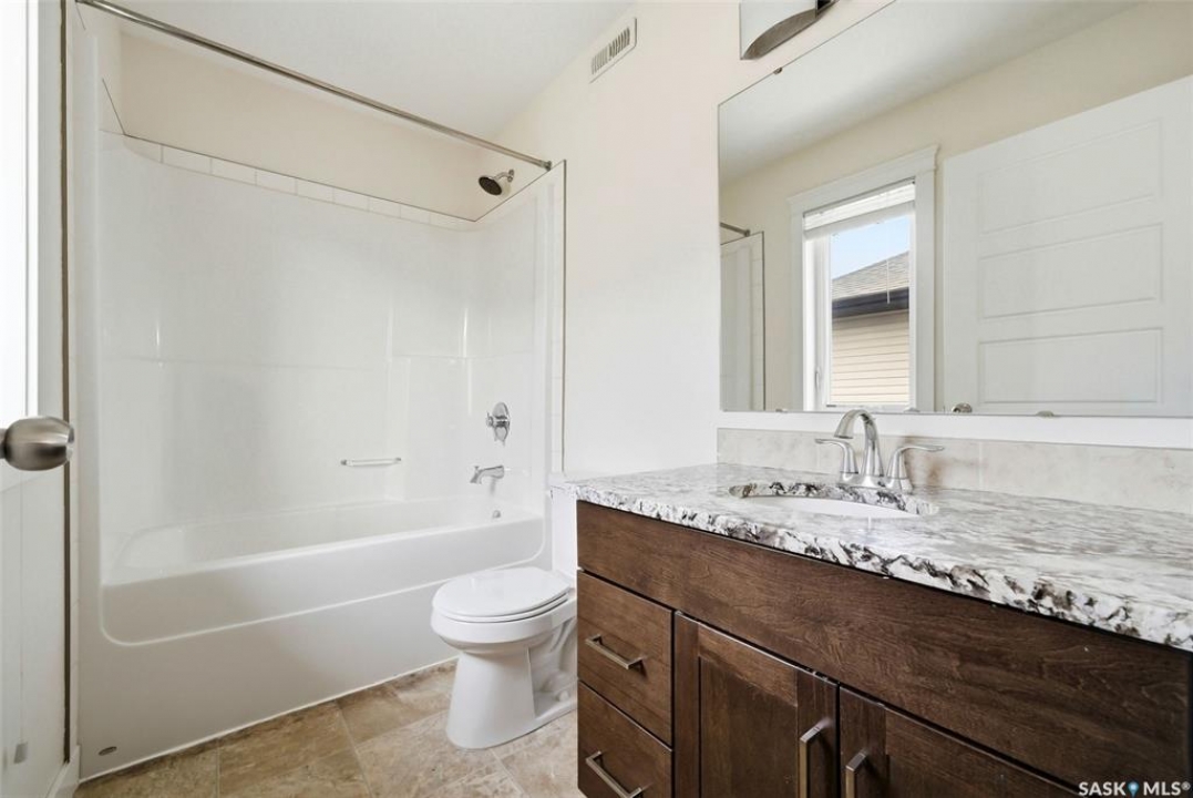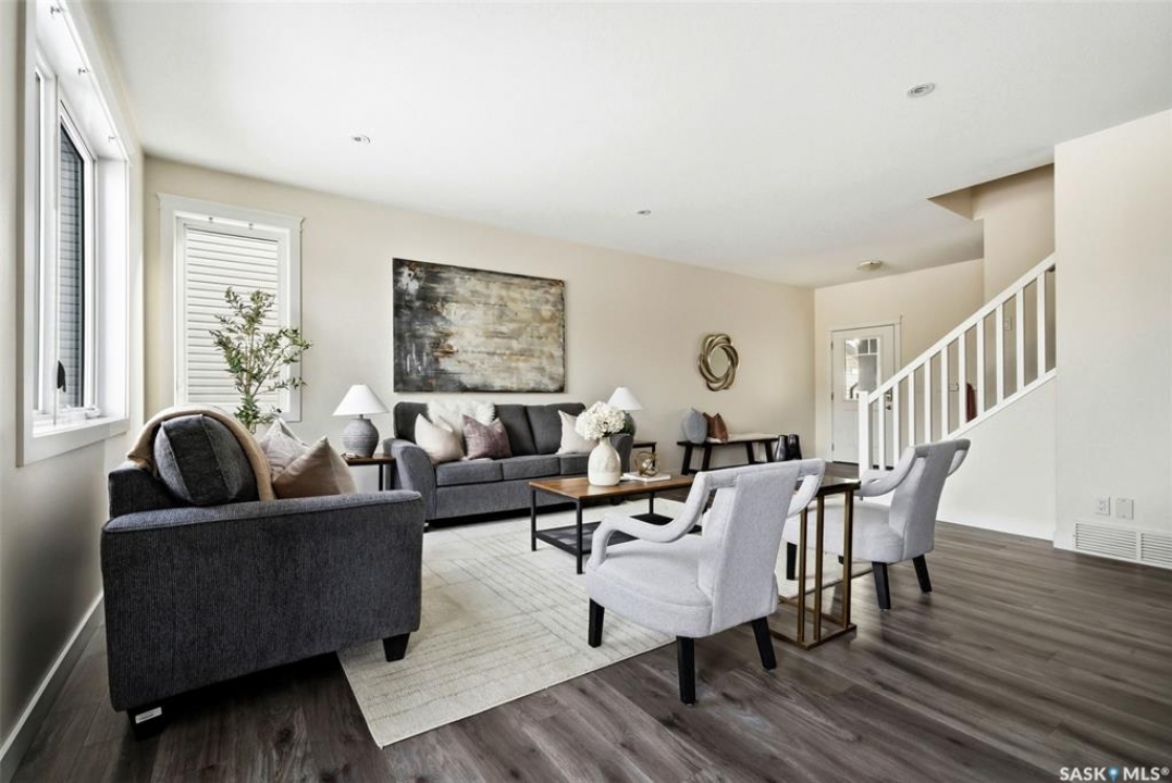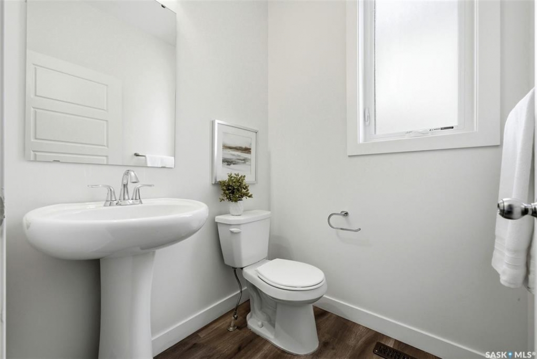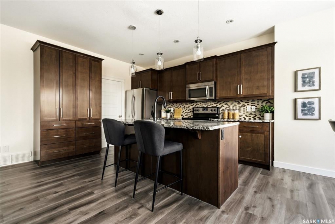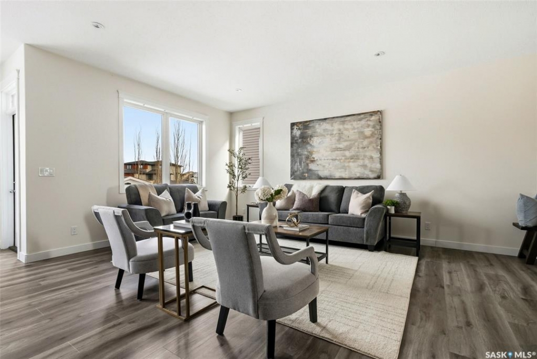 Welcome to 4830 Green Apple Drive, located in the heart of the desirable Greens on Gardiner neighbourhood. This custom-built two-storey offers over 1,730 sq. ft. of well-designed living space, featuring 4 bedrooms and 4 bathrooms, plus a fully developed basement with separate side entrance. Open-concept main floor features 9-foot ceilings and newer vinyl plank flooring throughout, creating a bright and modern living space. A convenient mudroom area leads to the double attached garage, adding functionality for everyday living. The spacious living room is filled with natural light thanks to large windows overlooking the backyard. The kitchen is beautifully finished with espresso-toned maple cabinetry, a built-in pantry, granite countertops, tile backsplash, soft-close drawers, and a large island perfect for meal prep or casual dining. The adjoining dining area provides plenty of space for family gatherings and features a garden door leading to the back deck with gas BBQ hookup. The deck overlooks the fully fenced backyard with lawn, offering great space for outdoor enjoyment. A two-piece powder room is conveniently located near the front closet and garage entrance. Upstairs, the second level offers three good-sized bedrooms, including a spacious primary suite featuring a large walk-in closet and a five-piece ensuite with jetted tub, double vanity with granite countertops, and separate shower. The second level also includes a full four-piece main bathroom and convenient second-floor laundry. New carpet throughout the second level adds a fresh feel. Fully developed basement, with separate side entrance, features a large recreation room with wet bar area, an additional spacious bedroom, and a four-piece bathroom with granite vanity, offering great extra living space. This home is ideally located within walking distance to École Wascana Plains School and École St. Elizabeth, as well as parks, walking paths, and all east-end amenities.