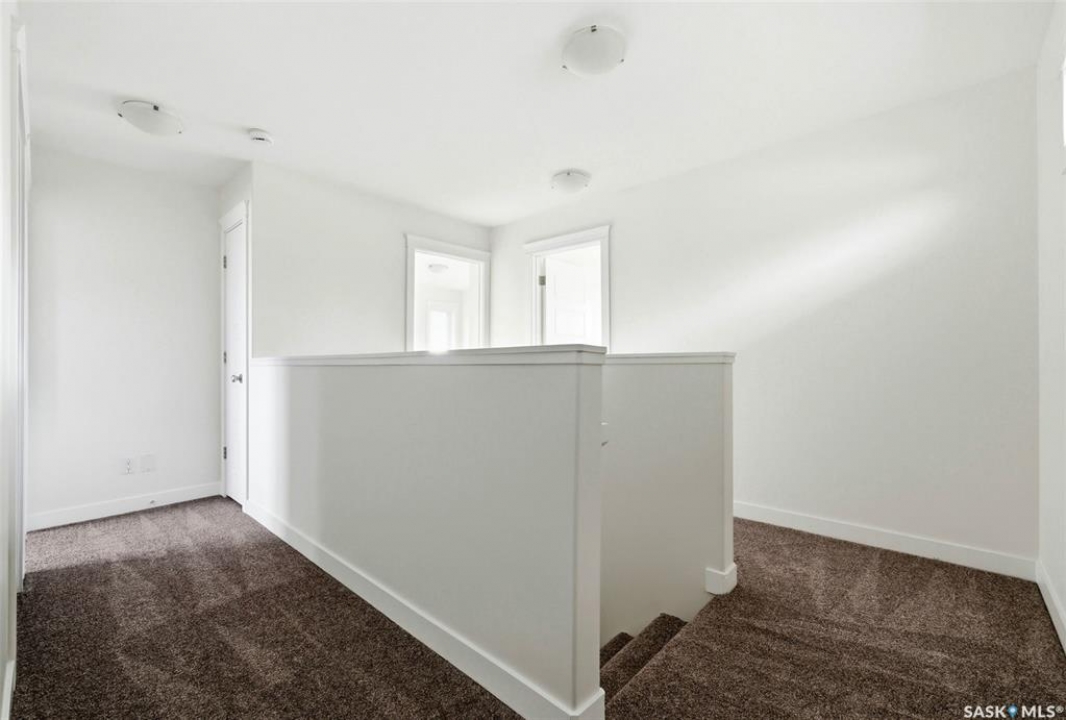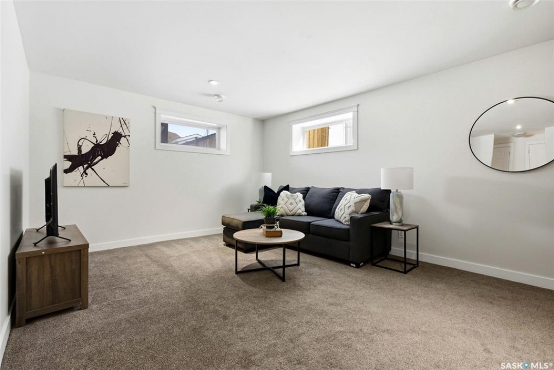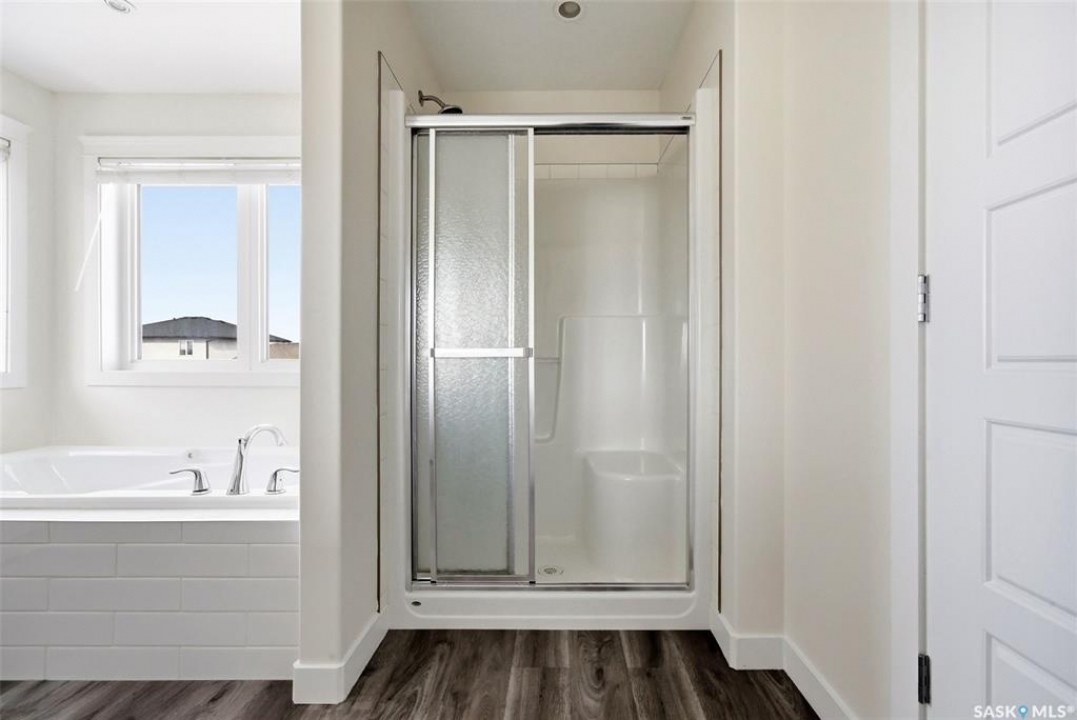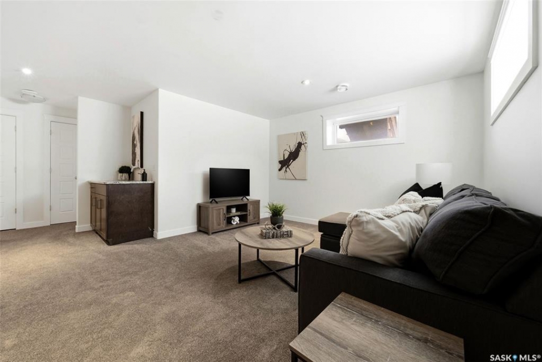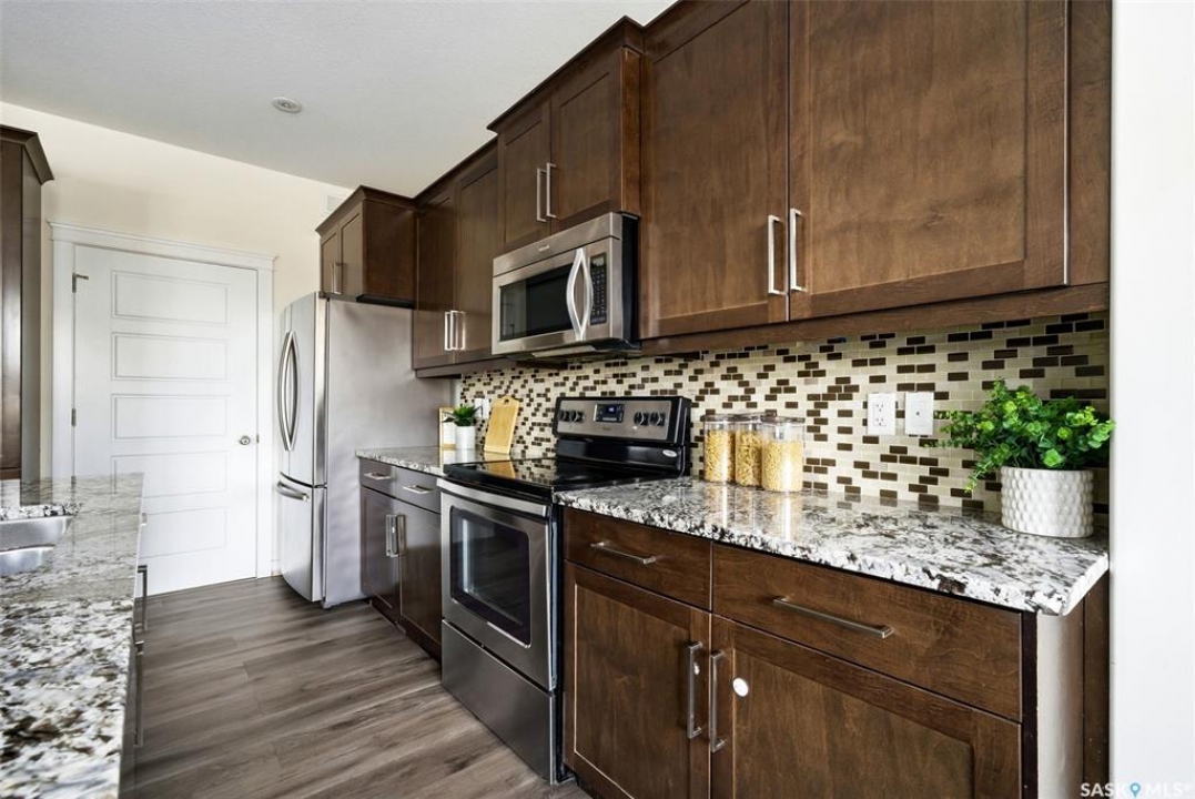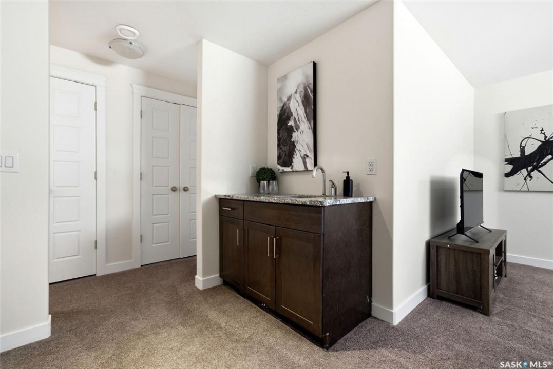 Welcome to 4830 Green Apple Drive, located in the heart of the desirable Greens on Gardiner neighbourhood. This custom-built two-storey offers over 1,730 sq. ft. of well-designed living space, featuring 4 bedrooms and 4 bathrooms, plus a fully developed basement with separate side entrance. Open-concept main floor features 9-foot ceilings and newer vinyl plank flooring throughout, creating a bright and modern living space. A convenient mudroom area leads to the double attached garage, adding functionality for everyday living. The spacious living room is filled with natural light thanks to large windows overlooking the backyard. The kitchen is beautifully finished with espresso-toned maple cabinetry, a built-in pantry, granite countertops, tile backsplash, soft-close drawers, and a large island perfect for meal prep or casual dining. The adjoining dining area provides plenty of space for family gatherings and features a garden door leading to the back deck with gas BBQ hookup. The deck overlooks the fully fenced backyard with lawn, offering great space for outdoor enjoyment. A two-piece powder room is conveniently located near the front closet and garage entrance. Upstairs, the second level offers three good-sized bedrooms, including a spacious primary suite featuring a large walk-in closet and a five-piece ensuite with jetted tub, double vanity with granite countertops, and separate shower. The second level also includes a full four-piece main bathroom and convenient second-floor laundry. New carpet throughout the second level adds a fresh feel. Fully developed basement, with separate side entrance, features a large recreation room with wet bar area, an additional spacious bedroom, and a four-piece bathroom with granite vanity, offering great extra living space. This home is ideally located within walking distance to École Wascana Plains School and École St. Elizabeth, as well as parks, walking paths, and all east-end amenities.