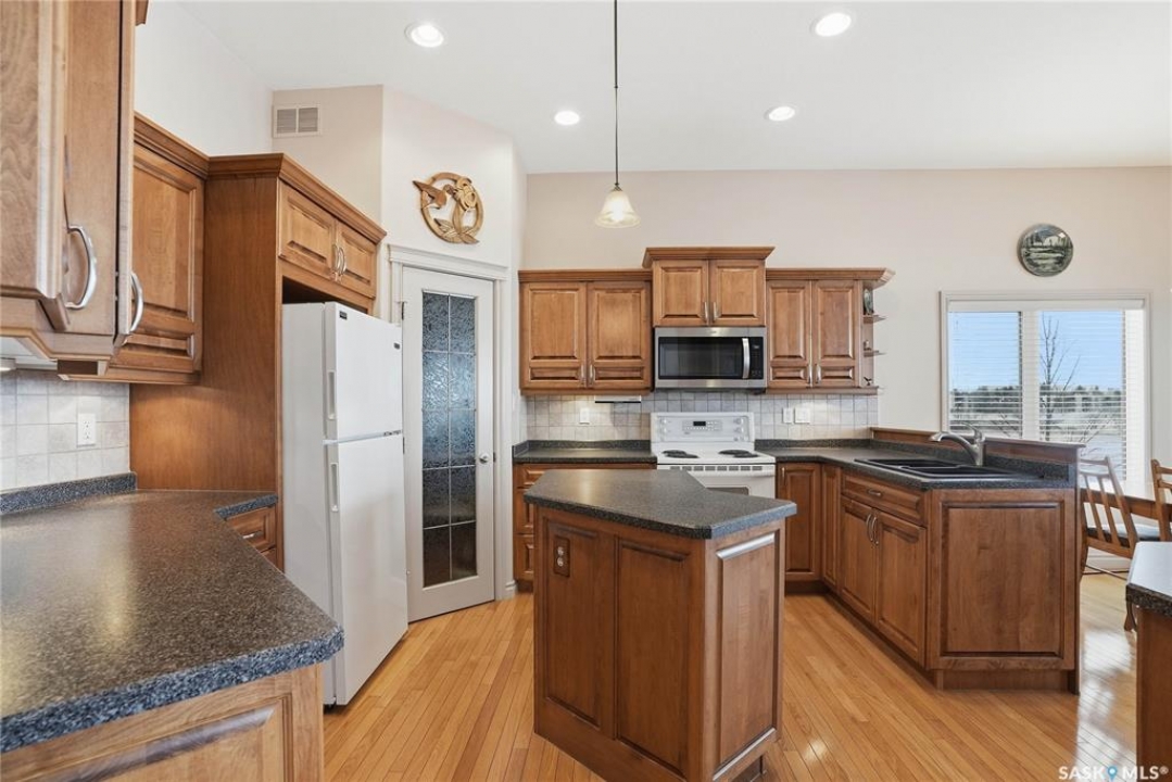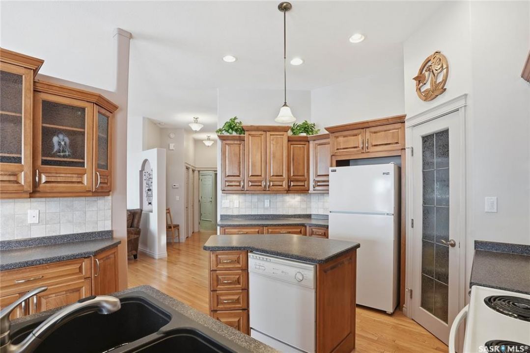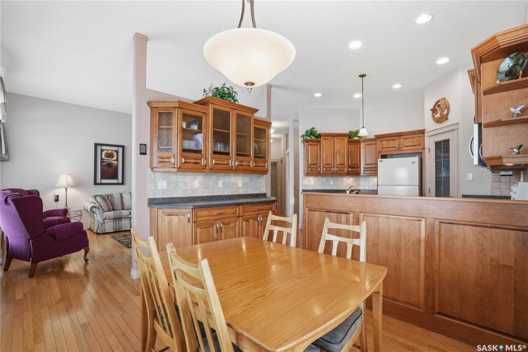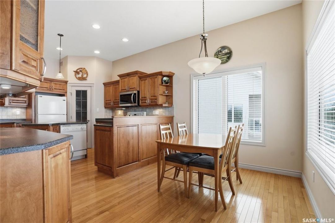 Welcome to #114-802 Heritage Crescent, located in the desirable gated community of Parkside View. This beautifully maintained 1,525 sq. ft. walkout bungalow offers 3 bedrooms and 3 bathrooms, and backs onto the scenic walking paths and landscaping of Lakewood Park. The main floor features oak hardwood flooring, IN FLOOR HEATED TILE, a bright and spacious den with abundant natural light, and a formal dining room with an elegant alcove. The large living room offers beautiful views of the park and walking paths, creating a warm and inviting space for relaxing or entertaining. The custom kitchen is well appointed with undercabinet lighting, crown moulding, tile backsplash, island, corner pantry with glass insert , and includes fridge, stove, dishwasher, and over-the-range microwave. The adjoining nook features a garden door leading to the sunroom, with access to a spiral staircase to the lower patio, perfect for enjoying the outdoor setting. The spacious primary bedroom includes a large closet and a 4-piece ensuite complete with jetted tub and separate shower. The main floor also offers a 2-piece bathroom with wainscoting, along with a mudroom/laundry area featuring a sink, cabinetry, and convenient access to the double attached garage FEATURING INFLOOR HEAT. The walkout basement boasts 9-foot ceilings and a generous family room with INFLOOR HEAT, gas fireplace, recessed lighting, and a garden door leading to the patio with lovely park views. Two additional well-sized bedrooms, a 4-piece bathroom, and a large utility room with ample storage and a wine room complete the lower level. Additional features include central air conditioning, central vacuum, underground sprinklers, and a gas BBQ hookup. Ideally located close to the Lakewood Civic Centre, walking paths, parks, and amenities, this home offers comfort, convenience, and low-maintenance living in a sought-after community.