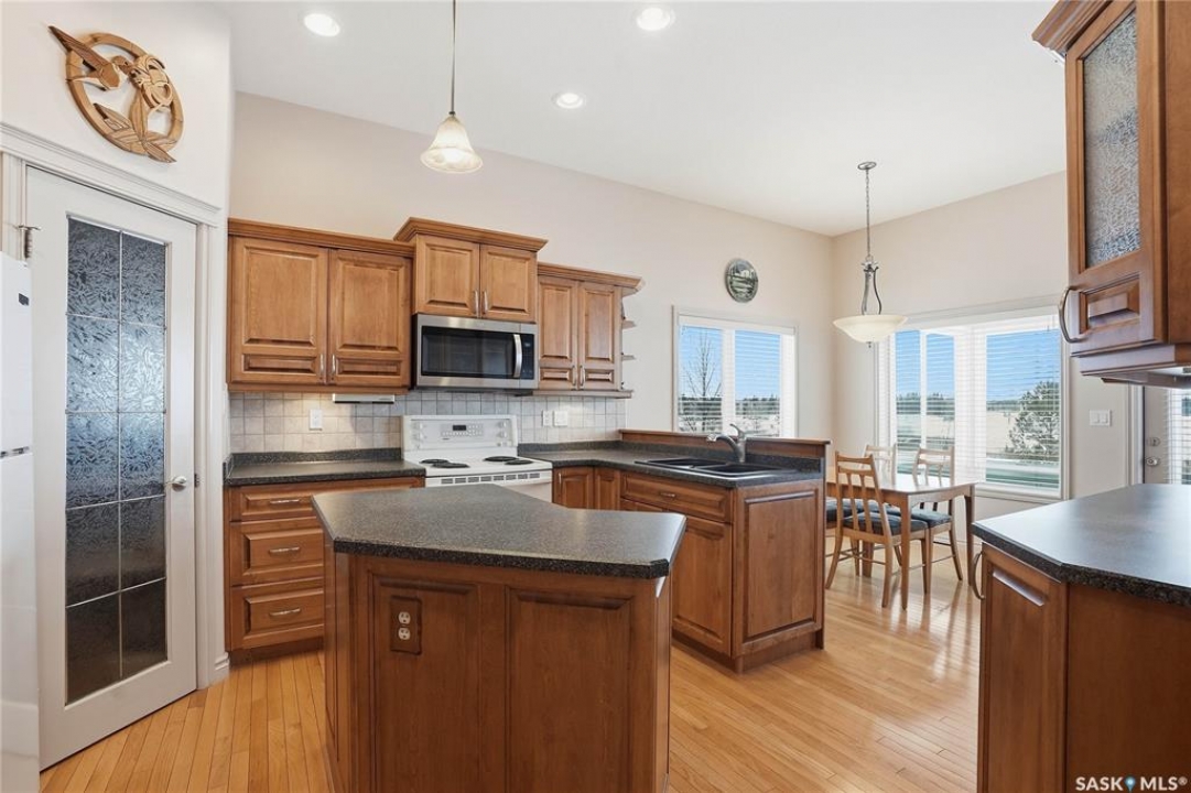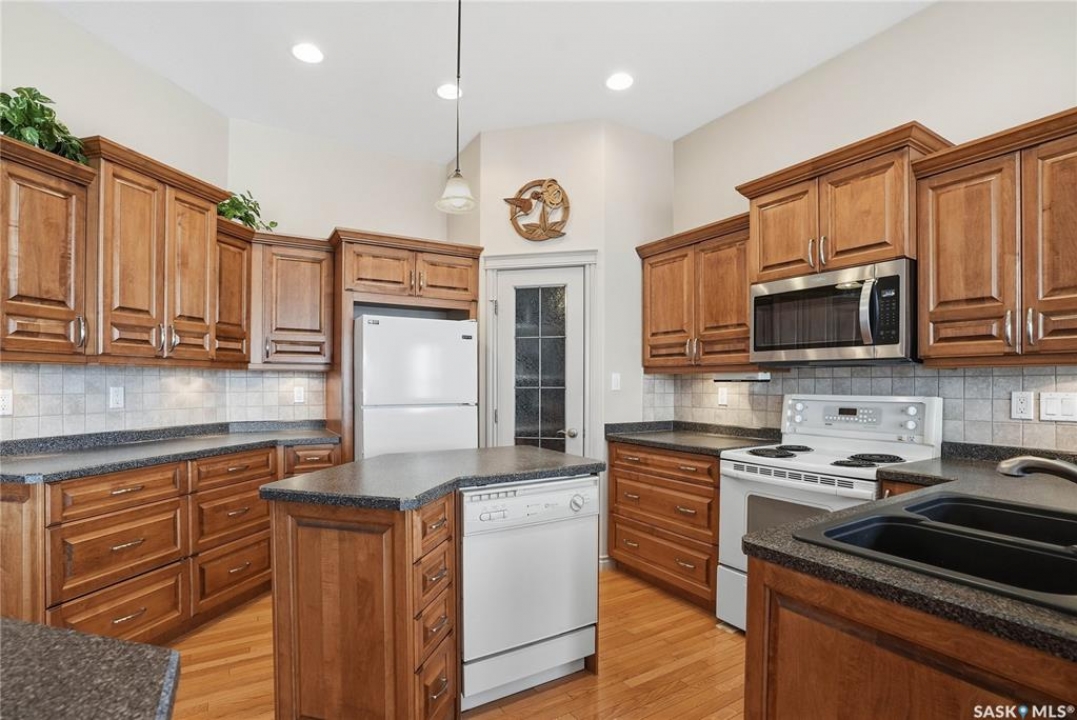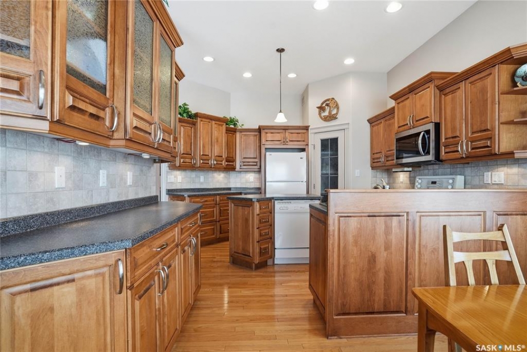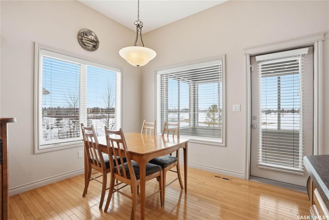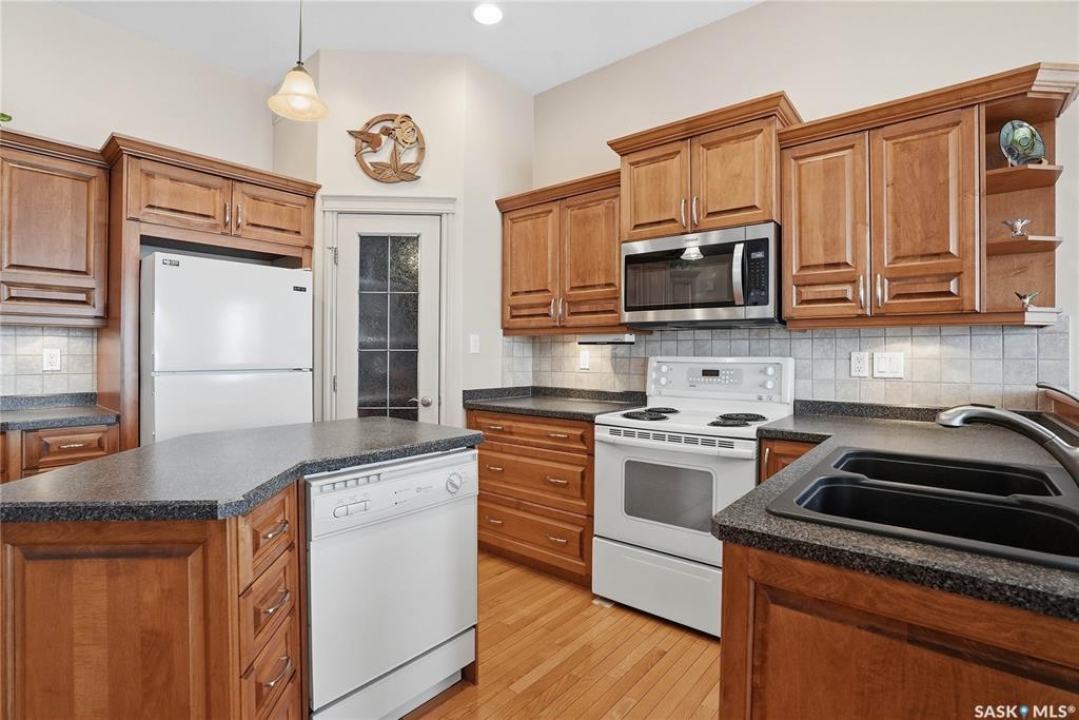 Welcome to #114-802 Heritage Crescent, located in the desirable gated community of Parkside View. This beautifully maintained 1,525 sq. ft. walkout bungalow offers 3 bedrooms and 3 bathrooms, and backs onto the scenic walking paths and landscaping of Lakewood Park. The main floor features oak hardwood flooring, IN FLOOR HEATED TILE, a bright and spacious den with abundant natural light, and a formal dining room with an elegant alcove. The large living room offers beautiful views of the park and walking paths, creating a warm and inviting space for relaxing or entertaining. The custom kitchen is well appointed with undercabinet lighting, crown moulding, tile backsplash, island, corner pantry with glass insert , and includes fridge, stove, dishwasher, and over-the-range microwave. The adjoining nook features a garden door leading to the sunroom, with access to a spiral staircase to the lower patio, perfect for enjoying the outdoor setting. The spacious primary bedroom includes a large closet and a 4-piece ensuite complete with jetted tub and separate shower. The main floor also offers a 2-piece bathroom with wainscoting, along with a mudroom/laundry area featuring a sink, cabinetry, and convenient access to the double attached garage FEATURING INFLOOR HEAT. The walkout basement boasts 9-foot ceilings and a generous family room with INFLOOR HEAT, gas fireplace, recessed lighting, and a garden door leading to the patio with lovely park views. Two additional well-sized bedrooms, a 4-piece bathroom, and a large utility room with ample storage and a wine room complete the lower level. Additional features include central air conditioning, central vacuum, underground sprinklers, and a gas BBQ hookup. Ideally located close to the Lakewood Civic Centre, walking paths, parks, and amenities, this home offers comfort, convenience, and low-maintenance living in a sought-after community.