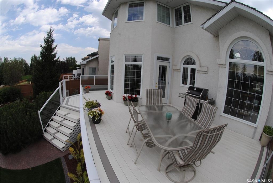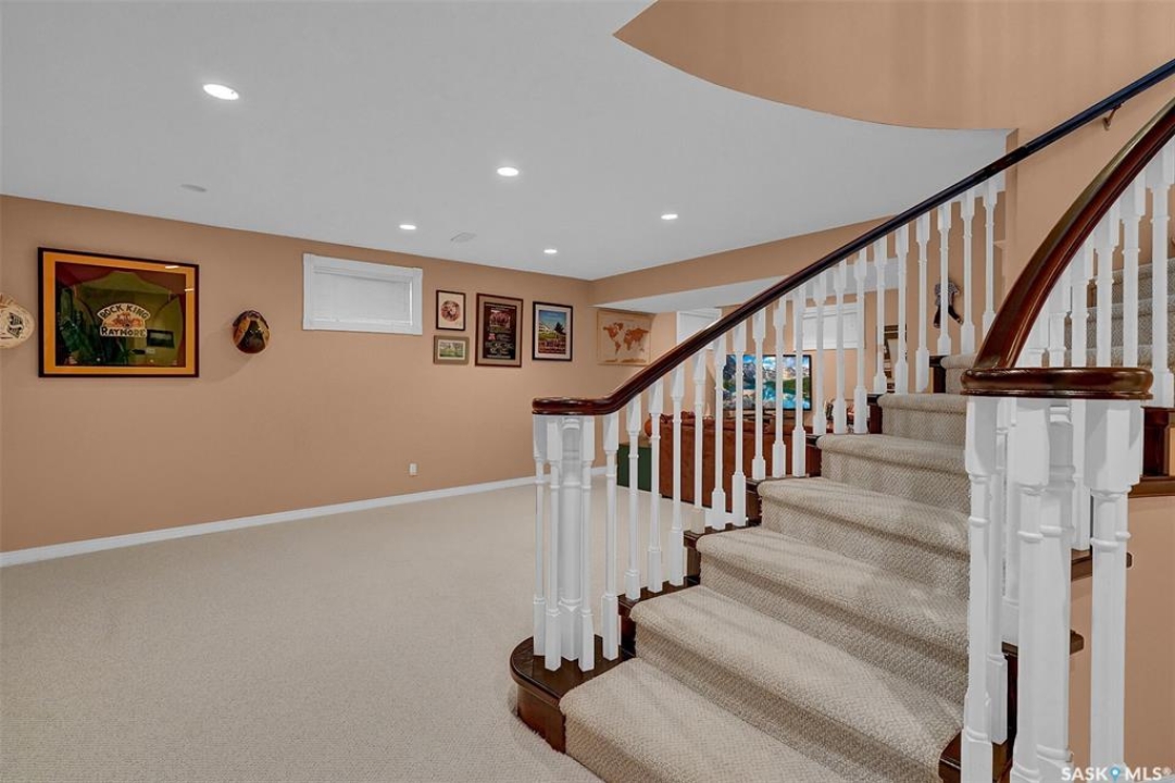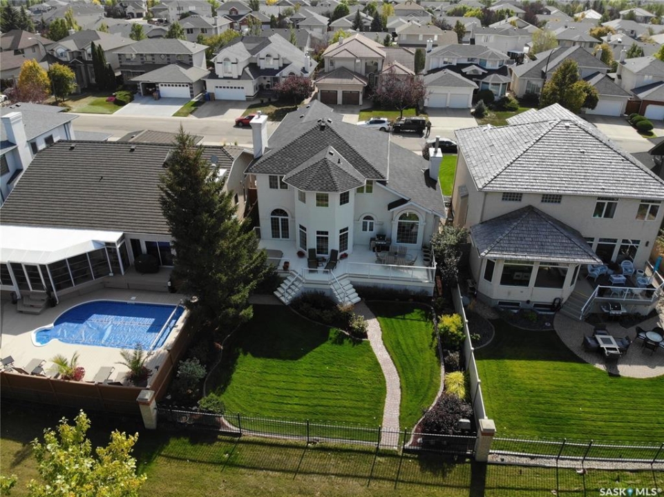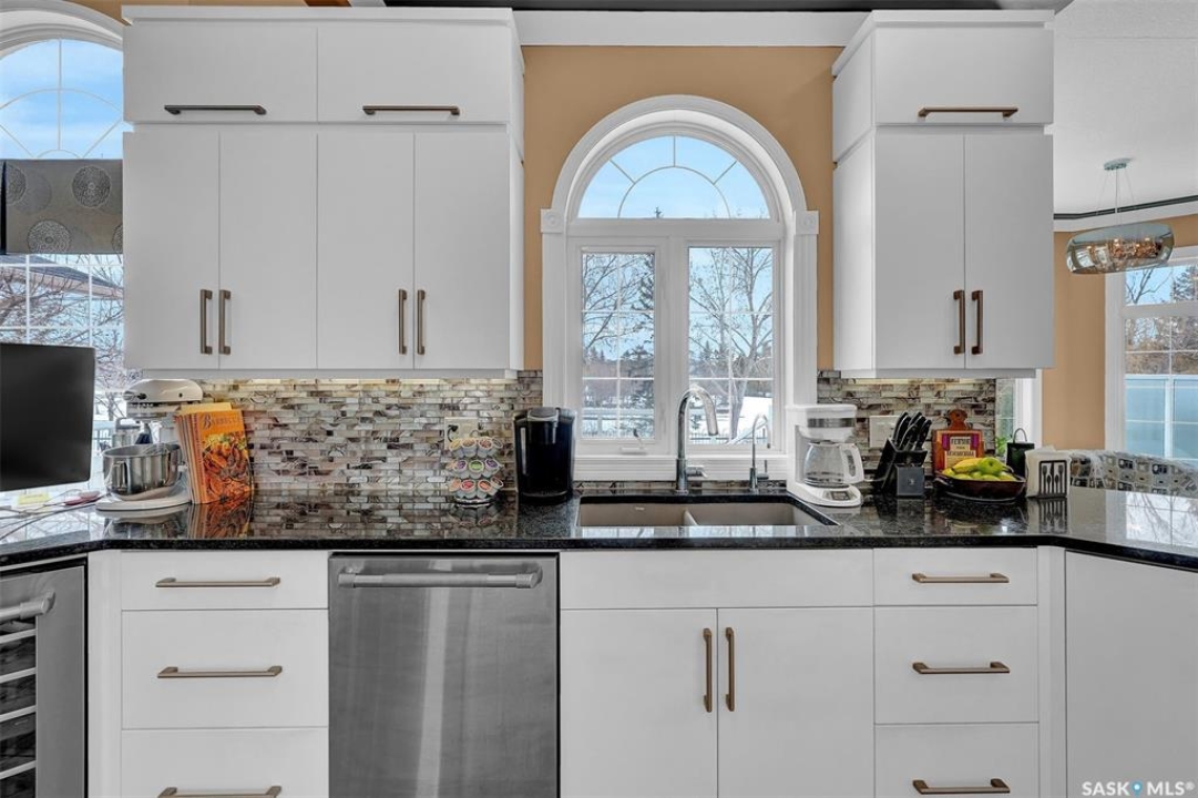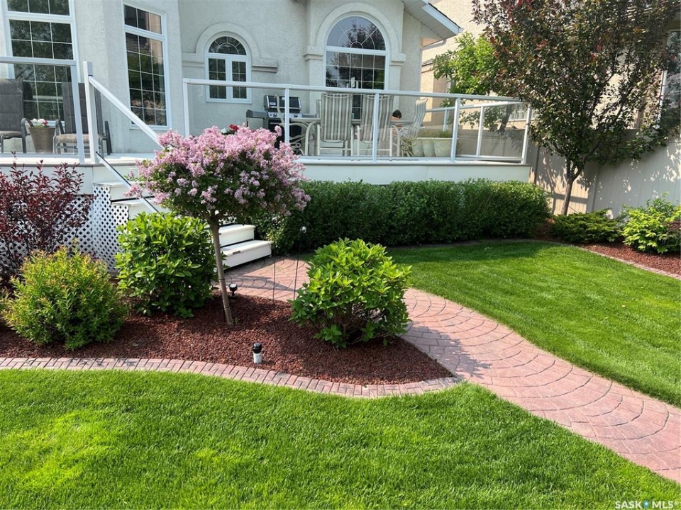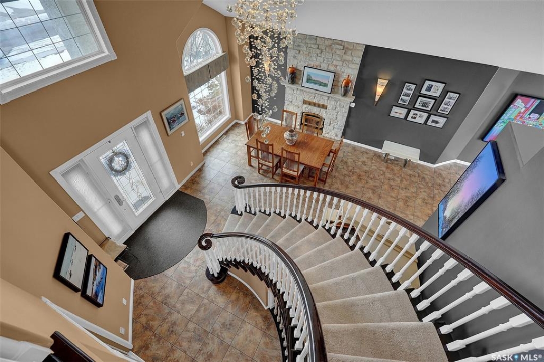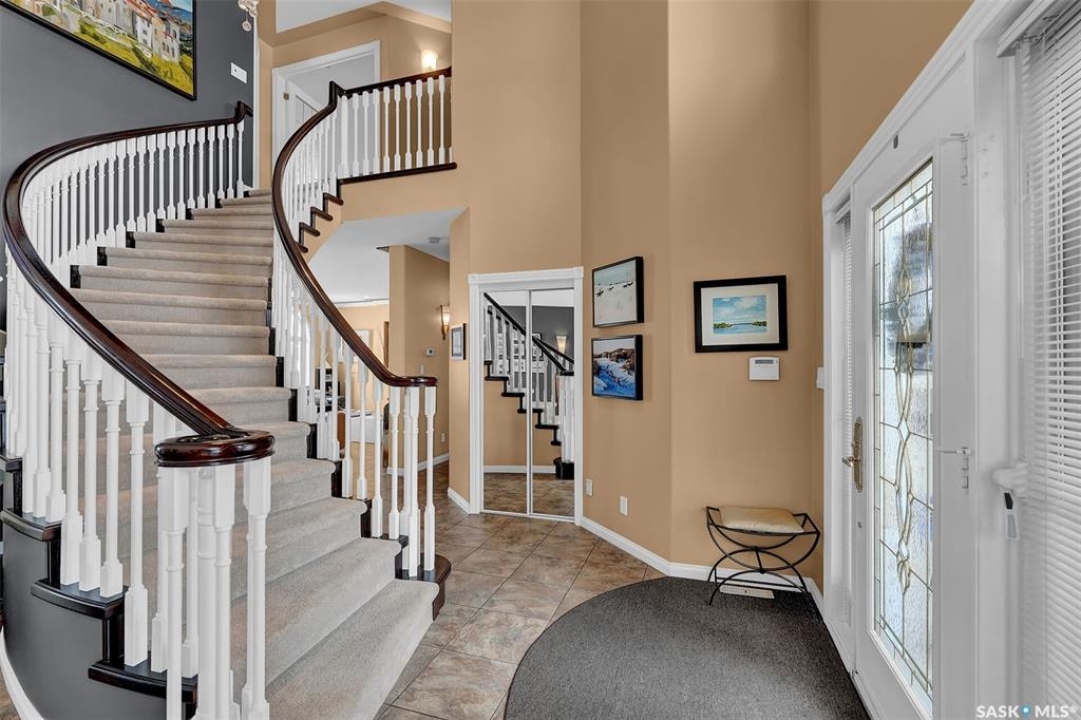 Welcome to 9463 Wascana Mews — a beautifully maintained 2-storey split nestled in one of Regina's most premium locations. Backing expansive green space, this 5-bed, 4-bath home offers exceptional privacy, stunning views, and an abundance of natural light throughout. The main floor features a bright front living room with electric blinds and a remote-controlled chandelier for effortless cleaning. The updated kitchen offers modern finishes, excellent workspace, and a seamless flow into the dining and family areas — all designed to take in the serene green space behind the home. Gorgeous spiral staircase leads you to the primary suite, a true retreat with an updated ensuite and his-and-hers closets. Three additional bedrooms and an additional bath provide great versatility for family living. Basement includes a spacious bedroom and bathroom, plus comfortable additional living spaces. (basement bedroom window may not meet current egress requirements.) Outside, the care and pride in ownership are immediately evident. The stunning park like yard is beautifully maintained and enhanced by a composite deck overlooking the open green area — the perfect setting for morning coffee or evening relaxation. Double attached heated garage features a beautiful epoxy floor, offering both function and style. The home also features built in gemstone lighting in the soffits so no more ladders for Christmas lights. Homes in locations like this are rarely available — especially ones as lovingly cared for as this. A truly special opportunity in Wascana Park.