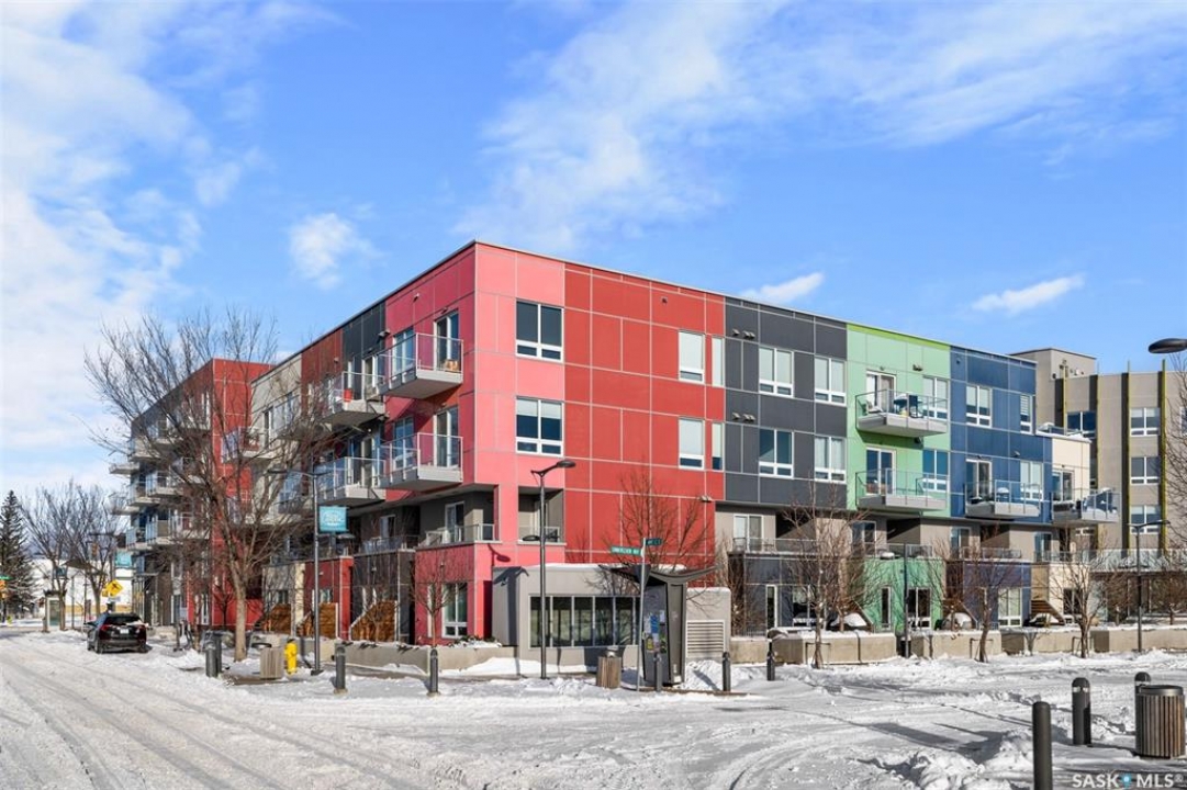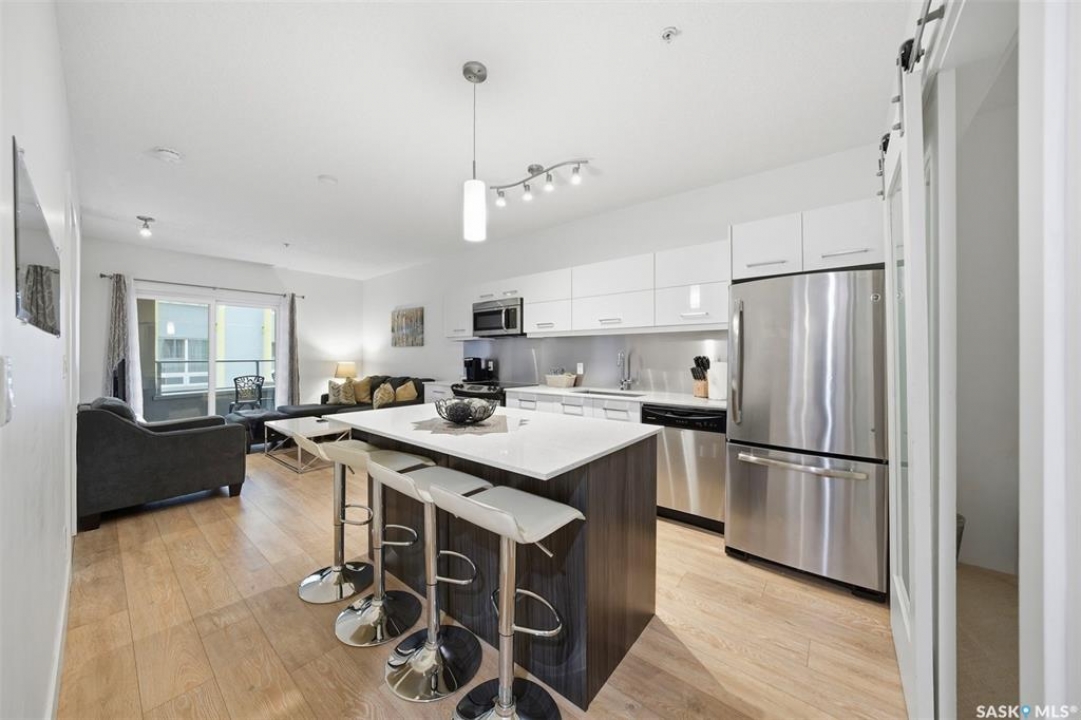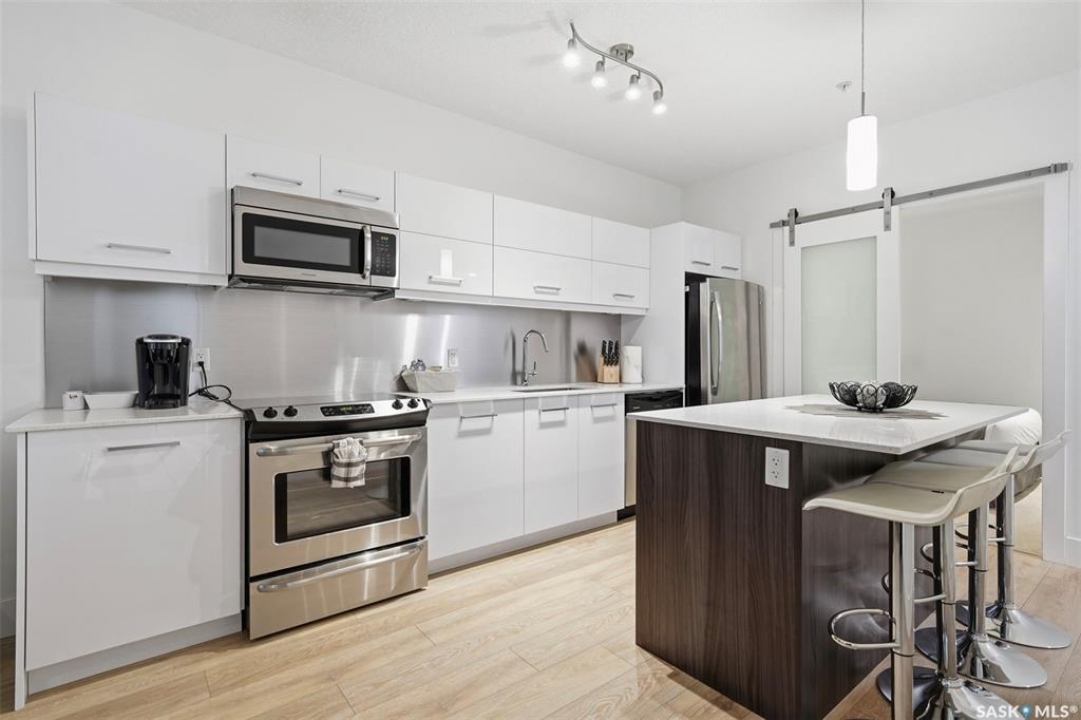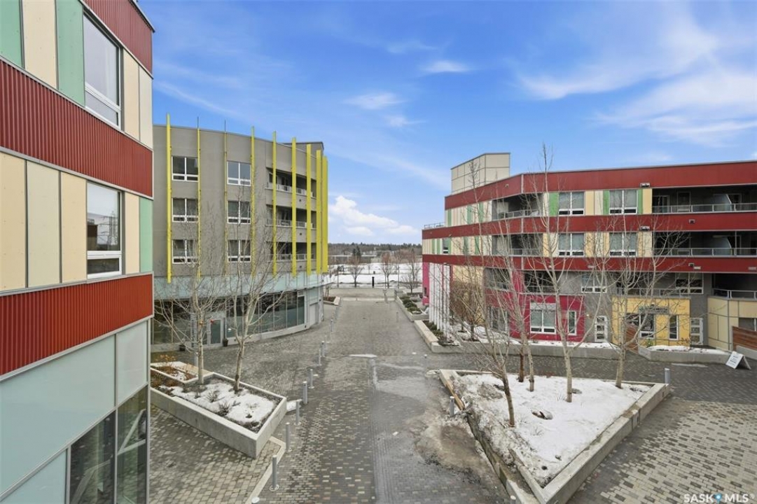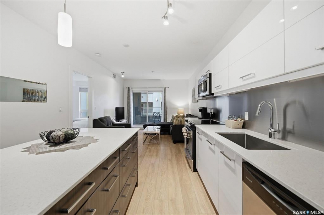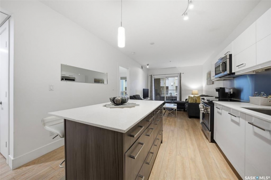 Welcome to Unit 228 at The Banks, offering modern condo living in one of Saskatoon's most vibrant neighbourhoods, just steps from the river bank encompassed by many great businesses, shops, cafes, and local markets. This well-appointed unit features a spacious front foyer with a conveniently located 3-piece bathroom complete with walk-in shower, a versatile den/study area, and in-suite laundry for added functionality and convenience. The main living space showcases a sleek contemporary design with high-gloss cabinetry, quartz countertops throughout kitchen and bathrooms, a large kitchen island, stainless steel backsplash, and stainless steel appliances. The primary bedroom offers a comfortable retreat with a 4-piece ensuite featuring a tub/shower combination with tile surround. A second bedroom and recessed south facing balcony complete the package. Additional highlights include central air conditioning, one titled underground parking stall, and a storage unit. The Banks is home to a variety of popular local businesses and is situated in a highly walkable, amenity-rich area. Pet-friendly building for unit owners (subject to board approval) and ready for immediate possession. Just move in and enjoy this low maintenance lifestyle!