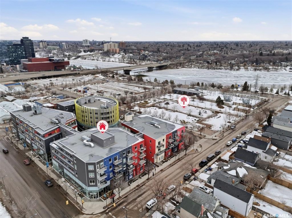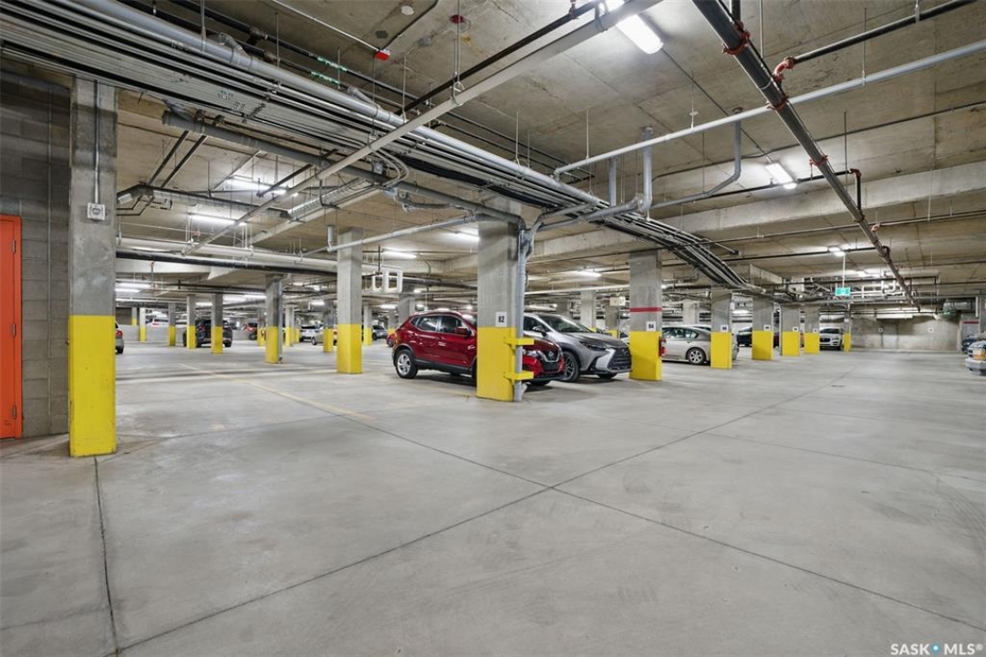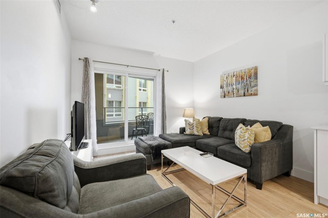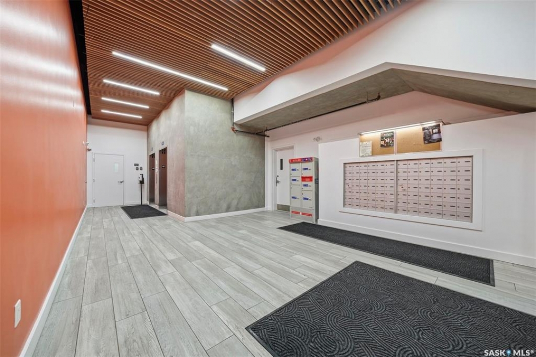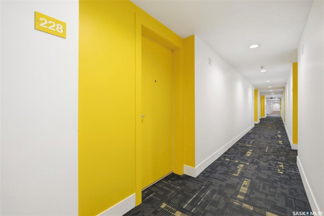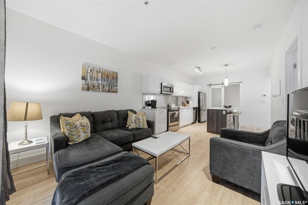Welcome to Unit 228 at The Banks, offering modern condo living in one of Saskatoon's most vibrant neighbourhoods, just steps from the river bank encompassed by many great businesses, shops, cafes, and local markets. This well-appointed unit features a spacious front foyer with a conveniently located 3-piece bathroom complete with walk-in shower, a versatile den/study area, and in-suite laundry for added functionality and convenience. The main living space showcases a sleek contemporary design with high-gloss cabinetry, quartz countertops throughout kitchen and bathrooms, a large kitchen island, stainless steel backsplash, and stainless steel appliances. The primary bedroom offers a comfortable retreat with a 4-piece ensuite featuring a tub/shower combination with tile surround. A second bedroom and recessed south facing balcony complete the package. Additional highlights include central air conditioning, one titled underground parking stall, and a storage unit. The Banks is home to a variety of popular local businesses and is situated in a highly walkable, amenity-rich area. Pet-friendly building for unit owners (subject to board approval) and ready for immediate possession. Just move in and enjoy this low maintenance lifestyle!