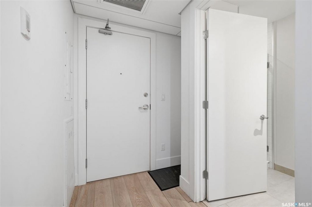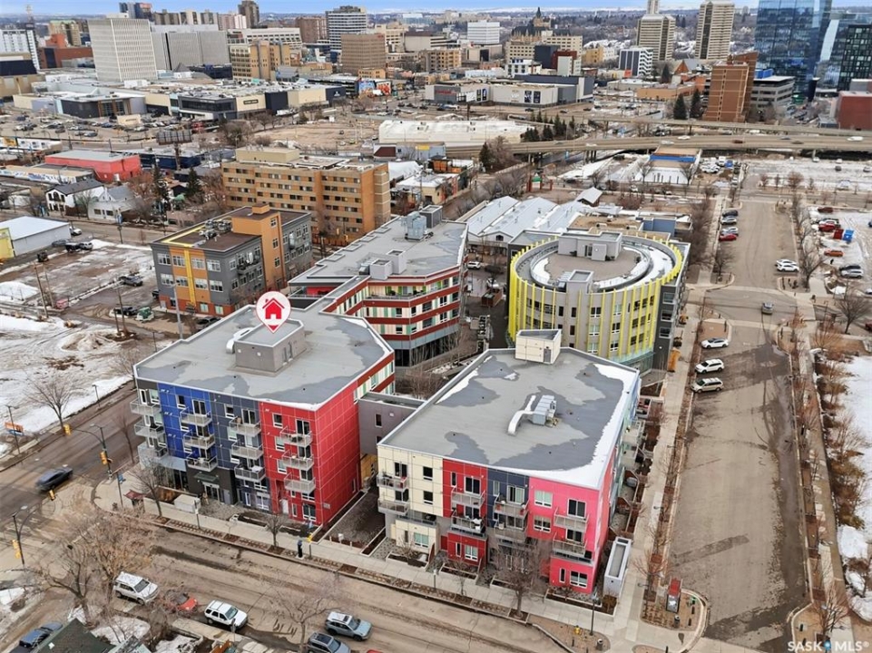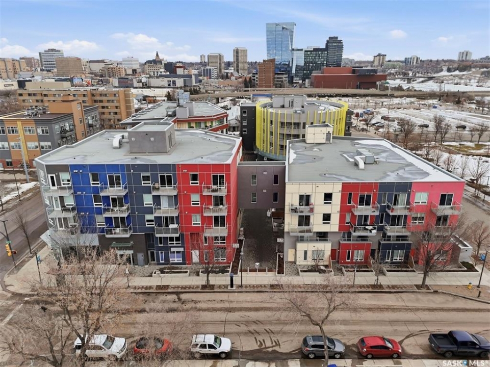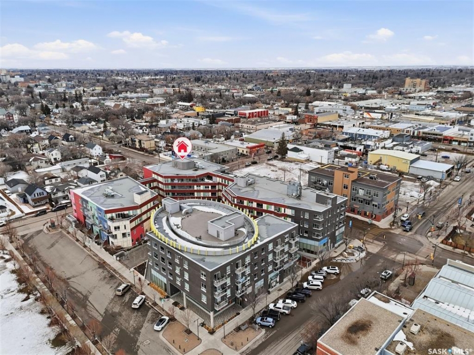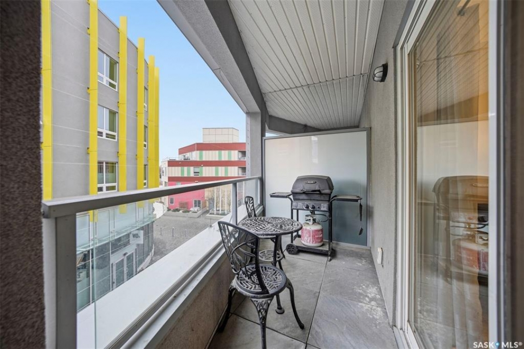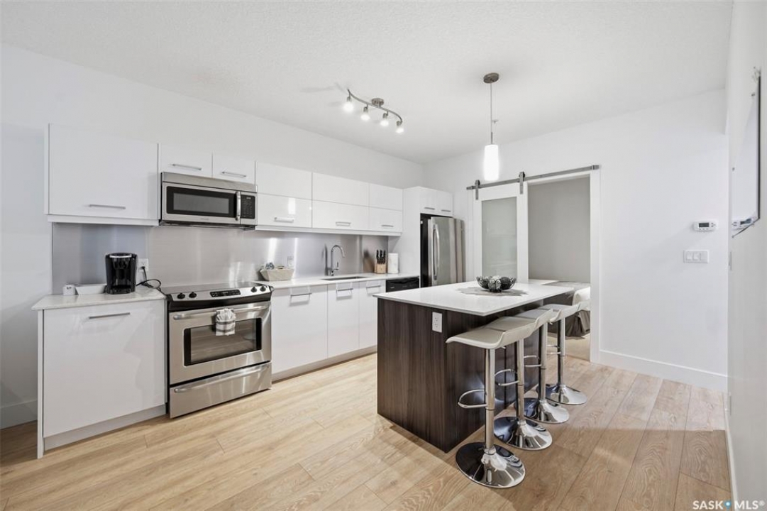 Welcome to Unit 228 at The Banks, offering modern condo living in one of Saskatoon's most vibrant neighbourhoods, just steps from the river bank encompassed by many great businesses, shops, cafes, and local markets. This well-appointed unit features a spacious front foyer with a conveniently located 3-piece bathroom complete with walk-in shower, a versatile den/study area, and in-suite laundry for added functionality and convenience. The main living space showcases a sleek contemporary design with high-gloss cabinetry, quartz countertops throughout kitchen and bathrooms, a large kitchen island, stainless steel backsplash, and stainless steel appliances. The primary bedroom offers a comfortable retreat with a 4-piece ensuite featuring a tub/shower combination with tile surround. A second bedroom and recessed south facing balcony complete the package. Additional highlights include central air conditioning, one titled underground parking stall, and a storage unit. The Banks is home to a variety of popular local businesses and is situated in a highly walkable, amenity-rich area. Pet-friendly building for unit owners (subject to board approval) and ready for immediate possession. Just move in and enjoy this low maintenance lifestyle!