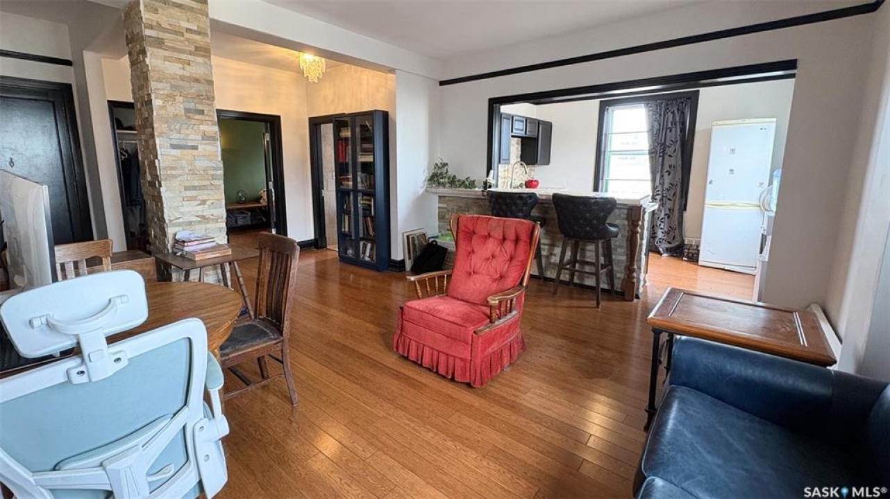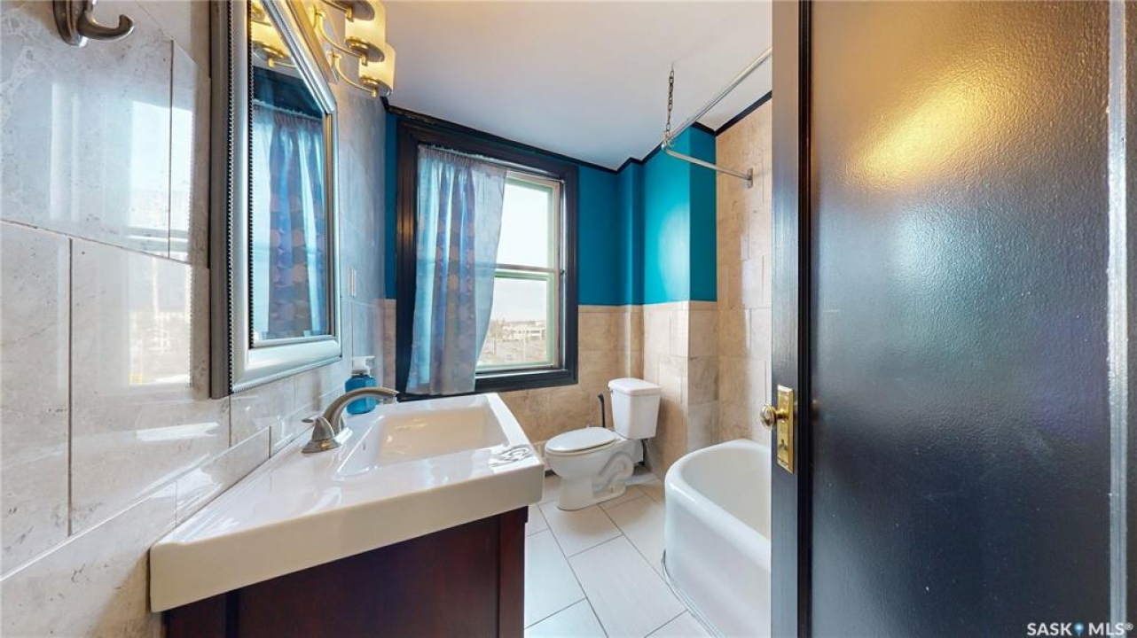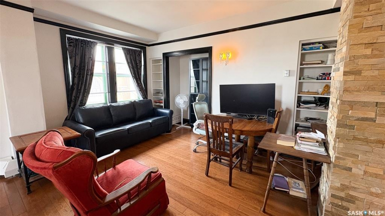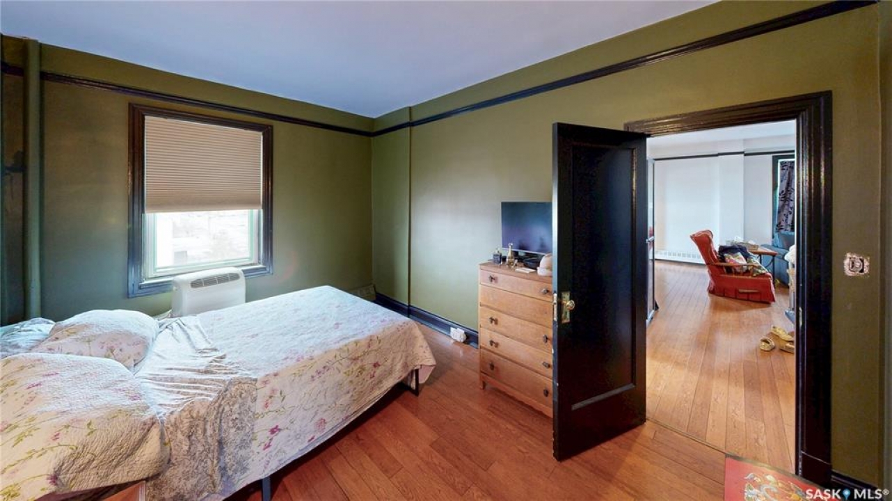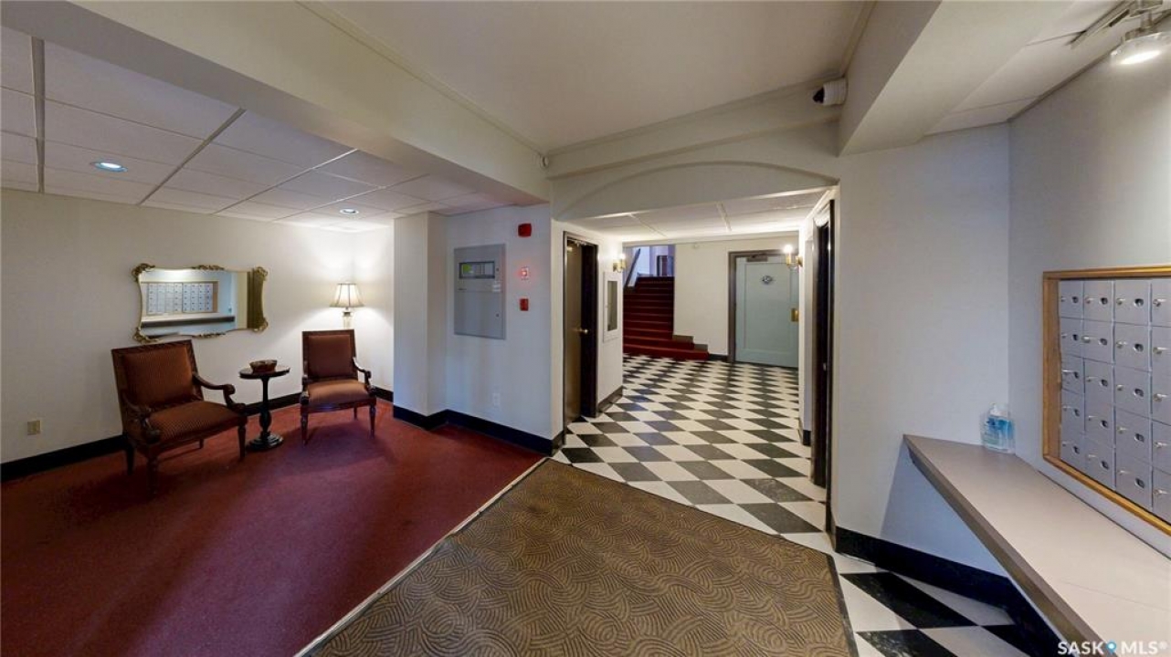 Welcome to The Balfour at 2305 Victoria Avenue, this heritage building is ideally situated in the heart of downtown Regina. With easy access to the Cornwall Centre, Victoria Park, nearby restaurants, and convenient bus routes. This charming brick building was constructed in 1929 and offers a welcoming visitor entry along with excellent shared amenities. Residents have access to a comfortable common room featuring a kitchen, TV, and ample seating. Ideal for visiting with neighbours or hosting guests. From there, step out onto the large outdoor patio complete with seating and a BBQ area. Condo fees are $511 per month and include heat and water, as well as common area maintenance, exterior building upkeep, garbage, sewer, common area insurance, and reserve fund contributions. Unit 400 is on the 4th floor and is a north west corner suite so it gets tons of natural light with a wonderful view of downtown. This space is 723 square feet with a very cozy feel. As you enter you see the bright living room with original hardwood floors and built-in shelving. The kitchen is to the left with more beautiful west facing windows and the fridge and stove top and portable air conditioner are included! The bedroom has hardwood floors and a closet. The unit is finished off with a 4 piece bathroom with tile floor. It also comes with 2 handy storage lockers as well as access to the shared laundry and rentable bike hangers!