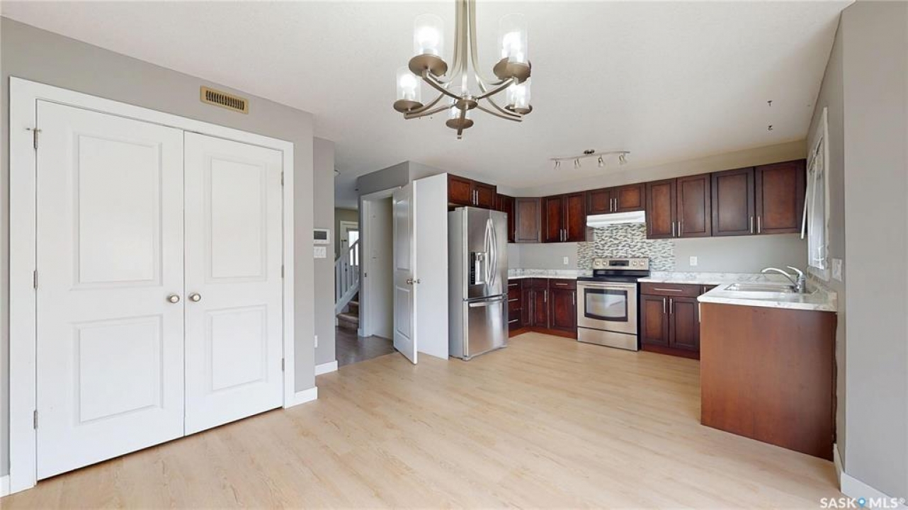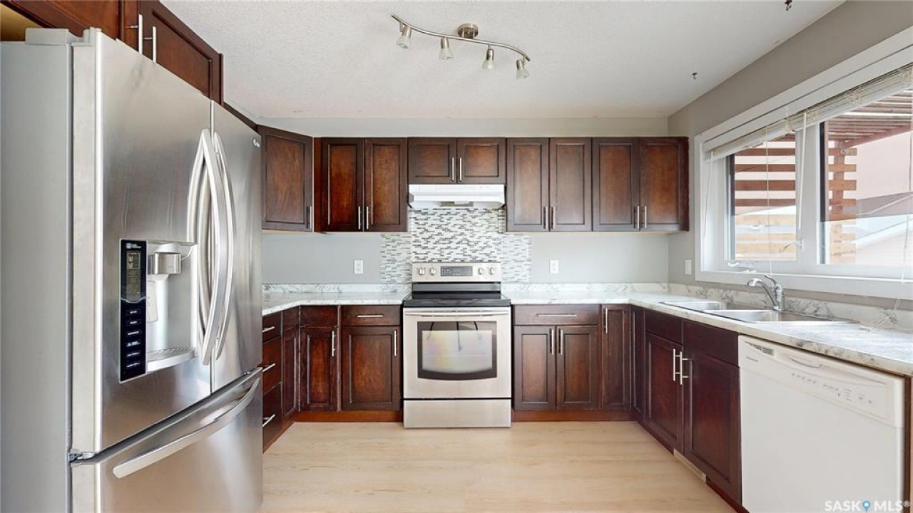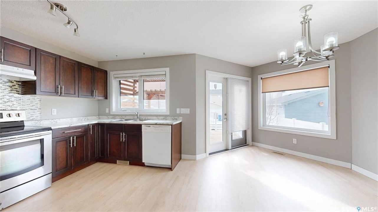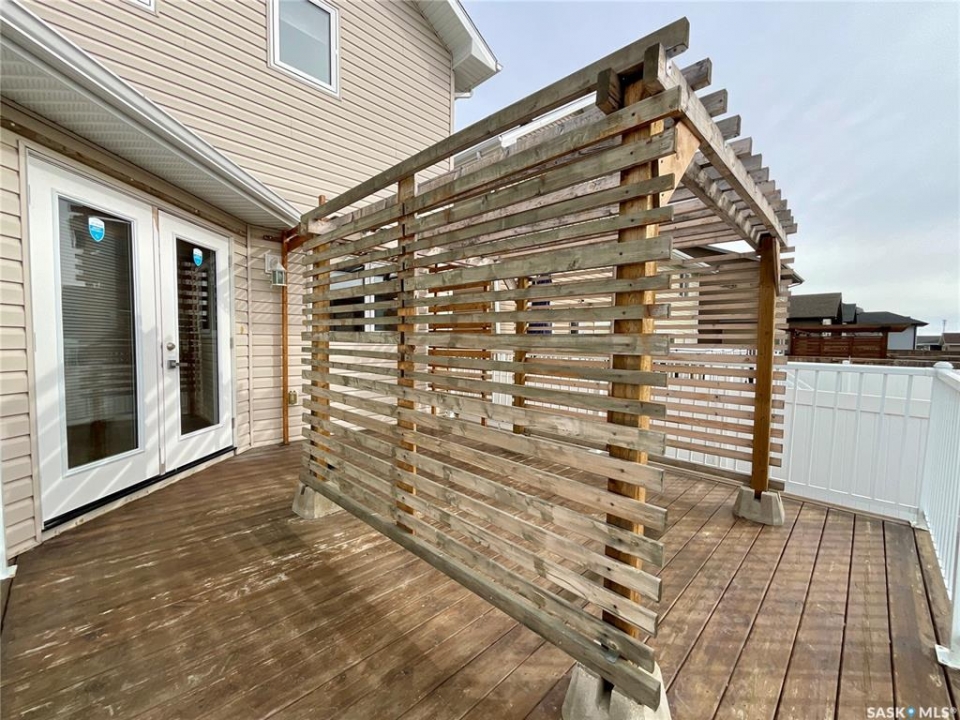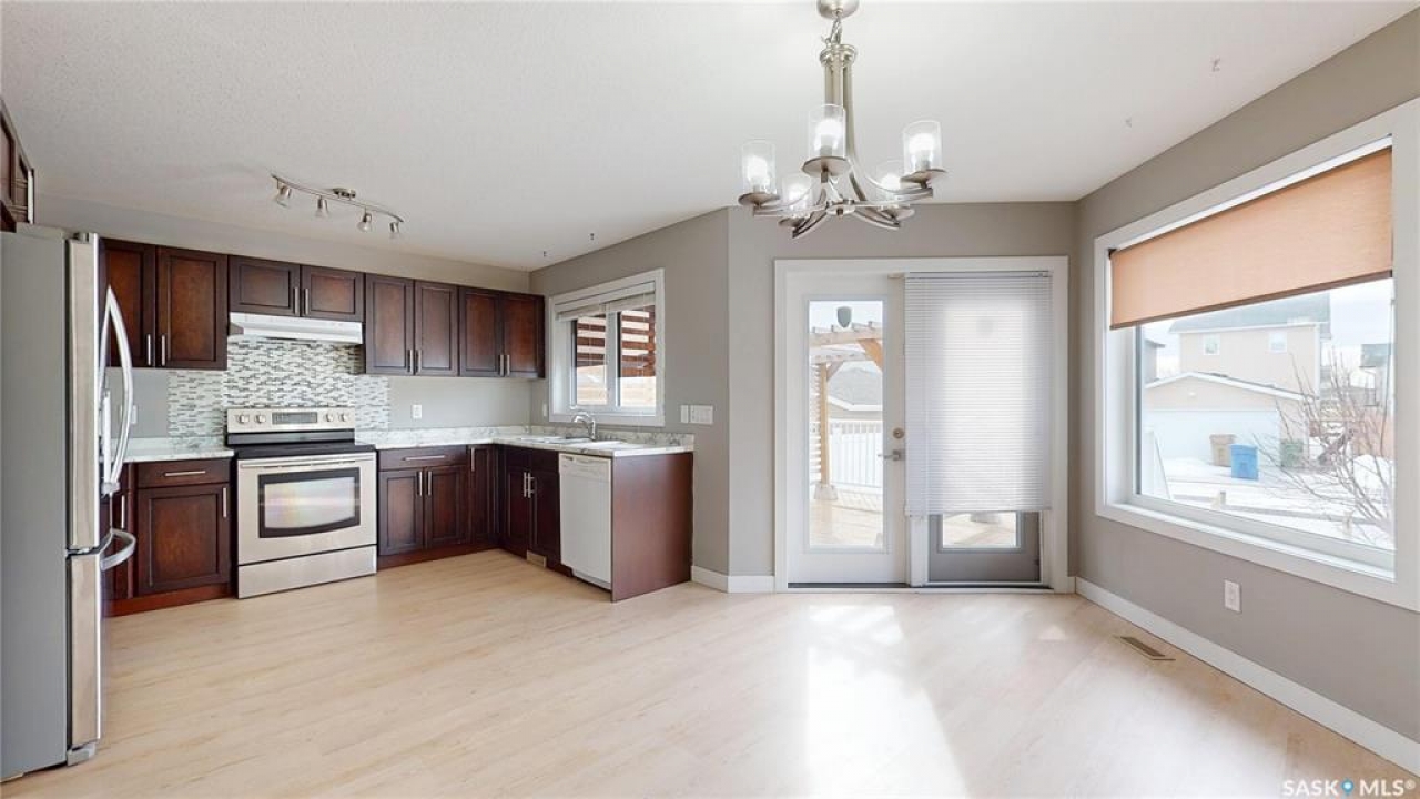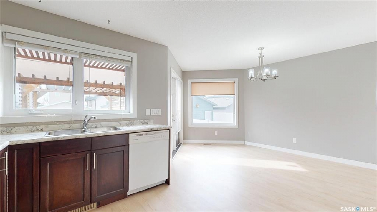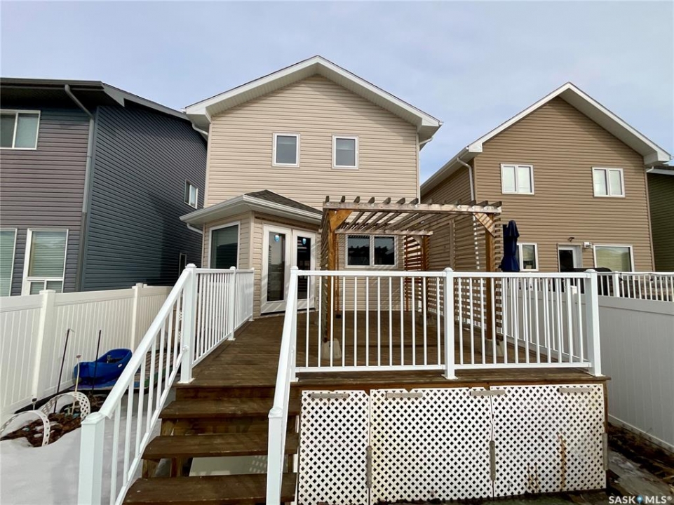 Welcome home to this beautiful 1,310 sq. ft. two-storey located in the highly desirable neighbourhood of Harbour Landing. Offering five bedrooms and four bathrooms, this home is perfect for growing families and those who love to entertain. Step inside to a bright, spacious living room with large windows and durable laminate flooring, creating a warm, inviting atmosphere. The kitchen is both functional and stylish, showcasing brown sugar maple cabinetry, ample cupboard space, a pantry, stainless steel appliances, and a generous dining area finished with luxury vinyl plank flooring. A convenient two-piece bathroom completes the main level. Upstairs, you'll find three great-sized bedrooms, including a primary suite with its own private four-piece ensuite and dual closets. An additional full bathroom provides comfort and convenience for the rest of the family. The fully finished basement adds even more living space, featuring two additional bedrooms, a bathroom with a shower, a storage room, and a laundry area. Outside, the beautifully landscaped yard is designed for enjoyment, complete with a deck and pergola, a fire pit area, and space to relax or entertain. A two-car concrete parking pad is already in place and ready for a future double garage. Located close to schools, parks, and all Harbour Landing amenities—including Norseman Park, shopping, restaurants, and more—this home offers both comfort and convenience. This is a perfect home, looking for the next perfect owner to call it home!
