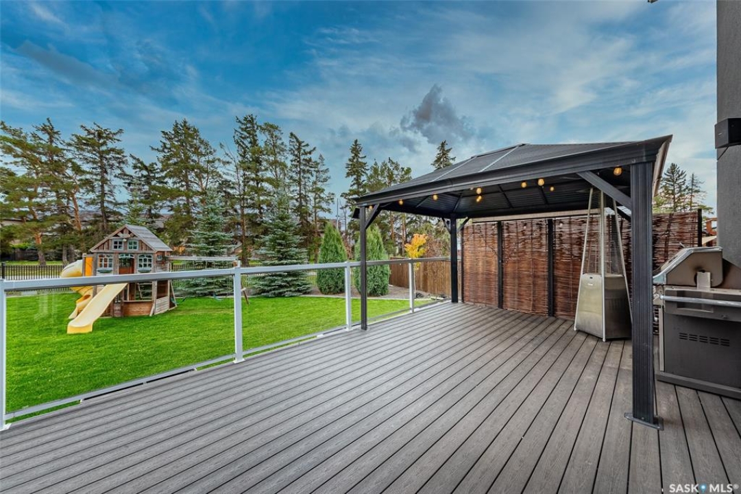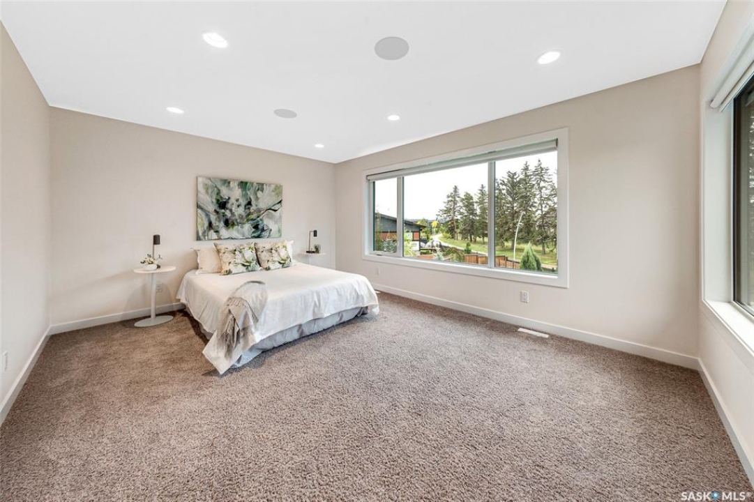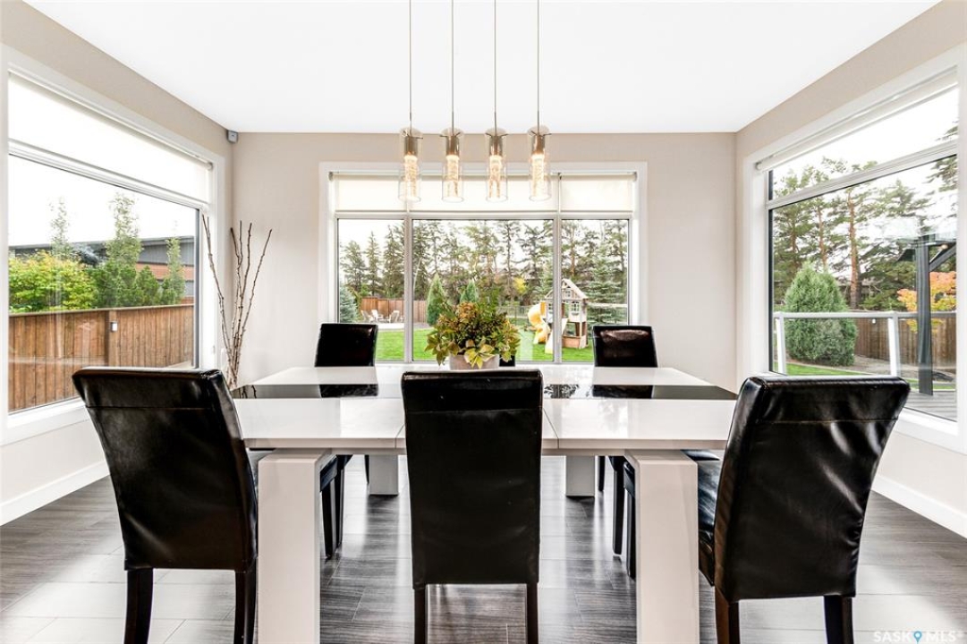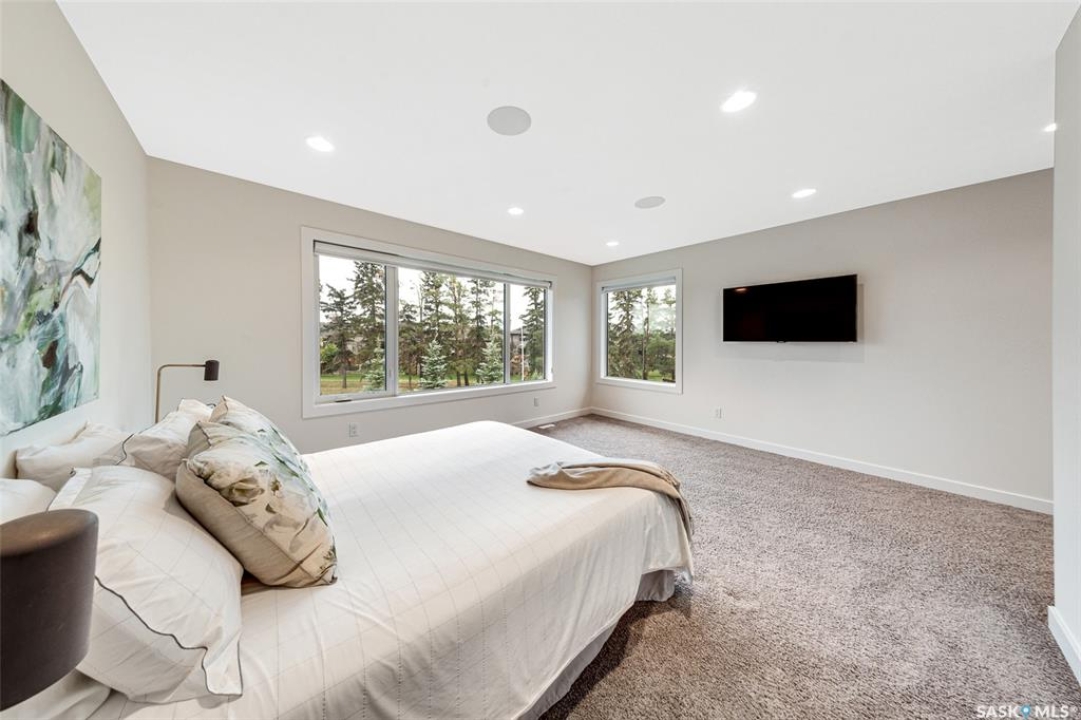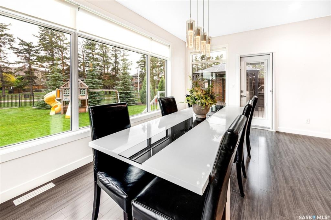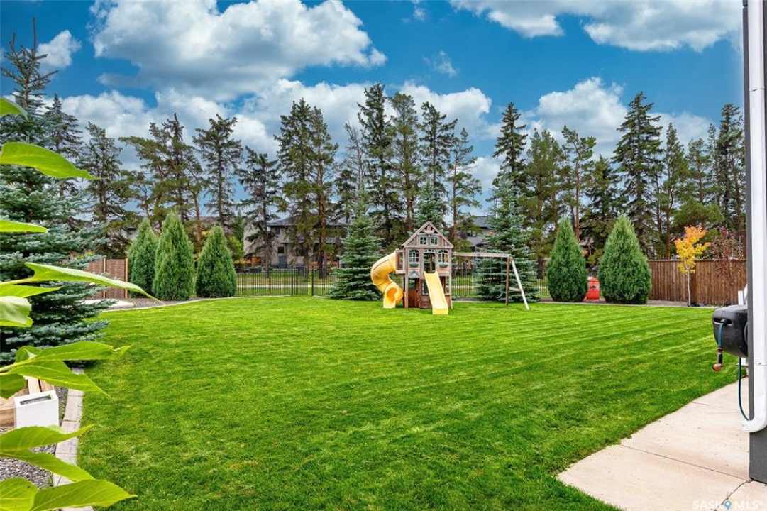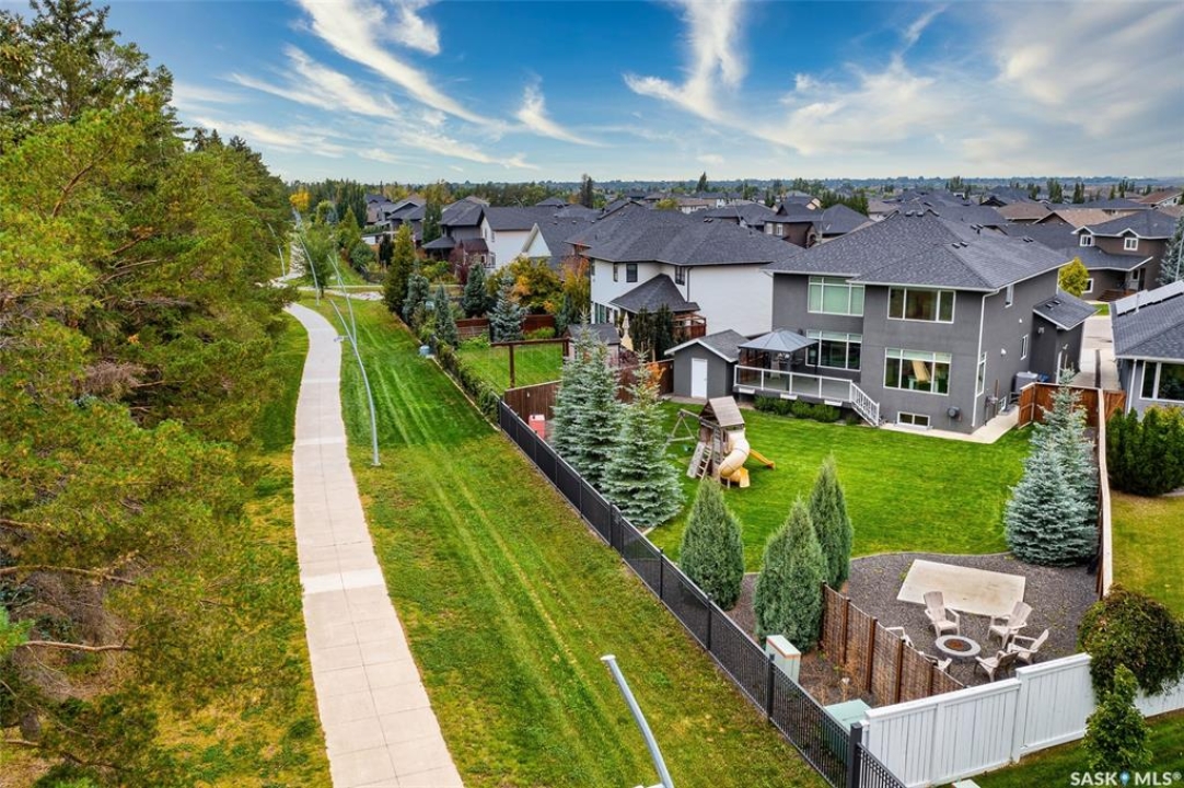 Tucked away on one of Evergreen's most desirable crescents, this exceptional two-storey home blends luxury, function, and timeless elegance on a massive pie-shaped lot backing the walking trails lined with mature Scots pine trees. From the striking curb appeal to the timeless finishes and extensive list of custom upgrades, every detail has been thoughtfully designed. Inside, a grand foyer leads into a living room with soaring ceilings and expansive windows that fill the space with natural light. At the heart of the home, the gourmet kitchen showcases Redl custom cabinetry, built-in Miele dual ovens with induction cooktop, quartz countertops, tile backsplash, and a large island with additional seating, seamlessly connected to the dining area overlooking the private backyard. The main floor also offers a dedicated office, a 2-piece bath, and a mudroom with direct access to the oversized heated staggered bay garage ( 28' x 22'/26') with 220v plug and hot/cold water taps. Upstairs, four spacious bedrooms await, including a luxurious primary suite with a custom walk-in closet and a spa-inspired ensuite featuring a jetted tub and steam shower—the perfect retreat after a long day. A full bathroom and convenient second-floor laundry complete this level. The fully developed basement adds versatility with a large family room and games area, a fifth bedroom, 4-piece bath, storage, mechanical room, and a future wet bar nook. Notable extras include central AC, HRV, HEPA air filter, “hide-a-hose” central vac, Control4 audio with built-in speakers throughout, and more. Outside, the expansive backyard offers endless potential for entertaining, a future pool, or simply enjoying the serenity of your private outdoor escape. Ideally situated near the Forestry Farm and zoo, an array of amenities, school bus pick up, elementary and high schools, this rare property offers the perfect balance of comfort and lifestyle in one of Saskatoon's most coveted neighbourhoods.