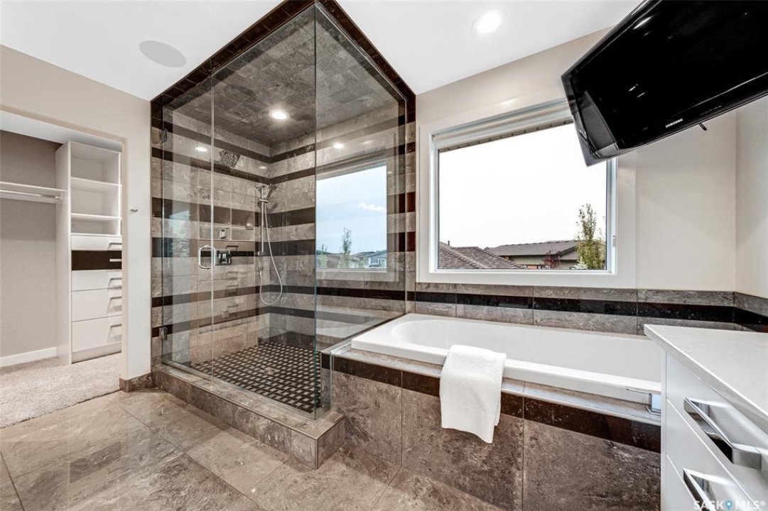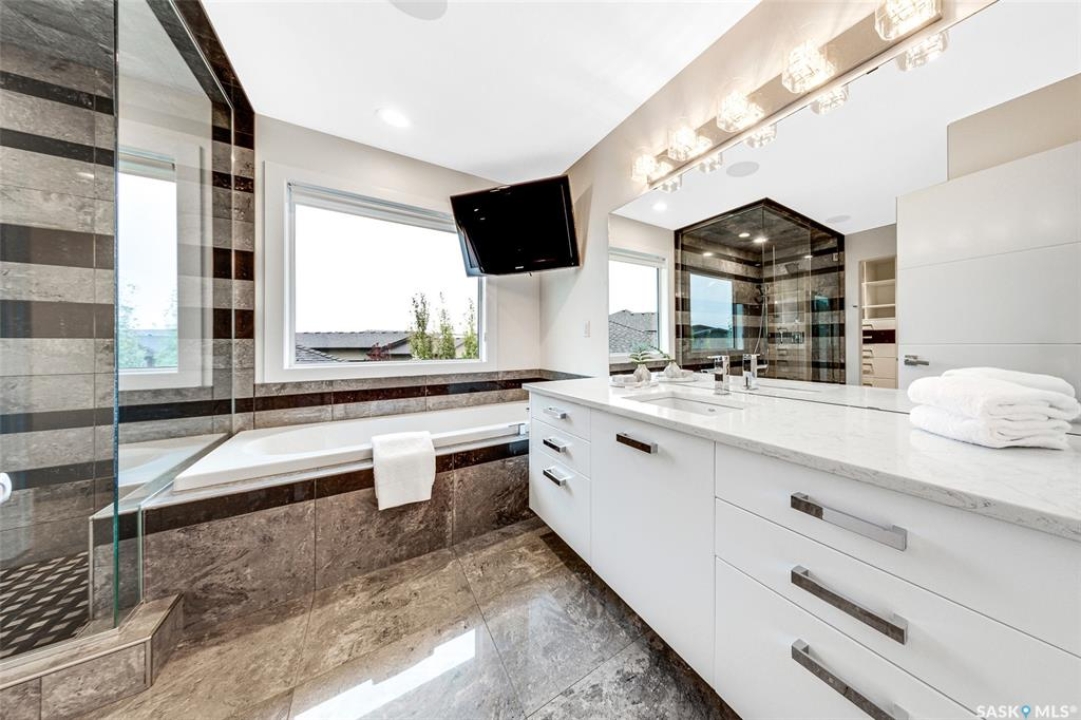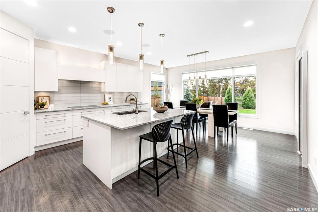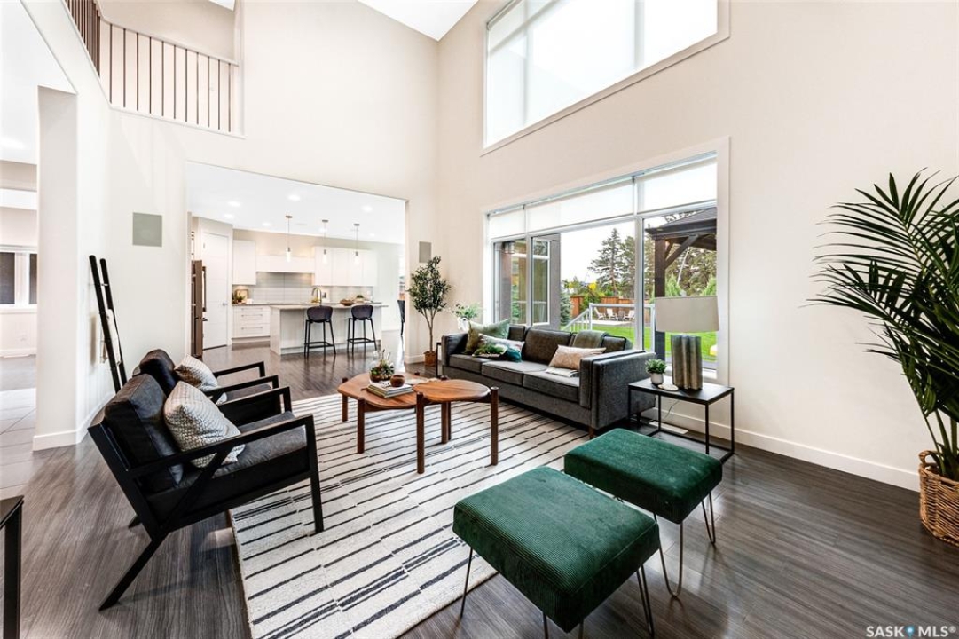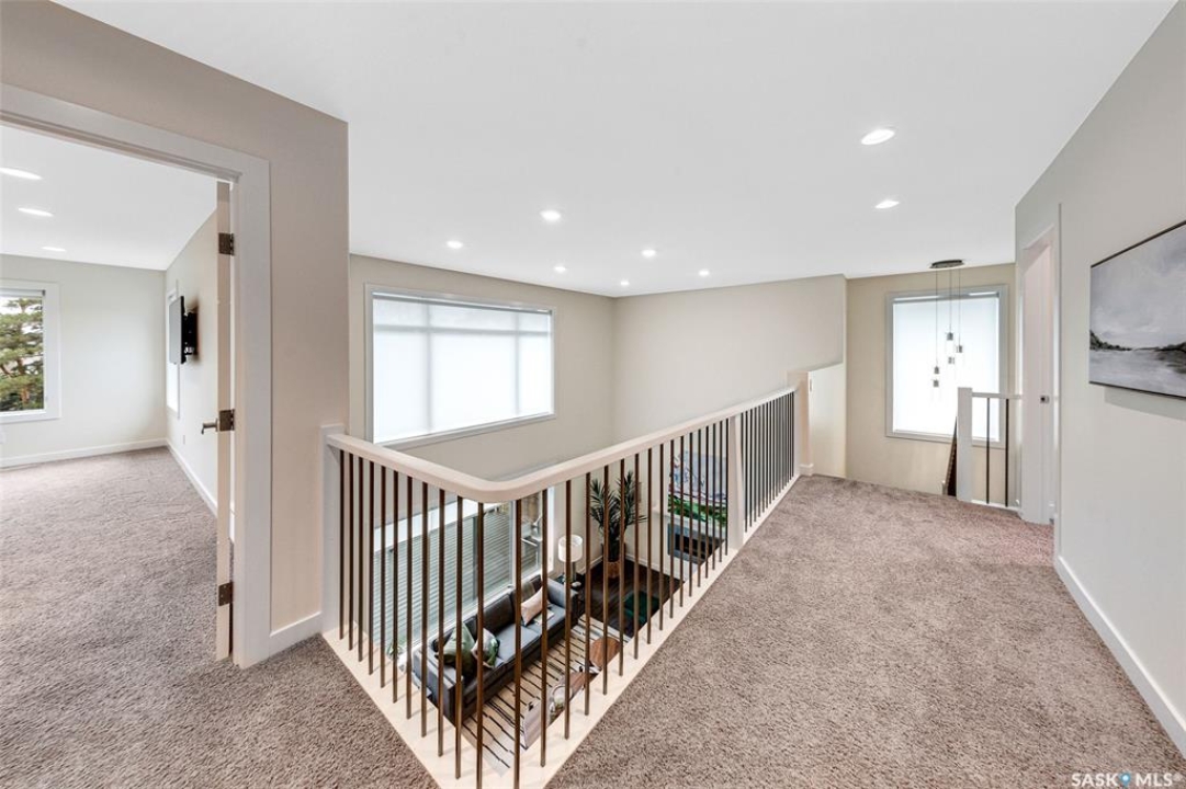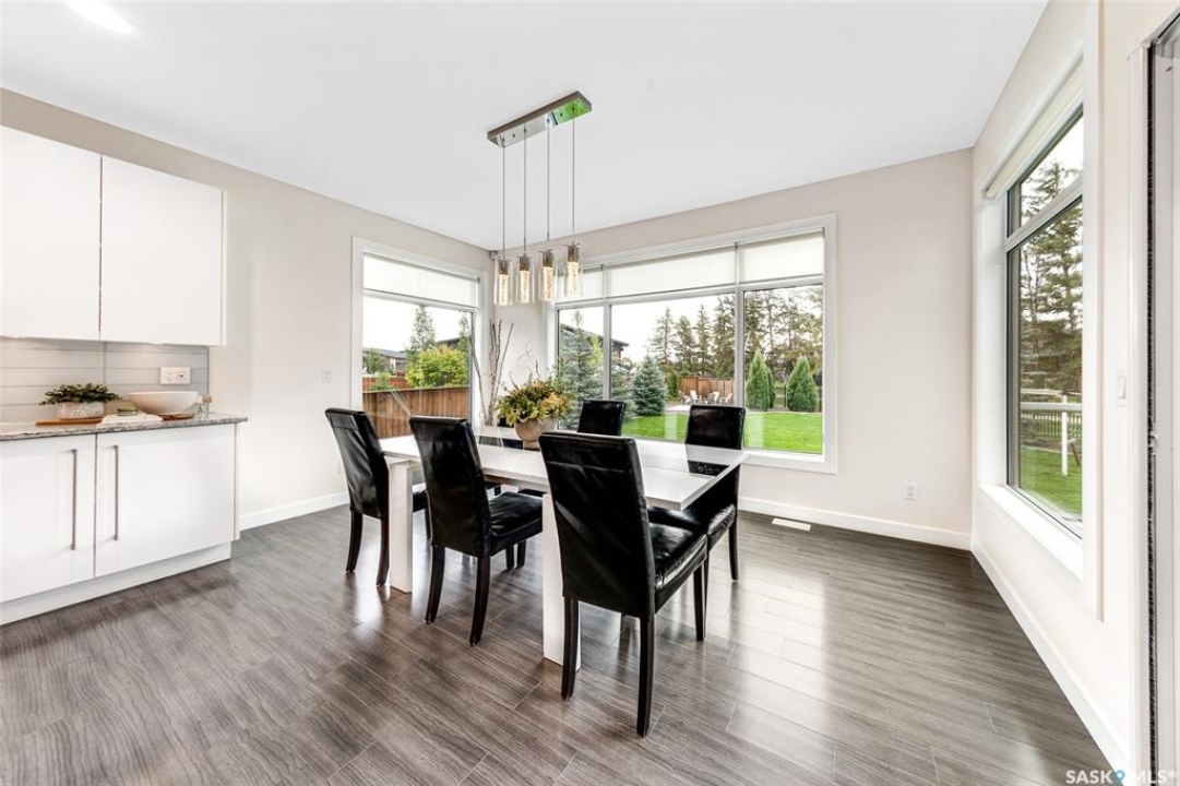 Tucked away on one of Evergreen's most desirable crescents, this exceptional two-storey home blends luxury, function, and timeless elegance on a massive pie-shaped lot backing the walking trails lined with mature Scots pine trees. From the striking curb appeal to the timeless finishes and extensive list of custom upgrades, every detail has been thoughtfully designed. Inside, a grand foyer leads into a living room with soaring ceilings and expansive windows that fill the space with natural light. At the heart of the home, the gourmet kitchen showcases Redl custom cabinetry, built-in Miele dual ovens with induction cooktop, quartz countertops, tile backsplash, and a large island with additional seating, seamlessly connected to the dining area overlooking the private backyard. The main floor also offers a dedicated office, a 2-piece bath, and a mudroom with direct access to the oversized heated staggered bay garage ( 28' x 22'/26') with 220v plug and hot/cold water taps. Upstairs, four spacious bedrooms await, including a luxurious primary suite with a custom walk-in closet and a spa-inspired ensuite featuring a jetted tub and steam shower—the perfect retreat after a long day. A full bathroom and convenient second-floor laundry complete this level. The fully developed basement adds versatility with a large family room and games area, a fifth bedroom, 4-piece bath, storage, mechanical room, and a future wet bar nook. Notable extras include central AC, HRV, HEPA air filter, “hide-a-hose” central vac, Control4 audio with built-in speakers throughout, and more. Outside, the expansive backyard offers endless potential for entertaining, a future pool, or simply enjoying the serenity of your private outdoor escape. Ideally situated near the Forestry Farm and zoo, an array of amenities, school bus pick up, elementary and high schools, this rare property offers the perfect balance of comfort and lifestyle in one of Saskatoon's most coveted neighbourhoods.