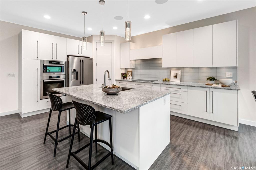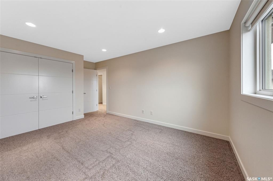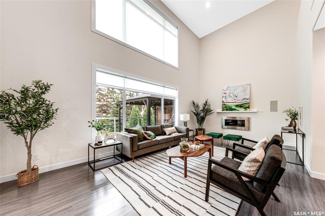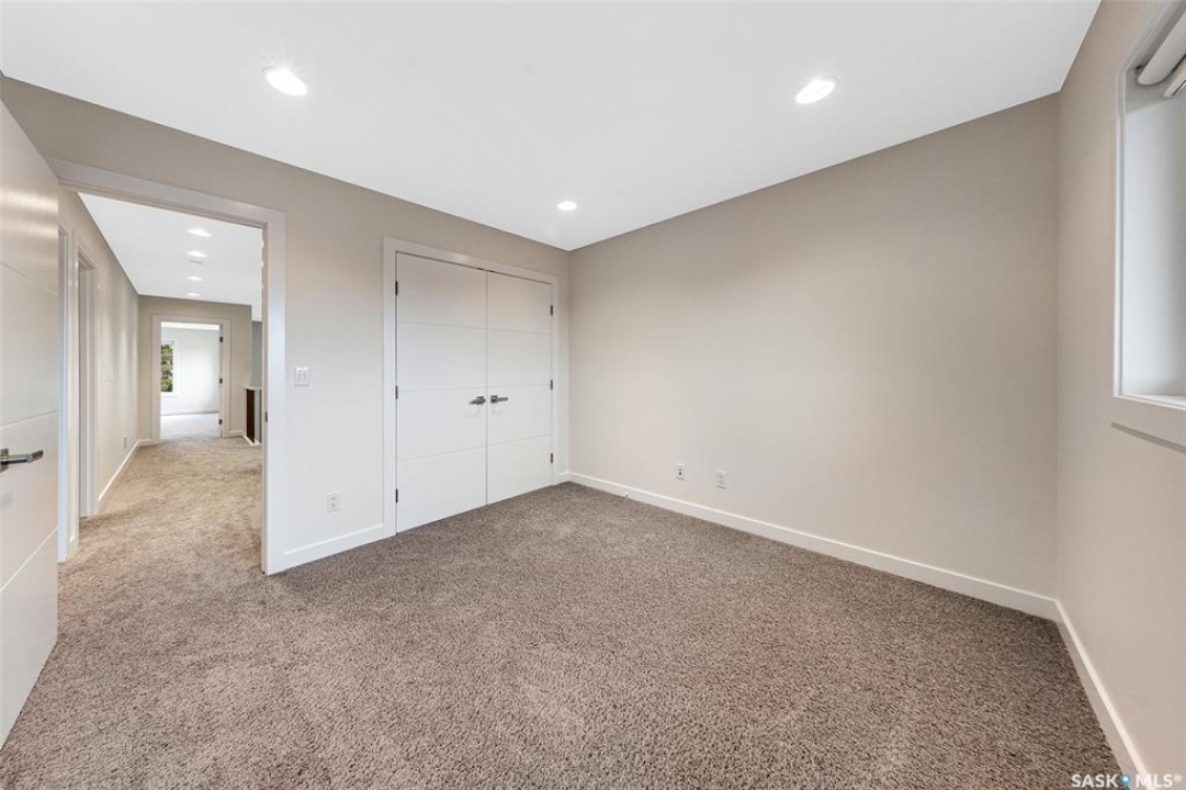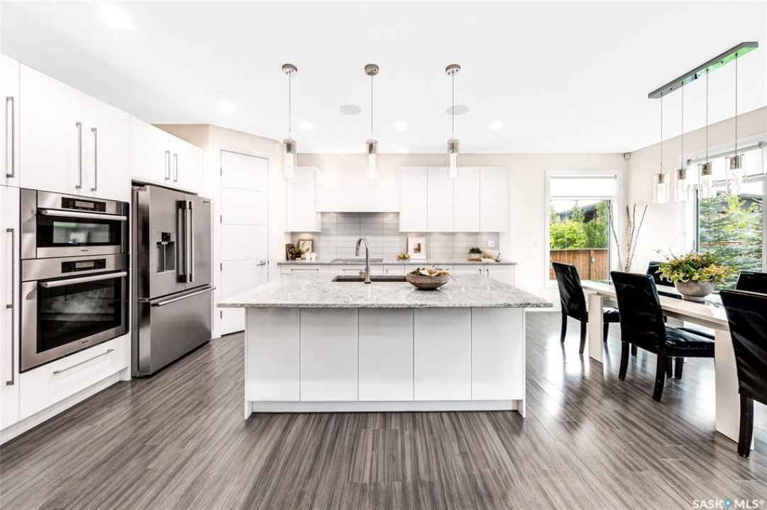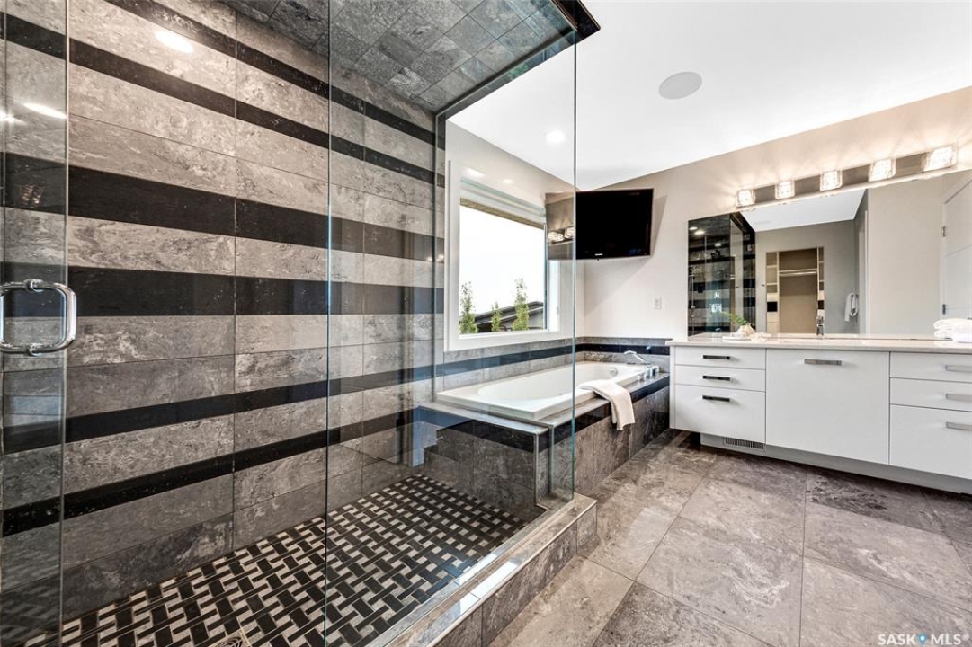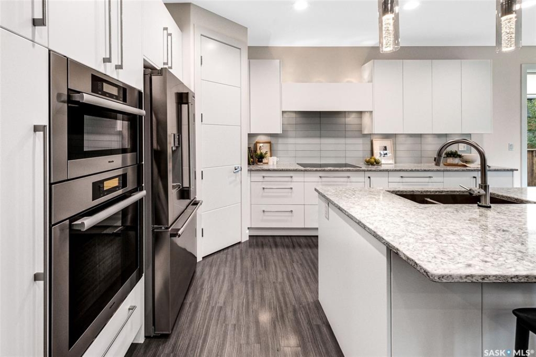 Tucked away on one of Evergreen's most desirable crescents, this exceptional two-storey home blends luxury, function, and timeless elegance on a massive pie-shaped lot backing the walking trails lined with mature Scots pine trees. From the striking curb appeal to the timeless finishes and extensive list of custom upgrades, every detail has been thoughtfully designed. Inside, a grand foyer leads into a living room with soaring ceilings and expansive windows that fill the space with natural light. At the heart of the home, the gourmet kitchen showcases Redl custom cabinetry, built-in Miele dual ovens with induction cooktop, quartz countertops, tile backsplash, and a large island with additional seating, seamlessly connected to the dining area overlooking the private backyard. The main floor also offers a dedicated office, a 2-piece bath, and a mudroom with direct access to the oversized heated staggered bay garage ( 28' x 22'/26') with 220v plug and hot/cold water taps. Upstairs, four spacious bedrooms await, including a luxurious primary suite with a custom walk-in closet and a spa-inspired ensuite featuring a jetted tub and steam shower—the perfect retreat after a long day. A full bathroom and convenient second-floor laundry complete this level. The fully developed basement adds versatility with a large family room and games area, a fifth bedroom, 4-piece bath, storage, mechanical room, and a future wet bar nook. Notable extras include central AC, HRV, HEPA air filter, “hide-a-hose” central vac, Control4 audio with built-in speakers throughout, and more. Outside, the expansive backyard offers endless potential for entertaining, a future pool, or simply enjoying the serenity of your private outdoor escape. Ideally situated near the Forestry Farm and zoo, an array of amenities, school bus pick up, elementary and high schools, this rare property offers the perfect balance of comfort and lifestyle in one of Saskatoon's most coveted neighbourhoods.