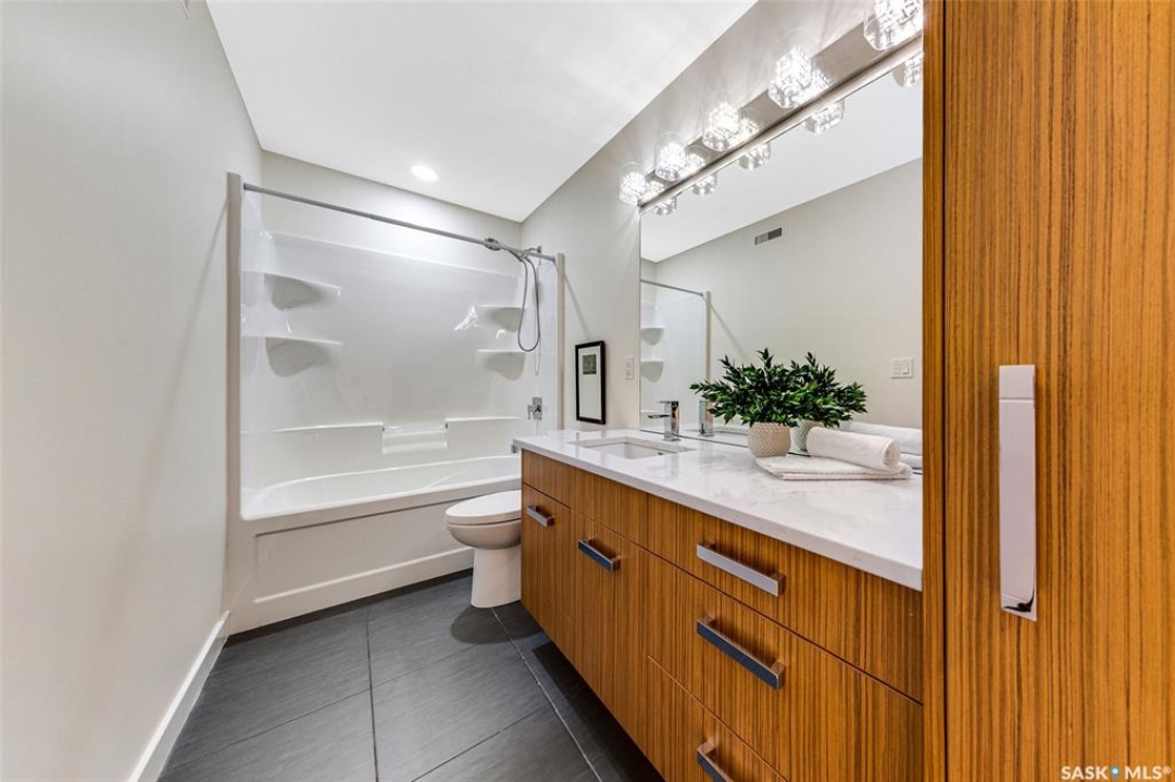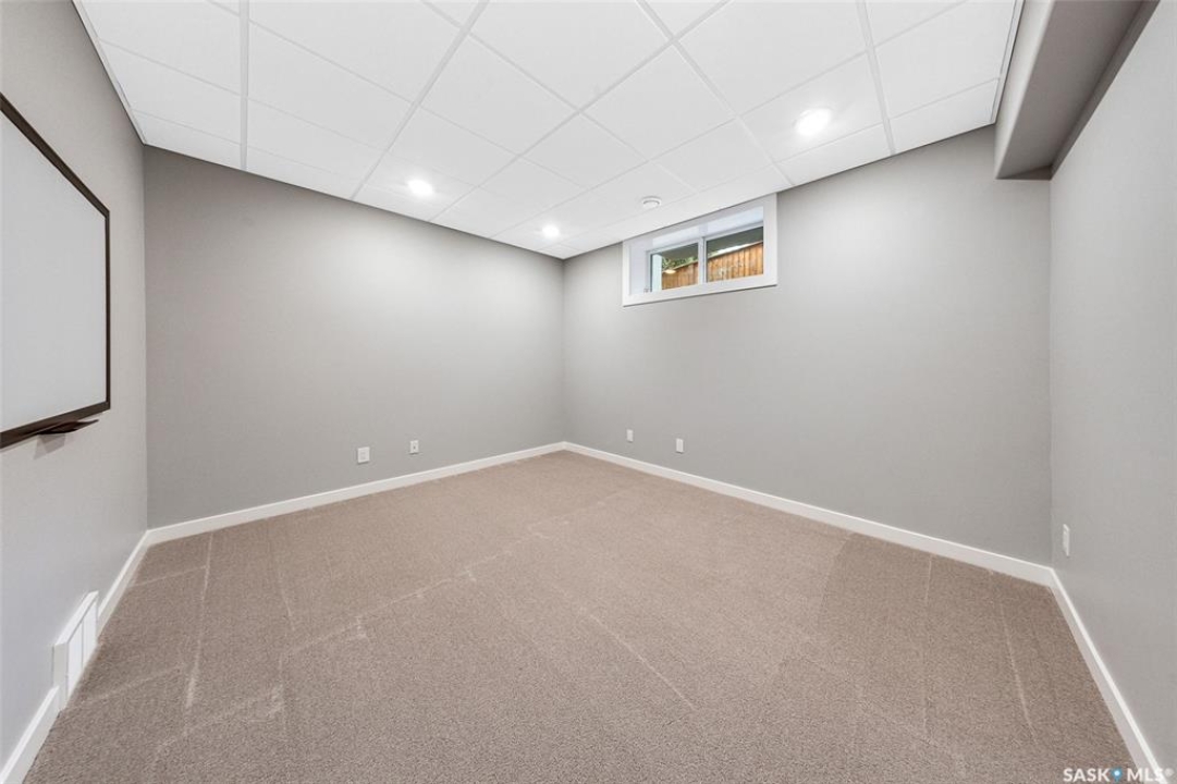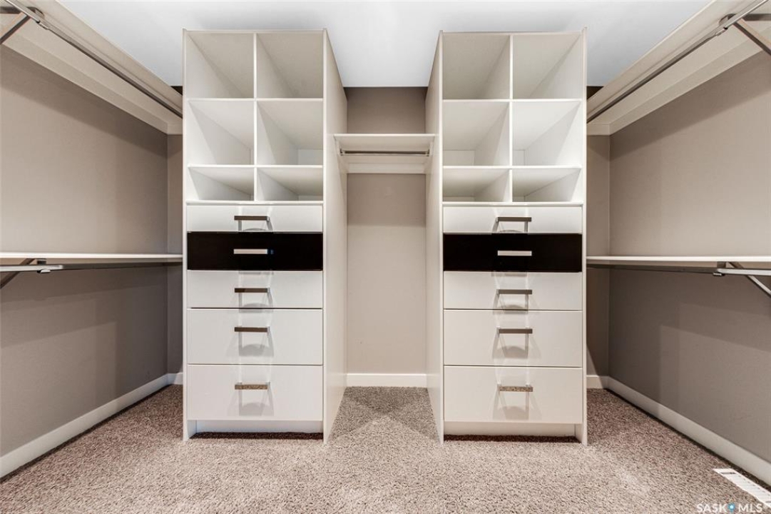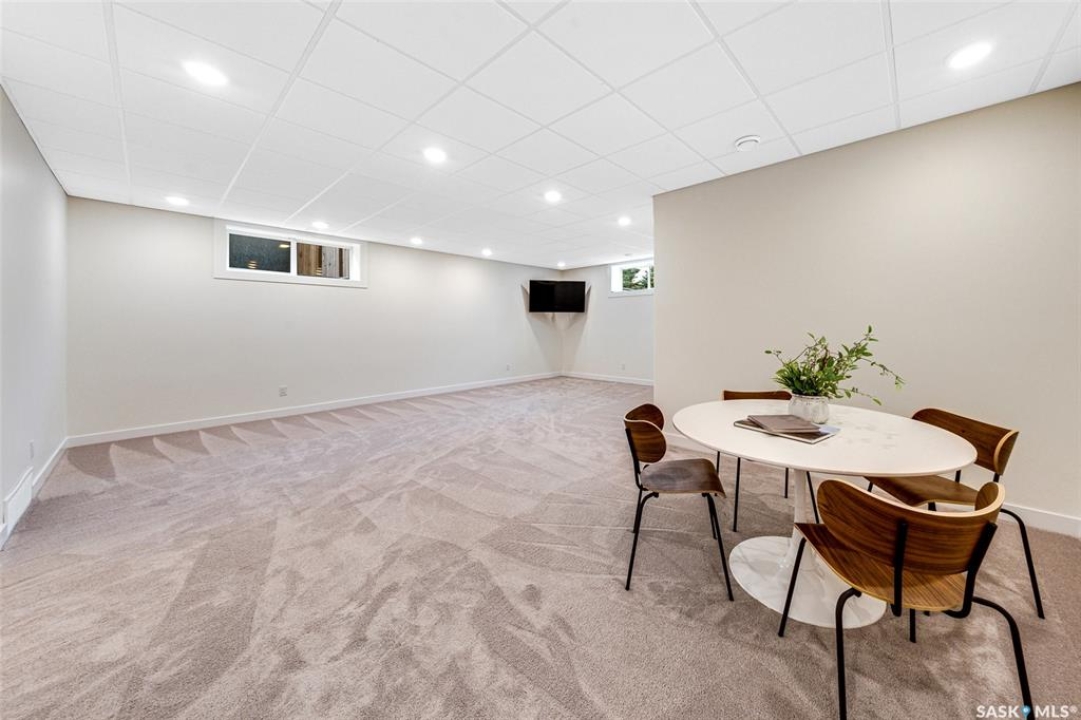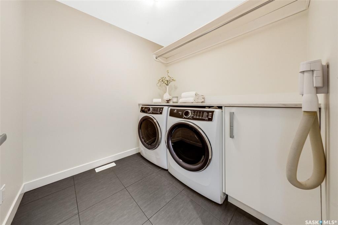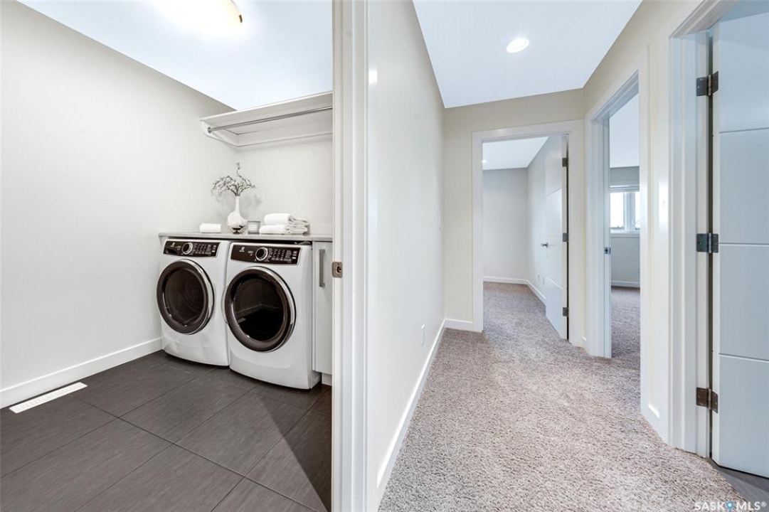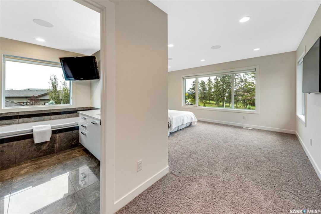Tucked away on one of Evergreen's most desirable crescents, this exceptional two-storey home blends luxury, function, and timeless elegance on a massive pie-shaped lot backing the walking trails lined with mature Scots pine trees. From the striking curb appeal to the timeless finishes and extensive list of custom upgrades, every detail has been thoughtfully designed. Inside, a grand foyer leads into a living room with soaring ceilings and expansive windows that fill the space with natural light. At the heart of the home, the gourmet kitchen showcases Redl custom cabinetry, built-in Miele dual ovens with induction cooktop, quartz countertops, tile backsplash, and a large island with additional seating, seamlessly connected to the dining area overlooking the private backyard. The main floor also offers a dedicated office, a 2-piece bath, and a mudroom with direct access to the oversized heated staggered bay garage ( 28' x 22'/26') with 220v plug and hot/cold water taps. Upstairs, four spacious bedrooms await, including a luxurious primary suite with a custom walk-in closet and a spa-inspired ensuite featuring a jetted tub and steam shower—the perfect retreat after a long day. A full bathroom and convenient second-floor laundry complete this level. The fully developed basement adds versatility with a large family room and games area, a fifth bedroom, 4-piece bath, storage, mechanical room, and a future wet bar nook. Notable extras include central AC, HRV, HEPA air filter, “hide-a-hose” central vac, Control4 audio with built-in speakers throughout, and more. Outside, the expansive backyard offers endless potential for entertaining, a future pool, or simply enjoying the serenity of your private outdoor escape. Ideally situated near the Forestry Farm and zoo, an array of amenities, school bus pick up, elementary and high schools, this rare property offers the perfect balance of comfort and lifestyle in one of Saskatoon's most coveted neighbourhoods.