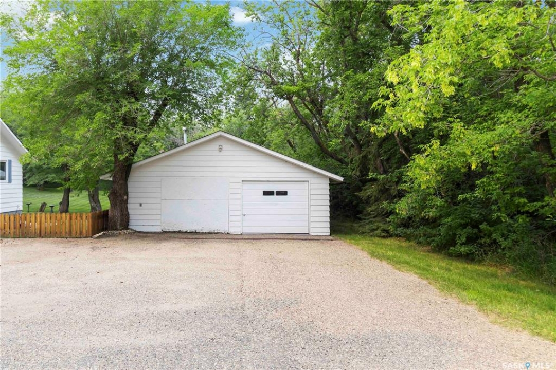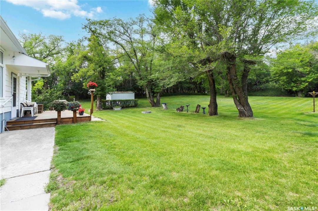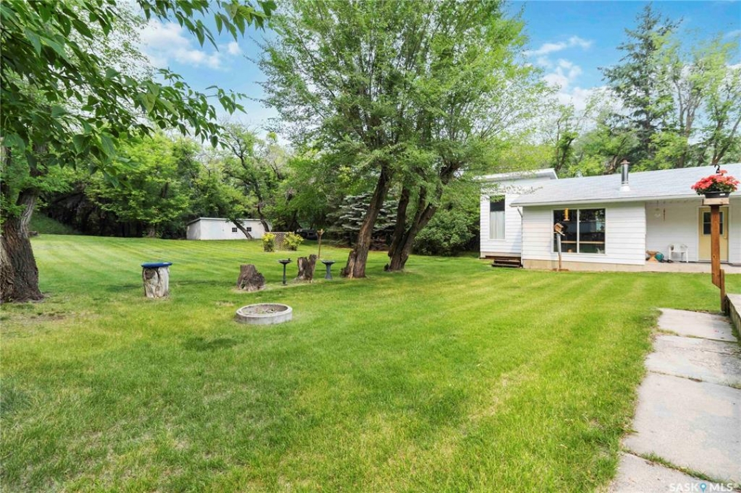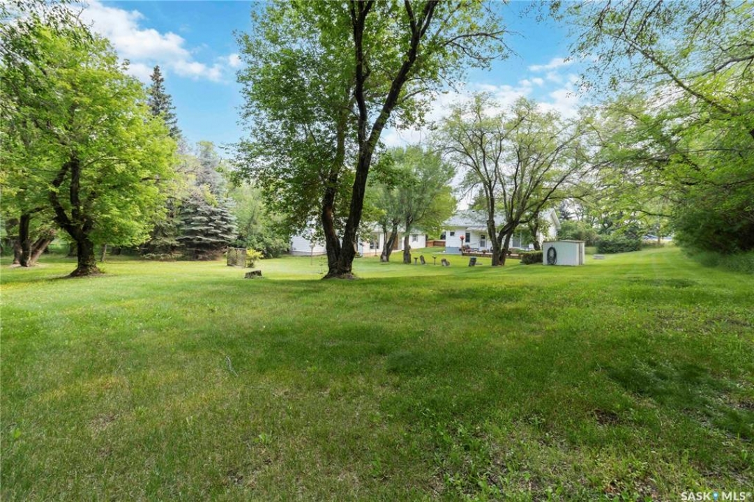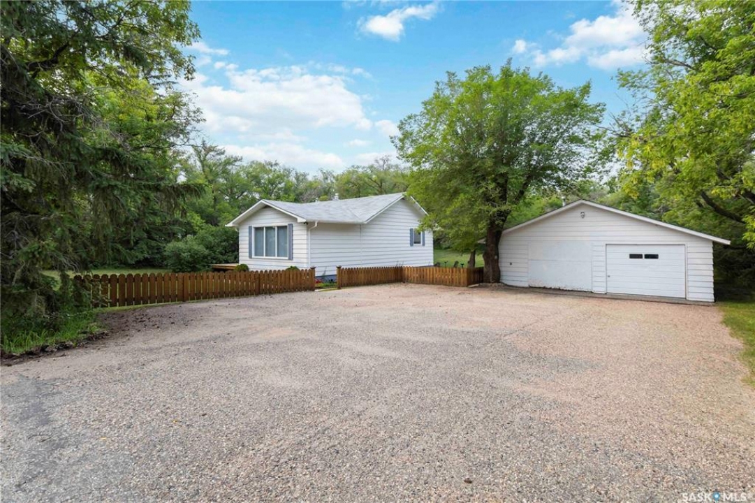 Beautifully treed acreage just minutes from city limits with pavement to the door! This well-maintained bungalow offers 3 bedrooms, 2 bathrooms, and a functional layout with room to make it your own. Recent upgrades include newer windows, brand new shingles on the house and shed (2025), and freshly painted exterior (2025). Serviced with city water to both the home and detached studio, plus two additional wells for added flexibility. The 748 sq ft detached studio is a standout feature—bright and inviting with natural light, gas furnace, water, and dedicated office space. Ideal for a home-based business, creative studio, or potential future garden suite. Double detached garage includes a heated workshop on one side and separate parking stall on the other. Mature landscaping, established trees, and flower beds create a private, peaceful setting. 300 sq ft shed with 30-amp service is perfect for animals or storage. With future subdivision potential and planned sewer infrastructure in the area, this property offers excellent long-term value. A rare opportunity for acreage living just minutes from the city!