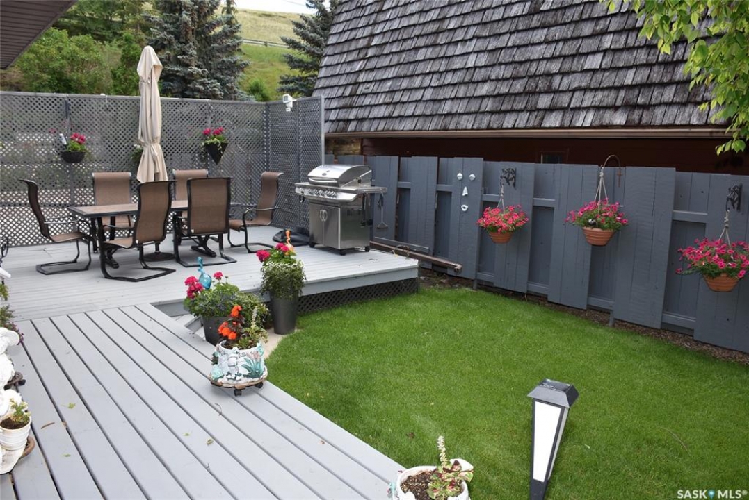 Outdoor: Deck, Firepit, Garden Area, Lawn Front, Partially Fenced, Patio, Trees/shrubs